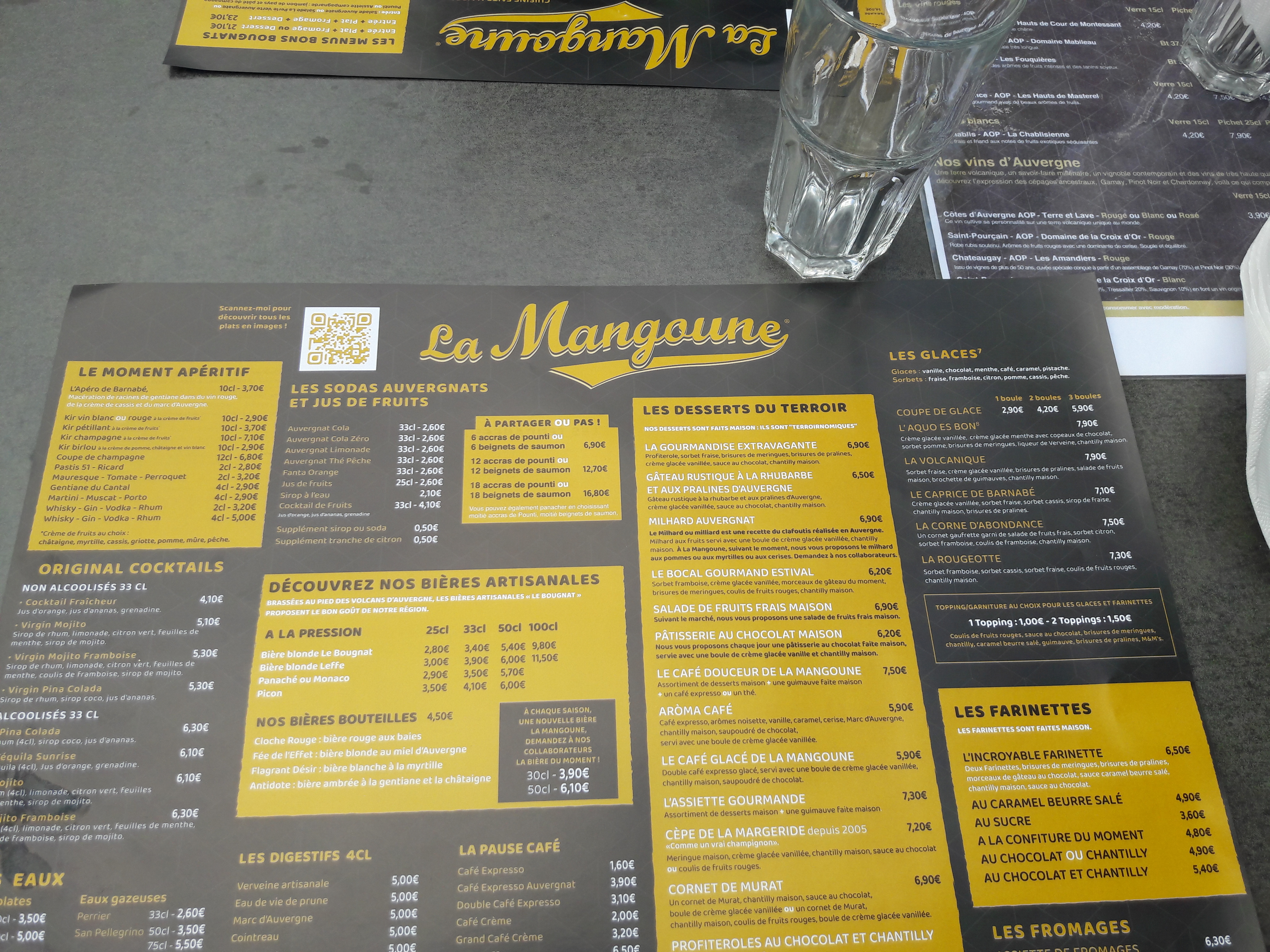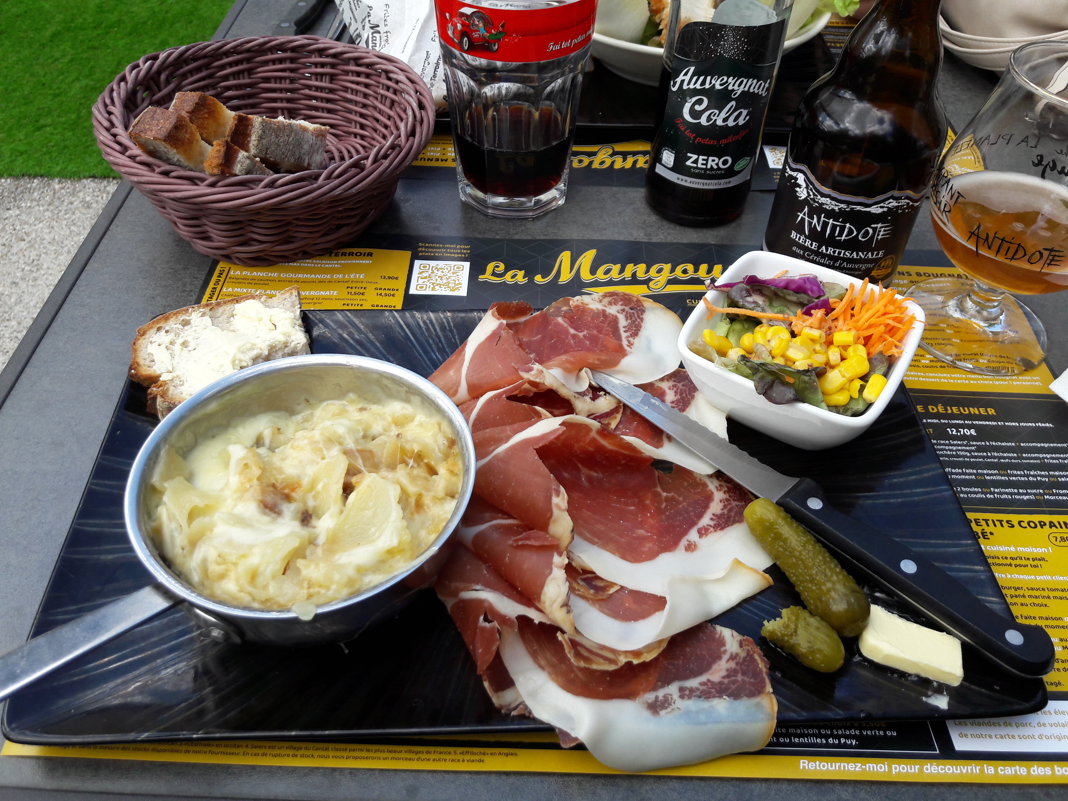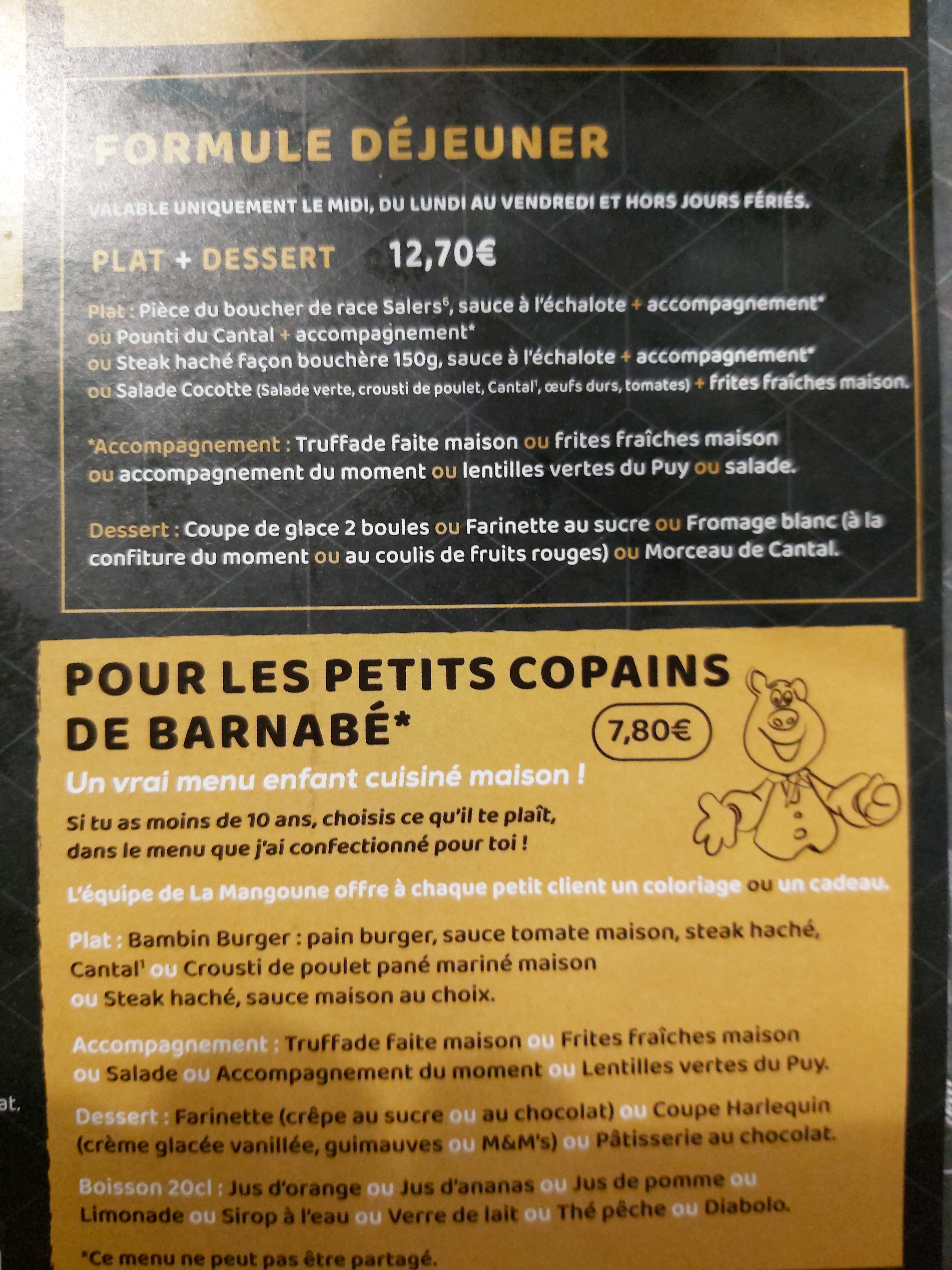 Bonne soirée à la Mangoune. J’avais pris du pounti dans lequel j’aurais aimé trouver des morceaux de feuilles de blette et un peu moins de coloration au réchauffage Sinon l’éffiloché de paleron délicieux et très tendre. Et les profiteroles très bonnes ! Merci pour l’accueil.