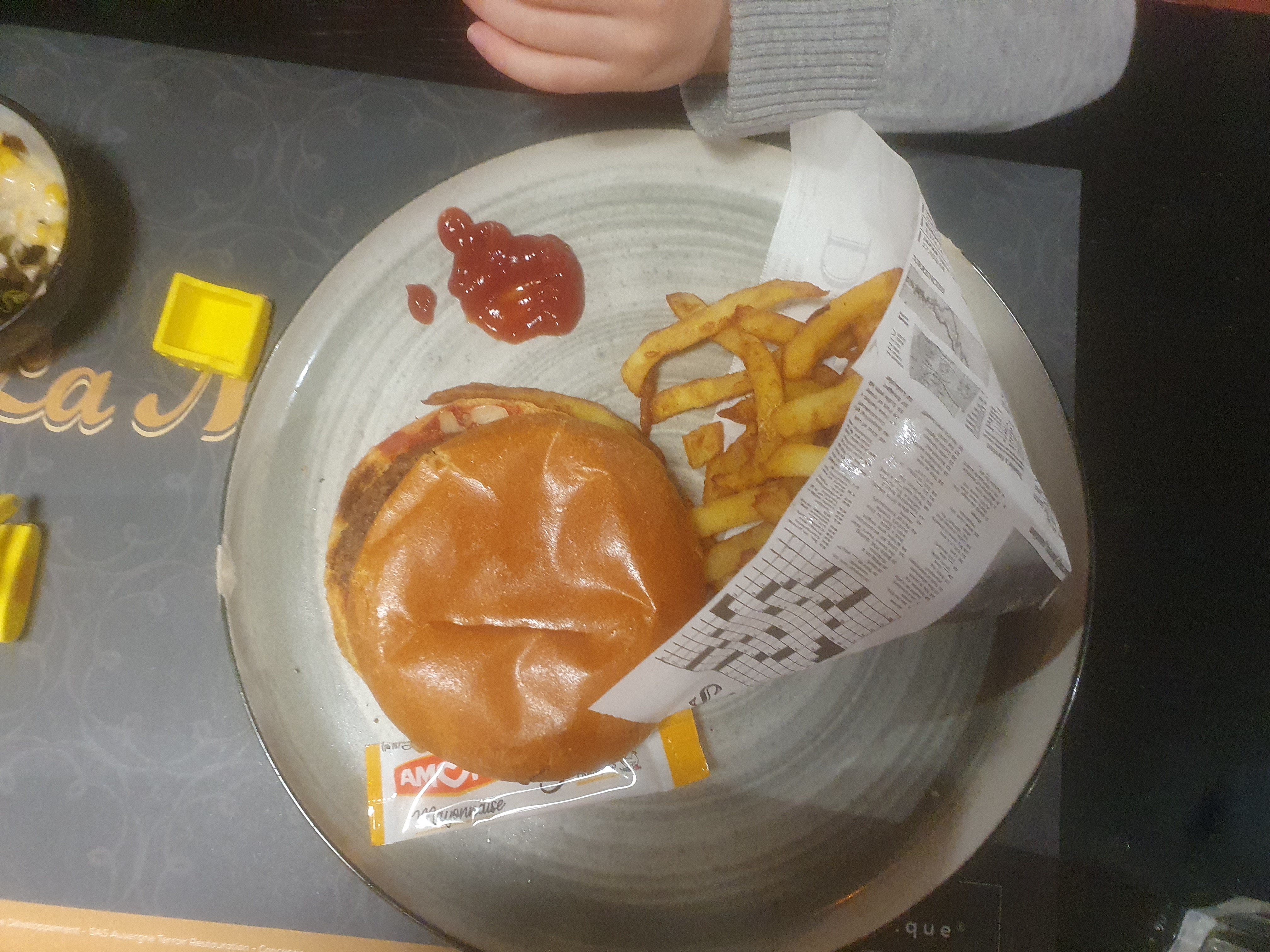 Bonjour, je ne sais même pas par où commencer tellement il y a de point négatif.. Le menu enfant (poulet) immangeable. Mon enfant a eu la diarrhée aussitôt après son repas. Ses frites était pas cuite et trop cramé. Même les fast food font mieux. Il y avait un cheveux brun dans ma « tartiflette », la table à côté de la fenêtre à éviter car il y avait un courant d’air froid, très désagréable en mangeant. Les étiquettes des verres de coca sont décollés par l’usure. Vraiment très déçu, vous ne me reverrez pas et je ne vous conseillerais pas ! Y’a un minimum quand même !