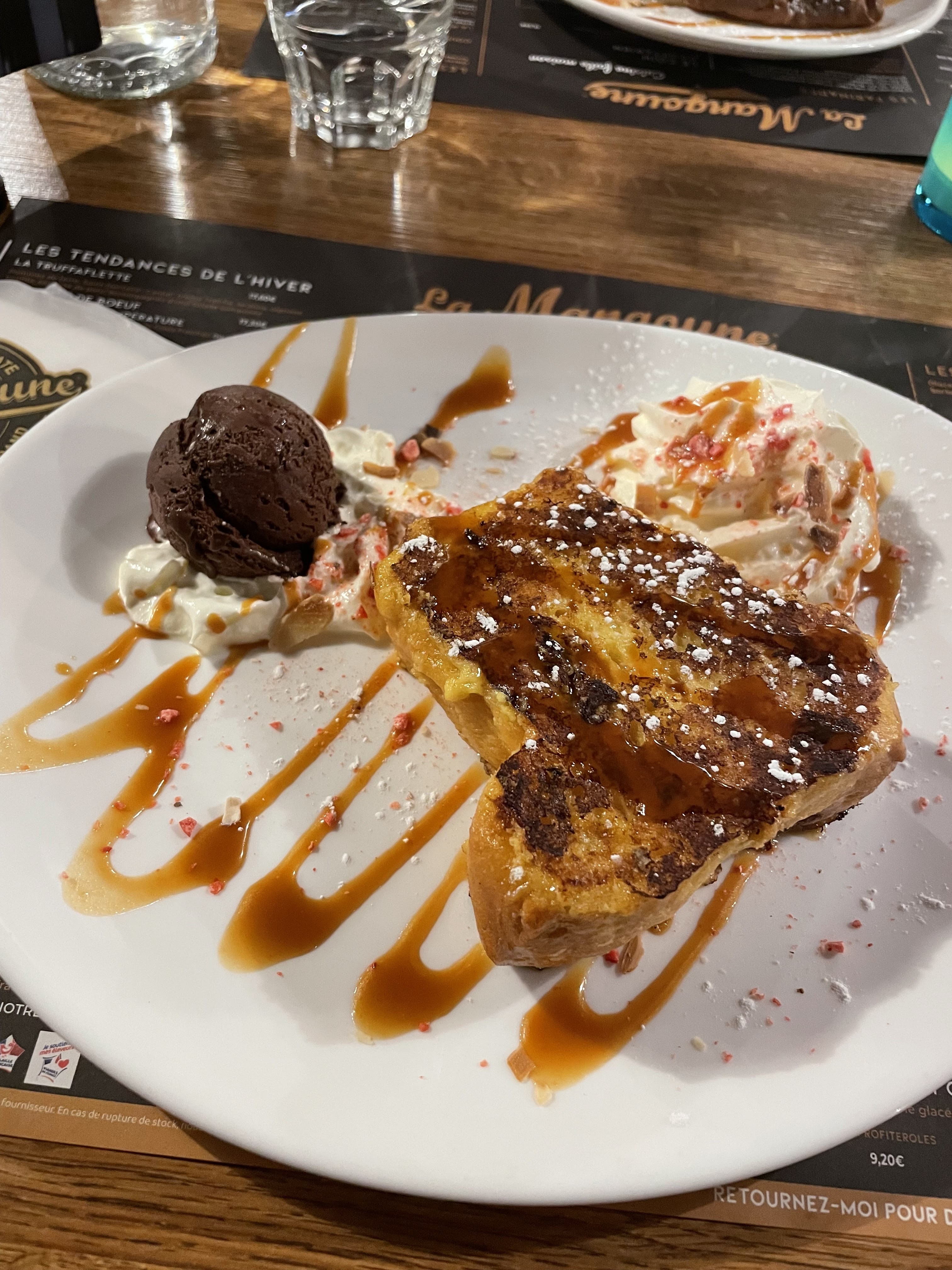 Ça pete. Pas de mine mais le cadre est Agréable style savoyard. Menu à 21 euros. Copieux comme il faut. Je passe au dessert. Car j’ai plus. Faim . C’est la première fois que je rentre ici au restaurant la mangoune