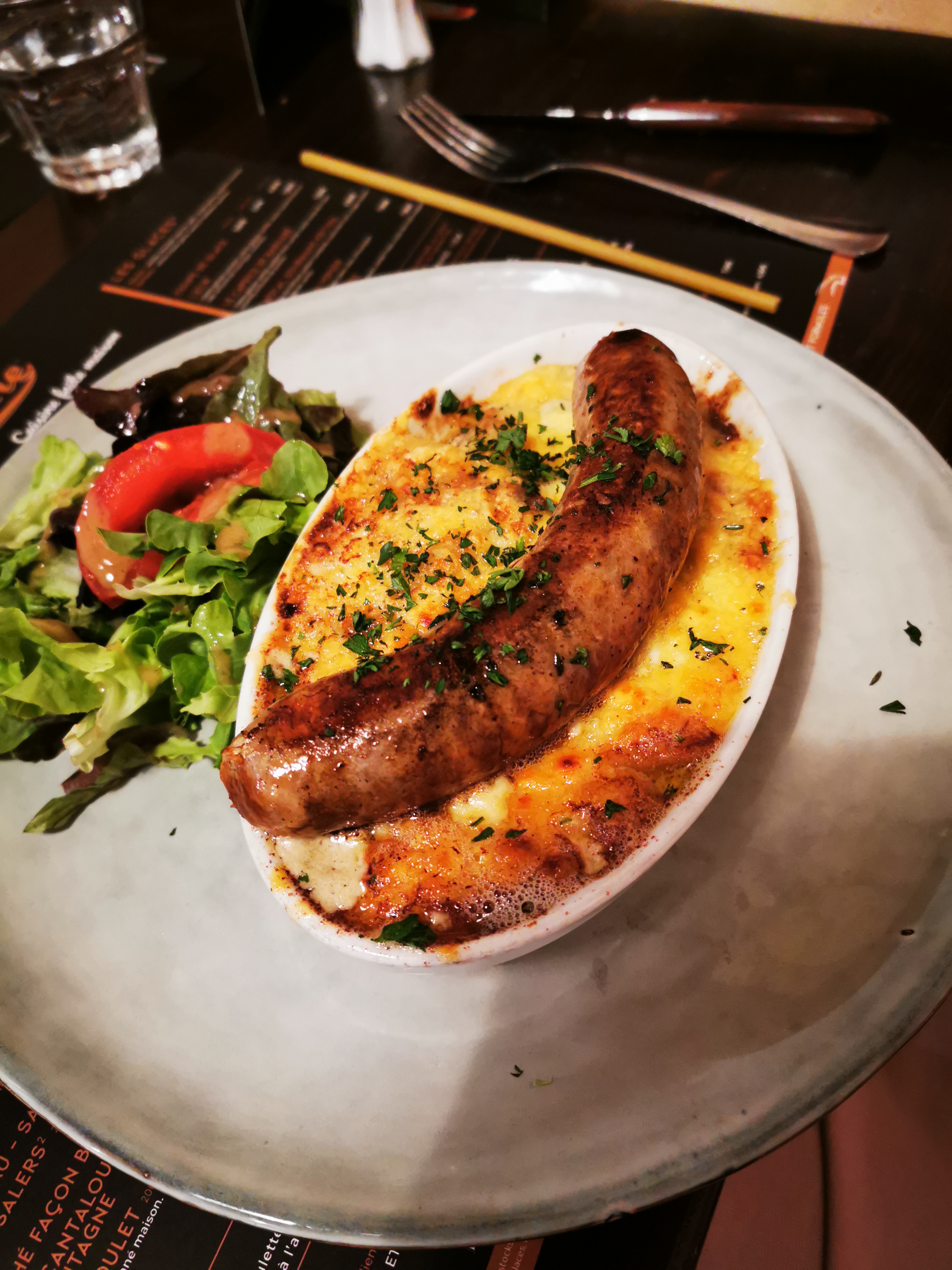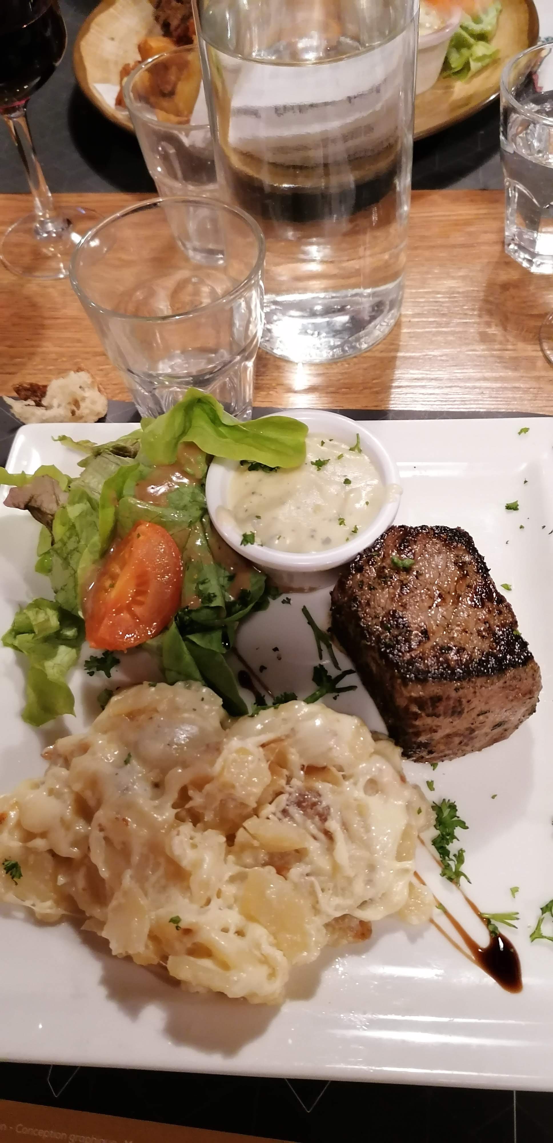 Soirée en amoureux, entrées très bonnes, entrecote pour moi et cuisse de canard pour ma femme accompagné de truffade. Desserts très bons. Petit bémol, la serveuse n était pas très aimable. L entrecôte était vraiment très bonne. La truffade était délicieuse. Les légumes et féculents ne sont pas à volonté. Le dessert était très bon pour ma part c était une pomme au four accompagné de sorbet pomme et caramel au beurre salé.