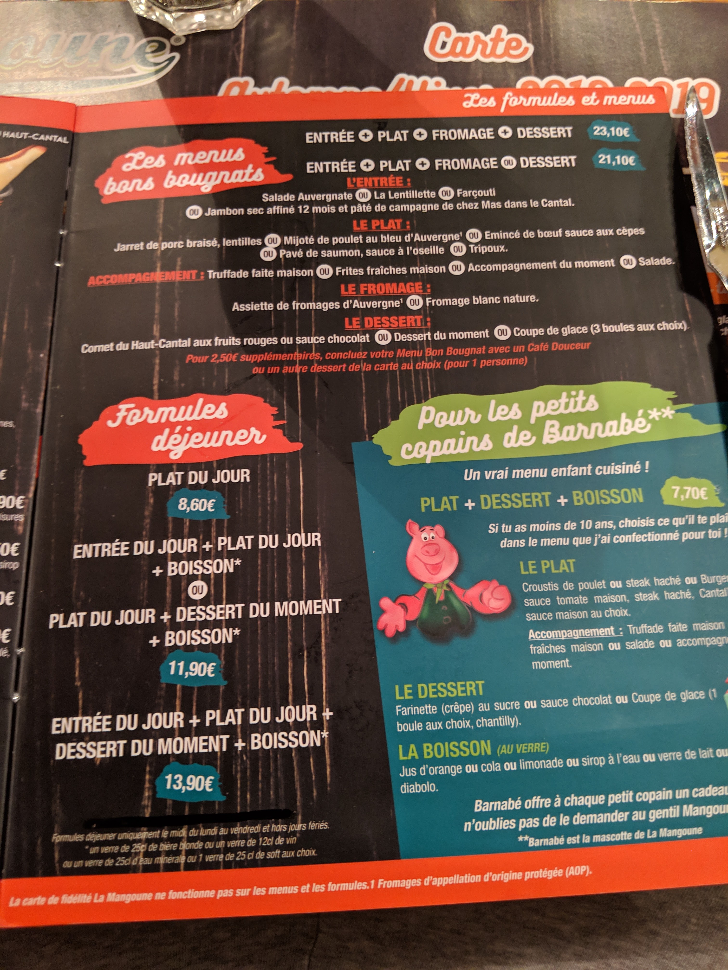 Pour souhaite s'offrir un gueuletons en mode auvergnats. ...ont est visiblement au bonne endroit personnel souriant,avenant et agréable. Les plat bon et bien fourni pécuniairement abordable. Bref ont n'y mange très bien. Je recommande la Mangoune sans aucune hésitation