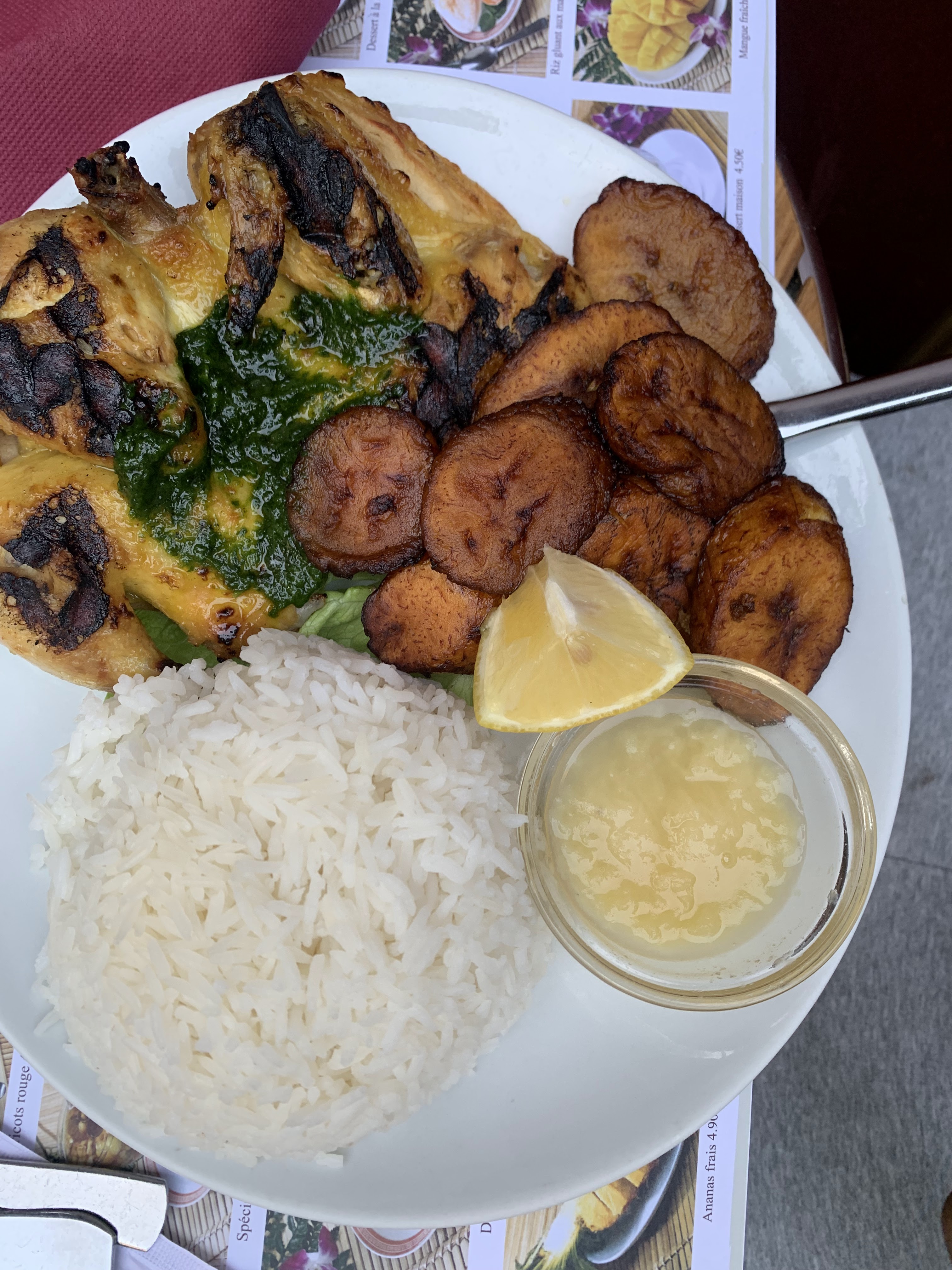 Commande Deliveroo : DELICIEUX !!! Juste Parfait. Contenant efficace, portion très généreuse ( j'en aie pour 2 repas) . J'ai pris le coquelet, banane plantain et riz et une portion de beignets crevettes. Le coquelet est délicieux, juteux même les blancs bien assaisonné et tendre. Le riz parfaitement cuit, banane plantain non huileuse ( seul petit bémol, pas de sauce pour le riz). Les beignets INCROYABLES, des vrais grosses crevettes et servi au nombre de 5 en plus. On paye mais la qualité est là. Je recommanderais, c'est sur. Merci !!!!!