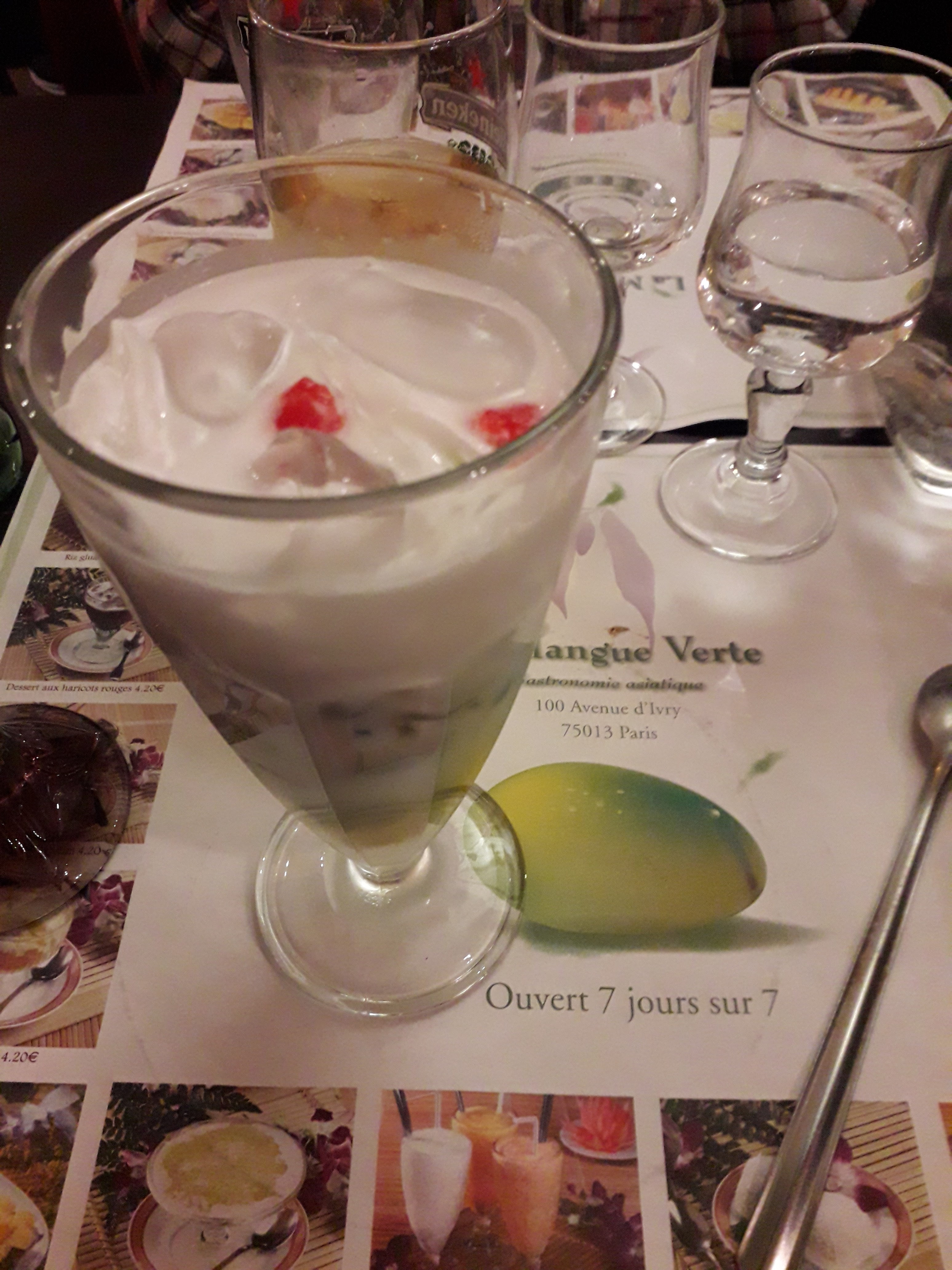 Je cherchais un restaurant dans le quartier après mes courses et je suis tombée sur celui ci : le nom du restaurant m'a plu alors je suis rentrée. Et ce fut une belle surprise : pour moins de 20 euros j'ai eu un plat de riz sauté ananas crevettes bien consistant et un riz gluant et mangue en dessert très bon, avec des serveurs professionnels. Je recommande vivement cette adresse si vous passez dans le quartier.