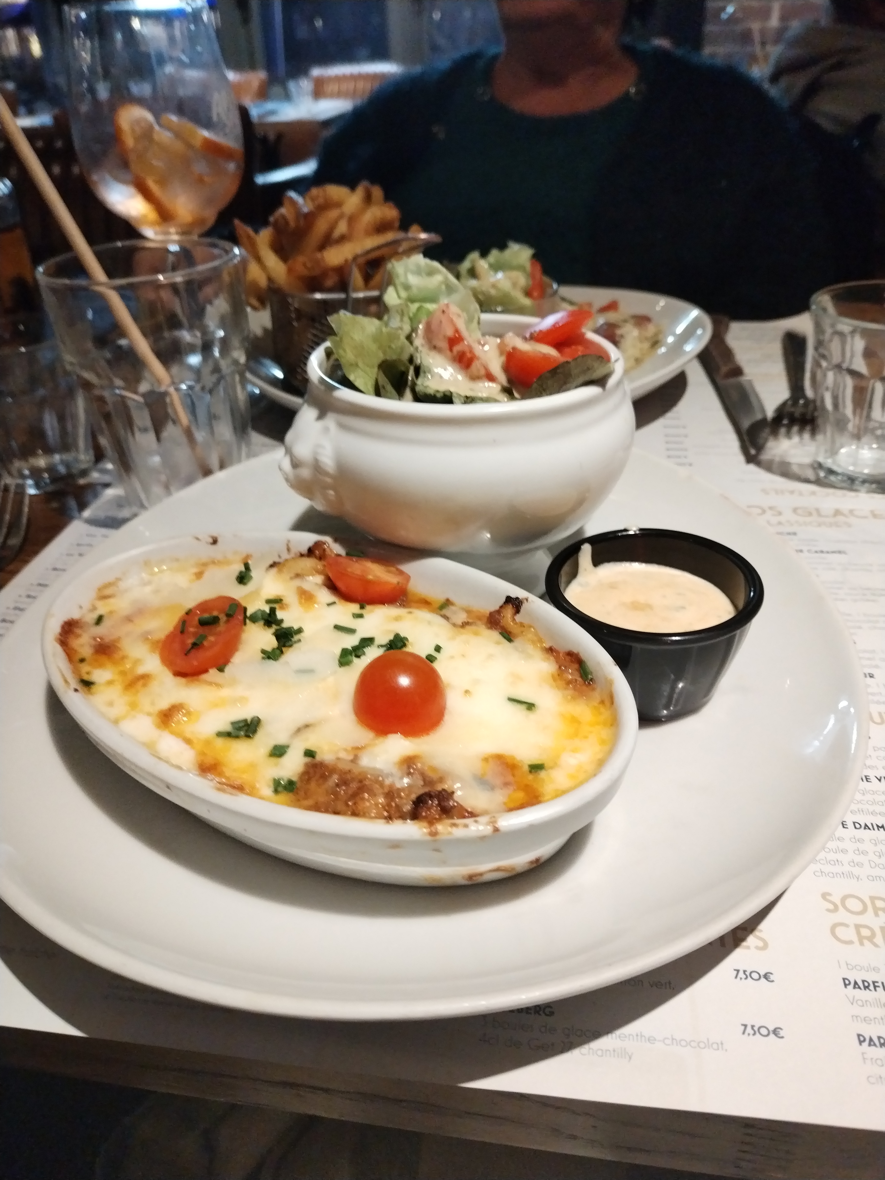 Bon emplacement, hygiène nickel Sièges confortables mais tables 1 peu serrées à certains endroit Plats au top vraiment bon juste 1 peu plus de raviolis au St maure dans l'assiette aurai été bien Pour les autres bien servis Niveau dessert : les profiteroles avec le caramel beurre salé et les cacahouètes ça match pas trop