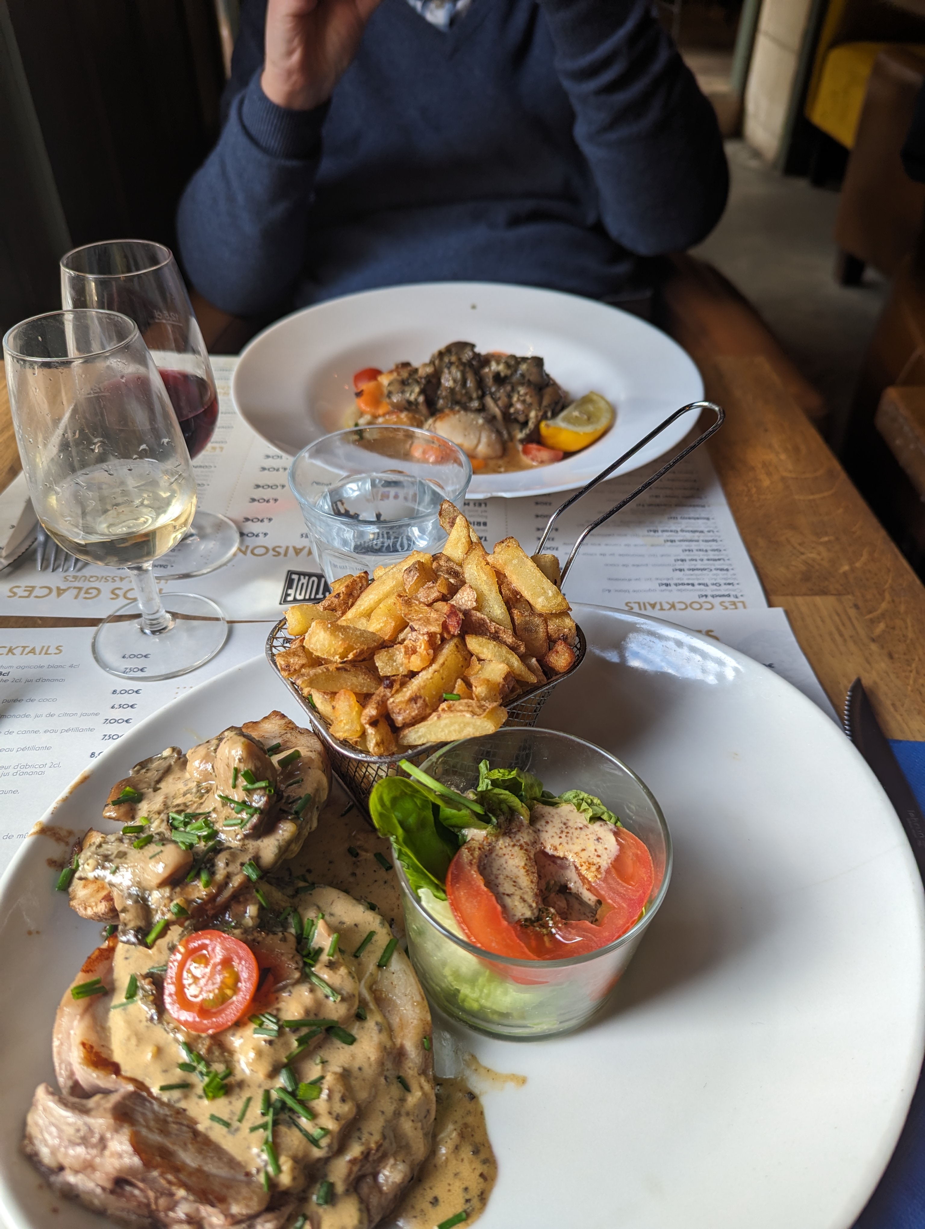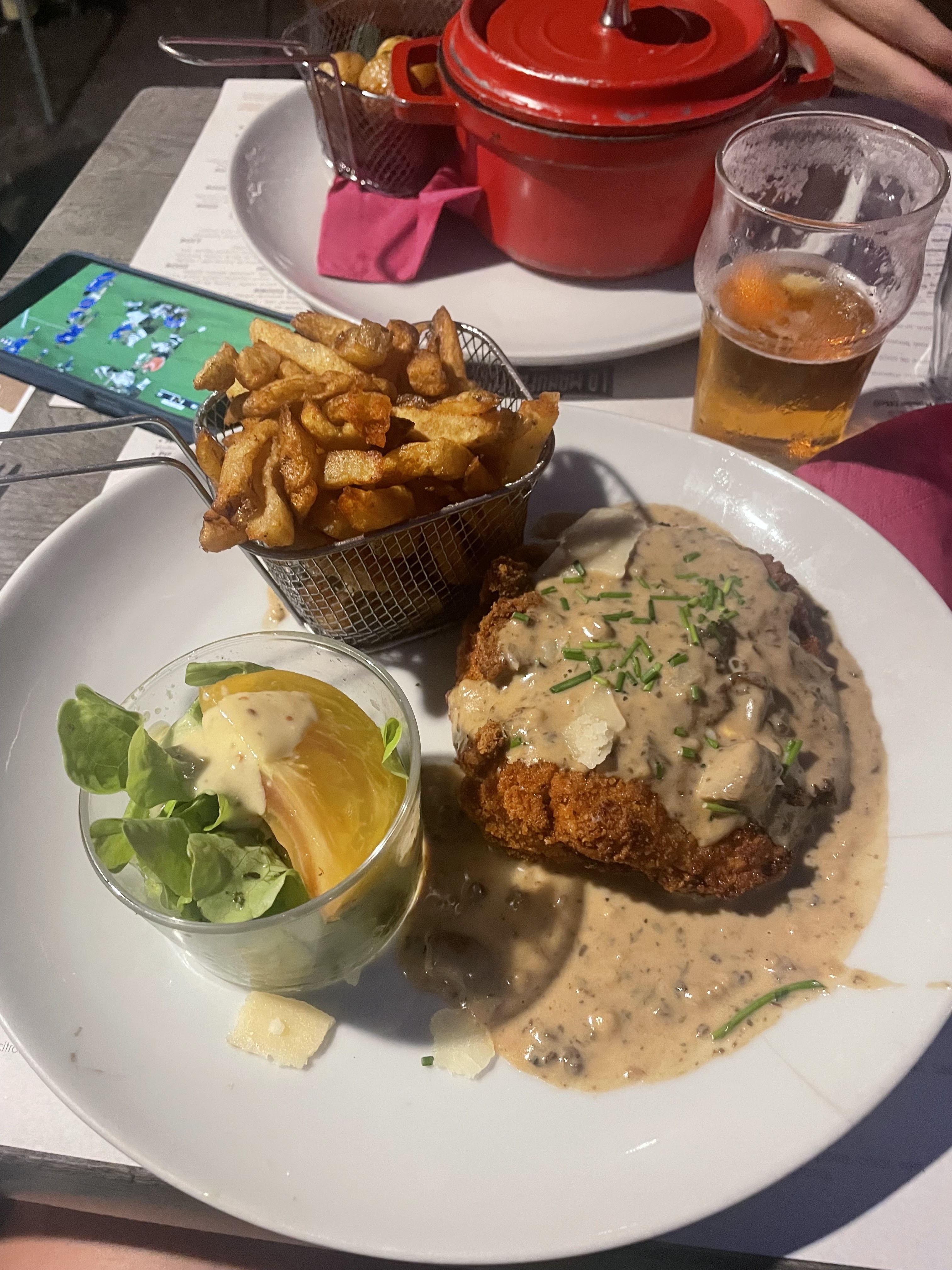 Un peu d'attente pour une des deux boissons, Très bonne place un vendredi soir vers 20h pour 2 personnes, le cordon bleu est très bon, et le café-Paris un régal, super bien placé pour boire un coup après 👌