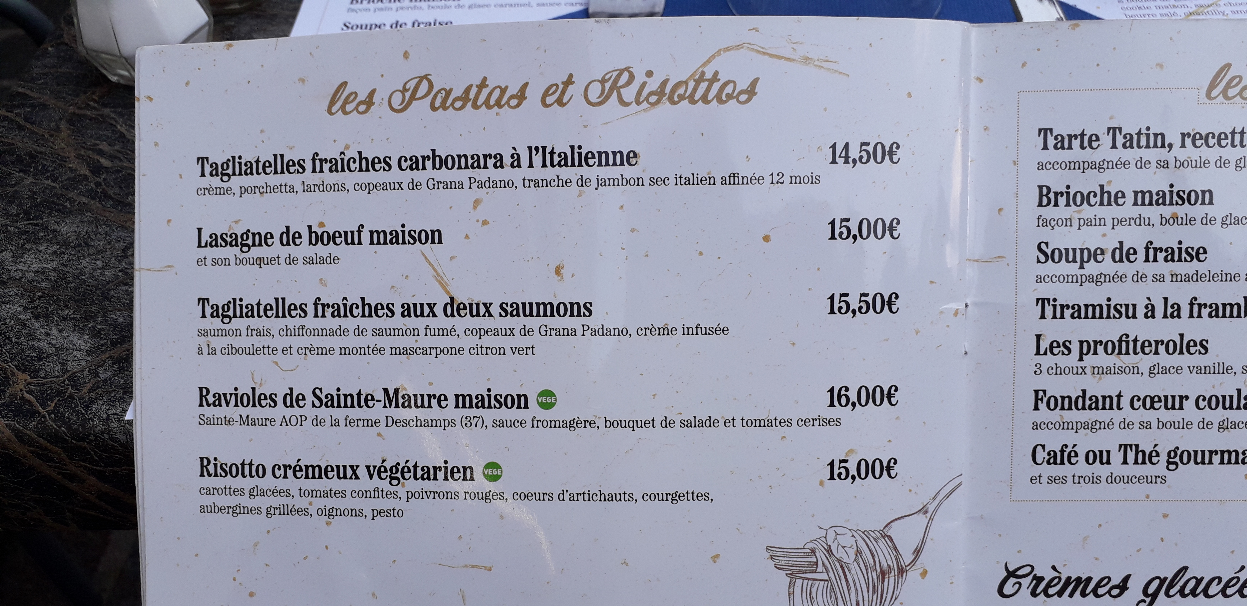 Plats sans saveur et sans goût. Rupture de stock non précisé à la présentation des cartes. Parmesan sur les Plats en tranches épaisses et non en copeaux. Gauffres et crêpes à la carte des desserts alors qu'ils ne sont servies que l'après midi......