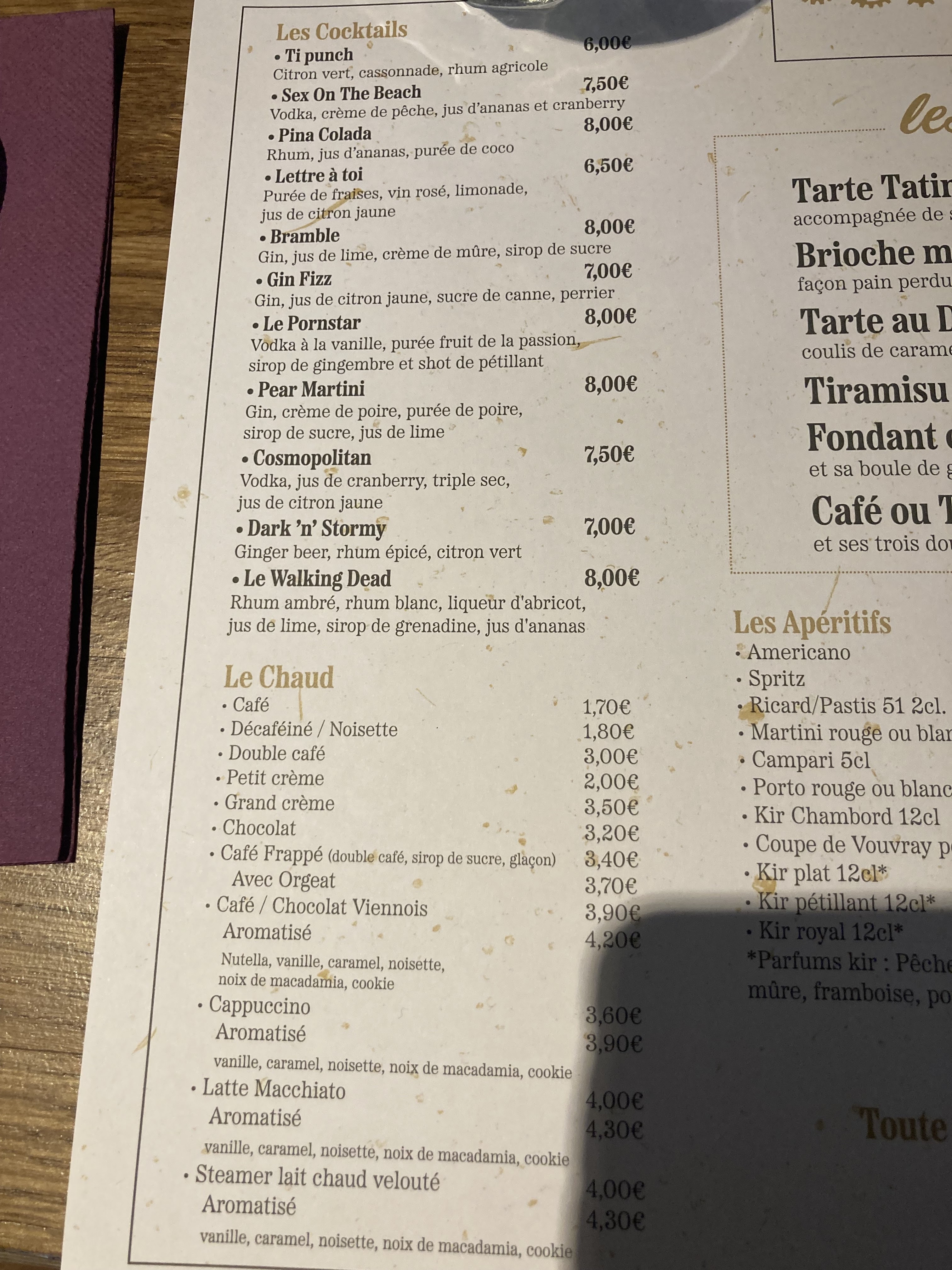 Honteux. Venant à 8 pour un petit goûter, personne n'est venu nous servir. Un seul employé s'est donné la peine de venir nous voir (alors que ce n'était pas son endroit, merci à lui). La crêpe était immangeable. Froide, garni de beurre à en être écoeurant en plus du chocolat ... Nous avons toutes été déçus de l'endroit, aussi bien sur les desserts que les boissons. Le café gourmand n'est rien d'autre qu'une madeleine et un biscuit du commerce ainsi petite panacotta ... Extrêmement déçu de l'endroit et l'hygiène laisse à désirer ...