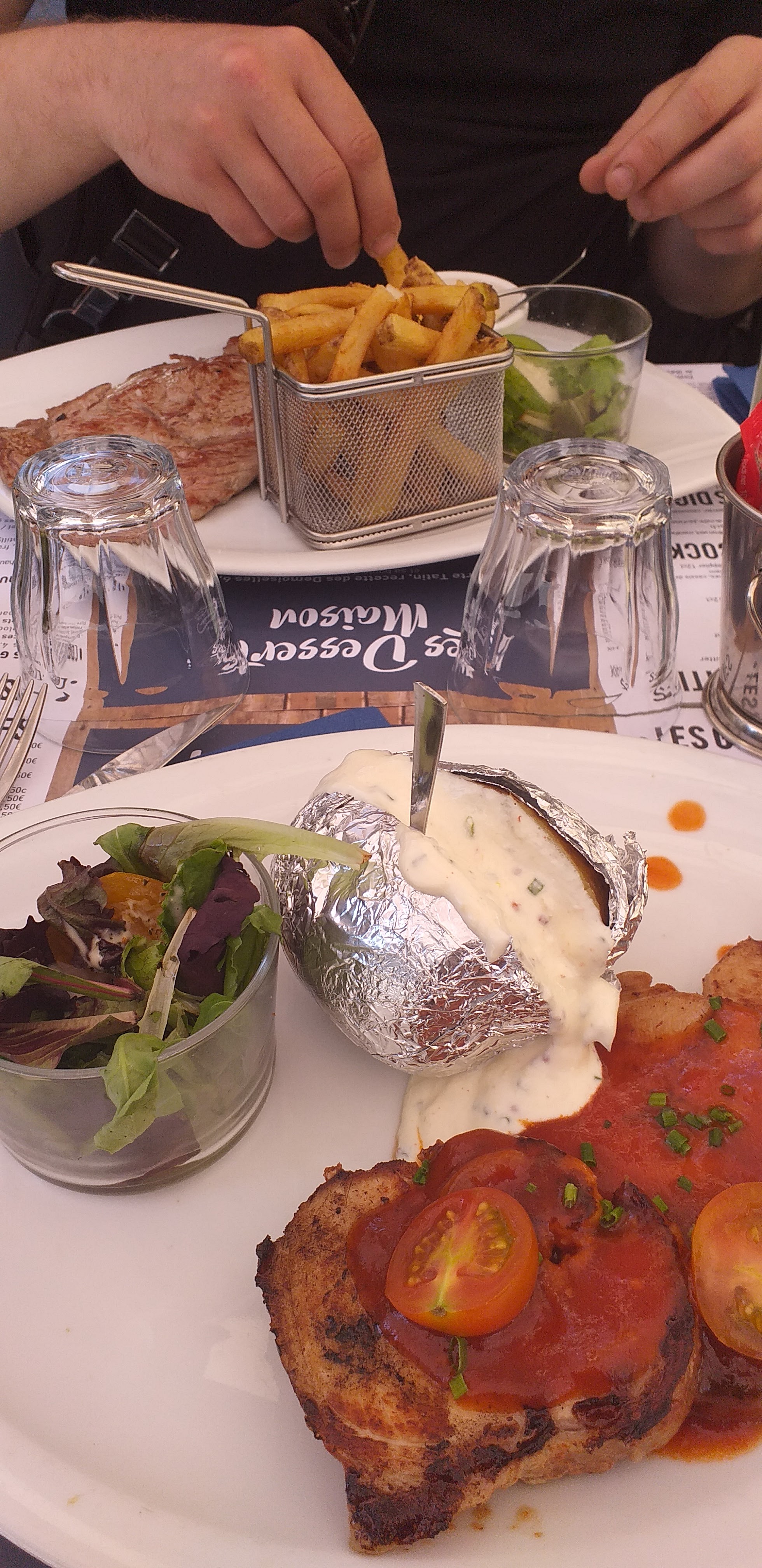 Restaurant au cœur de la ville, au pied de maisons à colombages datant de la construction de Tours. Serveurs à l'écoute et très aimables. Nous avons pris un Porcelet farci au chorizo et sa crème aux herbes avec pomme de terre au four et chips épicé et un pavé de rumsteack et ses frites maison. Le tout était excellent. Pour les desserts nous avons opté pour une coupe Nutella et une coupe brownies, elles étaient très bien garnies. La saveur de ce repas était là et les quantités également. Je recommande à 300%!
