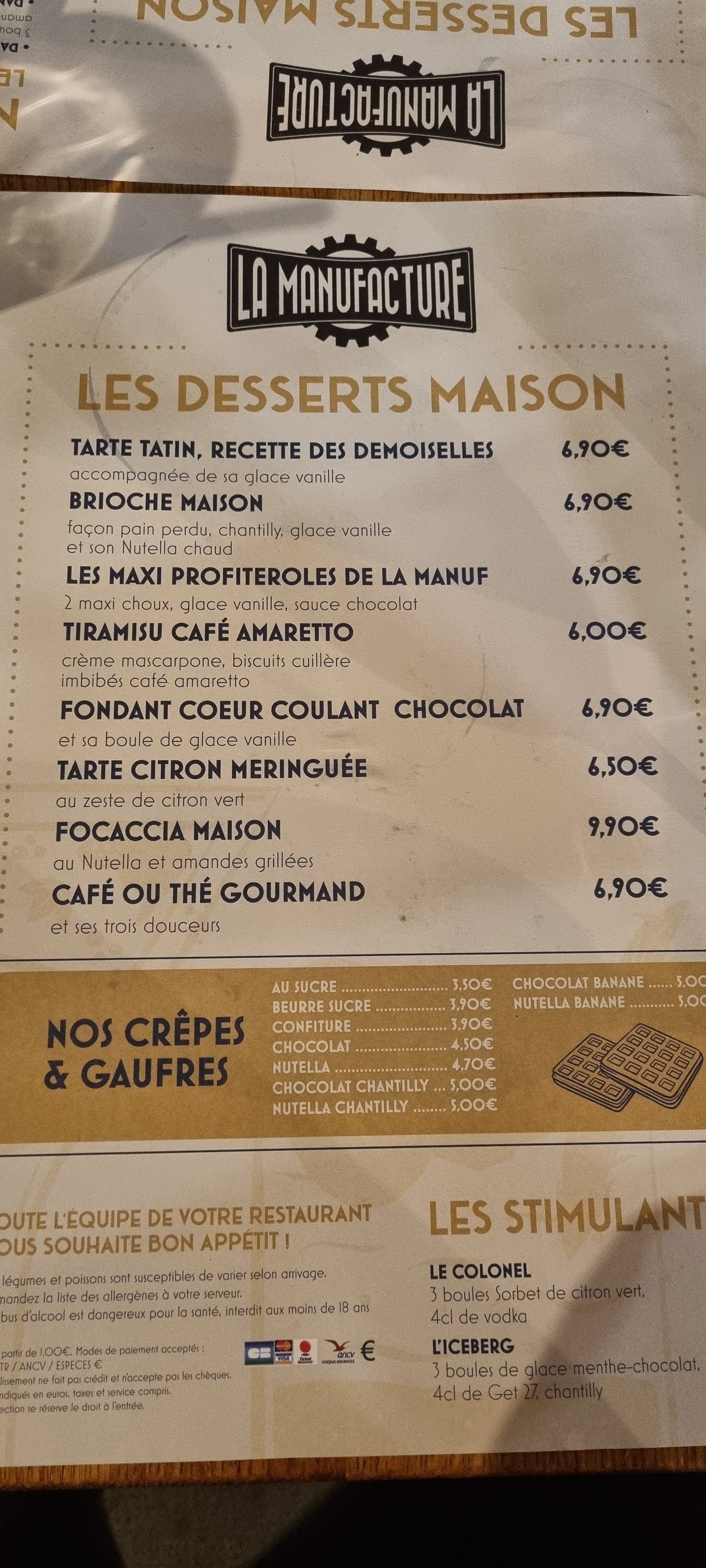 Lilloise de passage à La Manufacture, je me suis régalée!! Mention spéciale pour la salade avocat-saumon et la mousse au chocolat. Prix abordables. Le service était un peu long, mais il y avait particulièrement beaucoup de monde en ce soir du lundi 2 octobre par 26 degrés !!! et les serveuses n'étaient que 2 et couraient partout. La qualité de la nourriture et leur sourire a donc contrebalancé ce petit bémol. Je recommande !