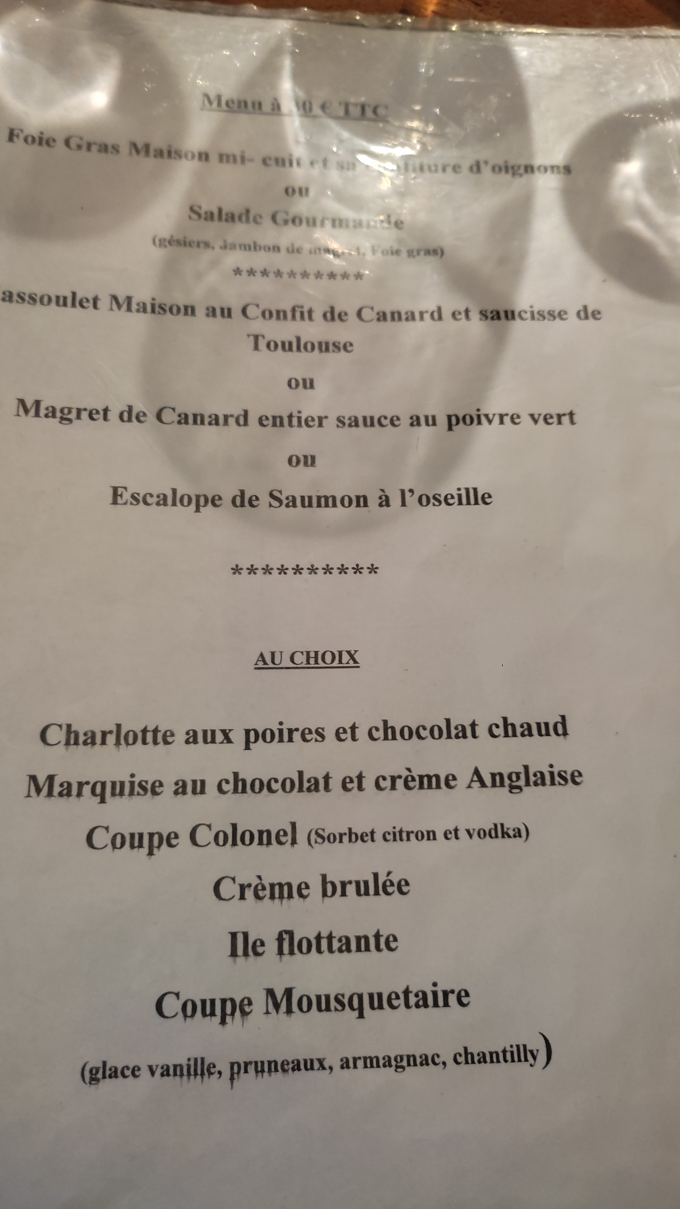 J'ai pris le menu cassoulet avec salade en entrée et une crème brûlée. La salade est inutile, c'est juste pour attendre que le cassoulet soit réchauffé. Le cassoulet est correct sans plus. Une cuisse de canard confite et un morceau de saucisse de Toulouse (?). Le serveur n'est jamais allé dans un lycée hôtelier. Le décor est vieillot... 27 euros avec un soda.
