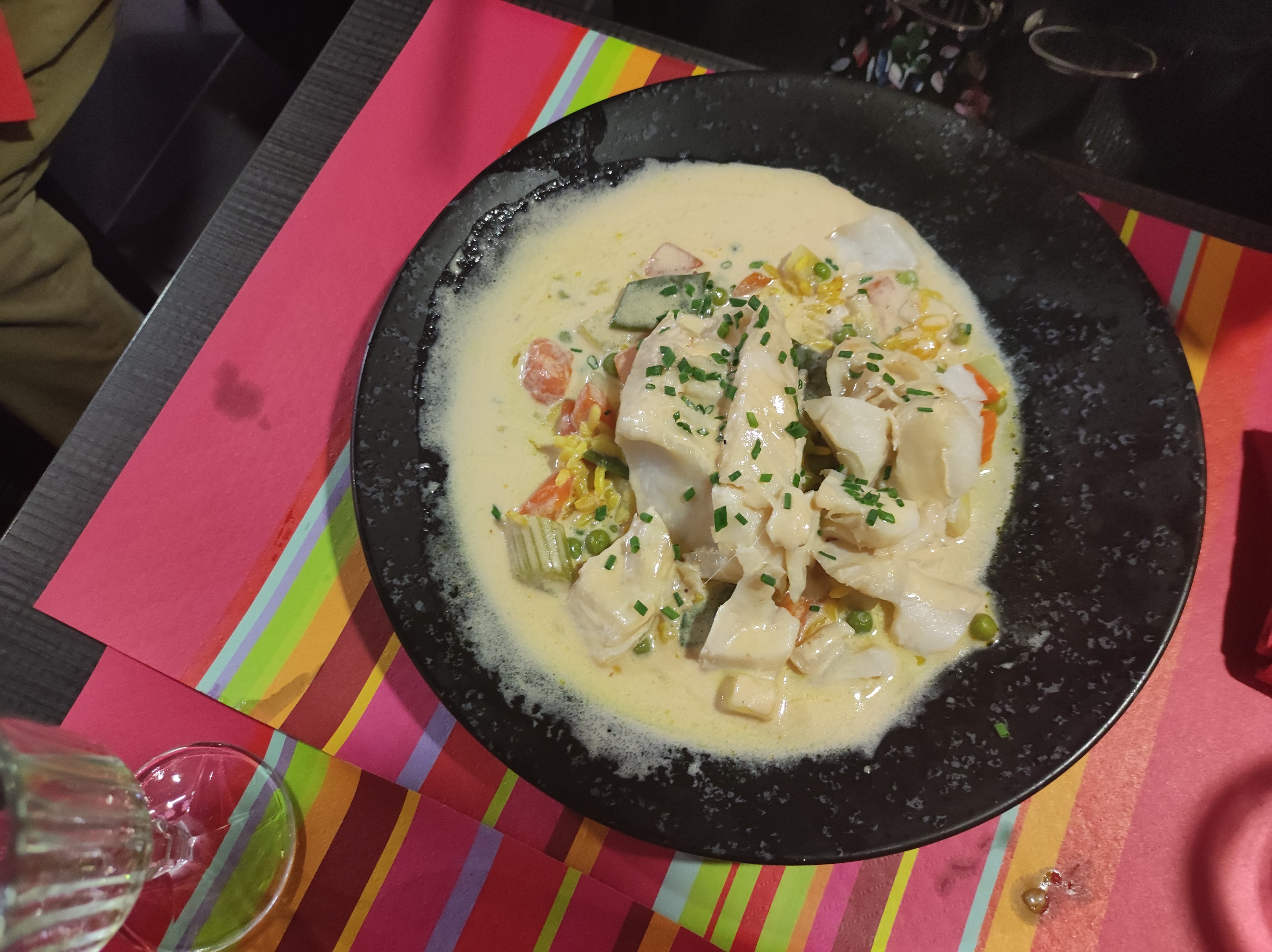 Le fish and chips maison était en petites portions, mais bien cuit et croustillant. Les moules par contre étaient très pauvres. Très petit, beaucoup de viandes écrasées et de coquilles cassées. Il y avait un choix de deux sauces de cuisson, « nature » et « crème ». Le « naturel » n'était pas beaucoup mieux que l'eau de mer et la « crème » semblait juste être une surabondance de crème par-dessus. Je pensais que les moules étaient préparées avec des échalotes, de l'ail et du bon vin blanc ? Et mangé avec du pain français frais et croustillant, pas un petit pain aux briques dures comme de la pierre ! Aucune trace de tout cela ! La cuisine française??? Non! Les plats principaux, les desserts et une bouteille de muscadet terne coûtaient plus de 100 €, nous ne reviendrons pas.