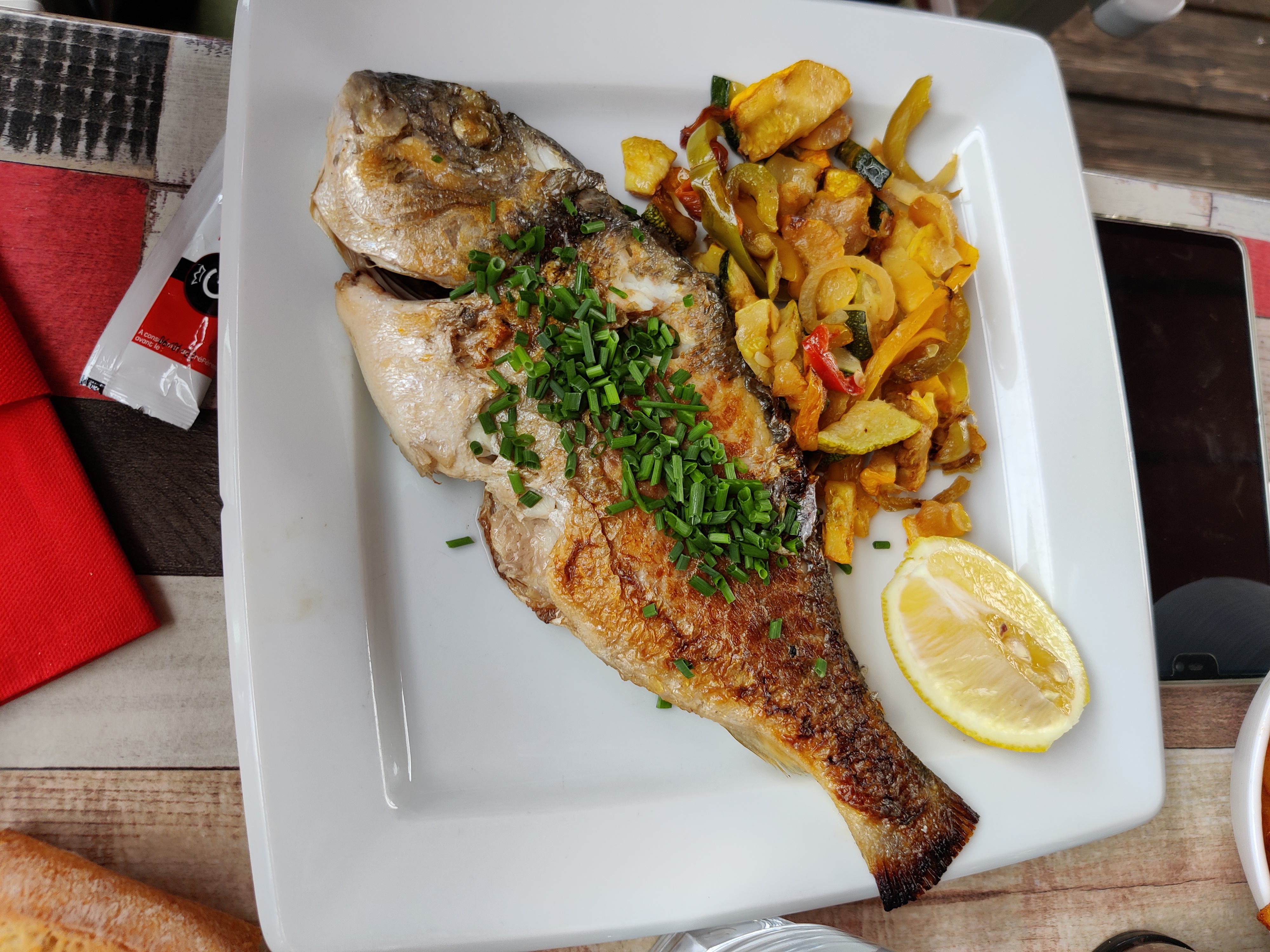 Accueil très agréable, cuisine excellente, quantité juste. Le seul bémol est que nous avons déjeuné en plein soleil et que le store n a pas été descendu ....car sinon il ne remonte pas... à l heure de midi, pas très cool...