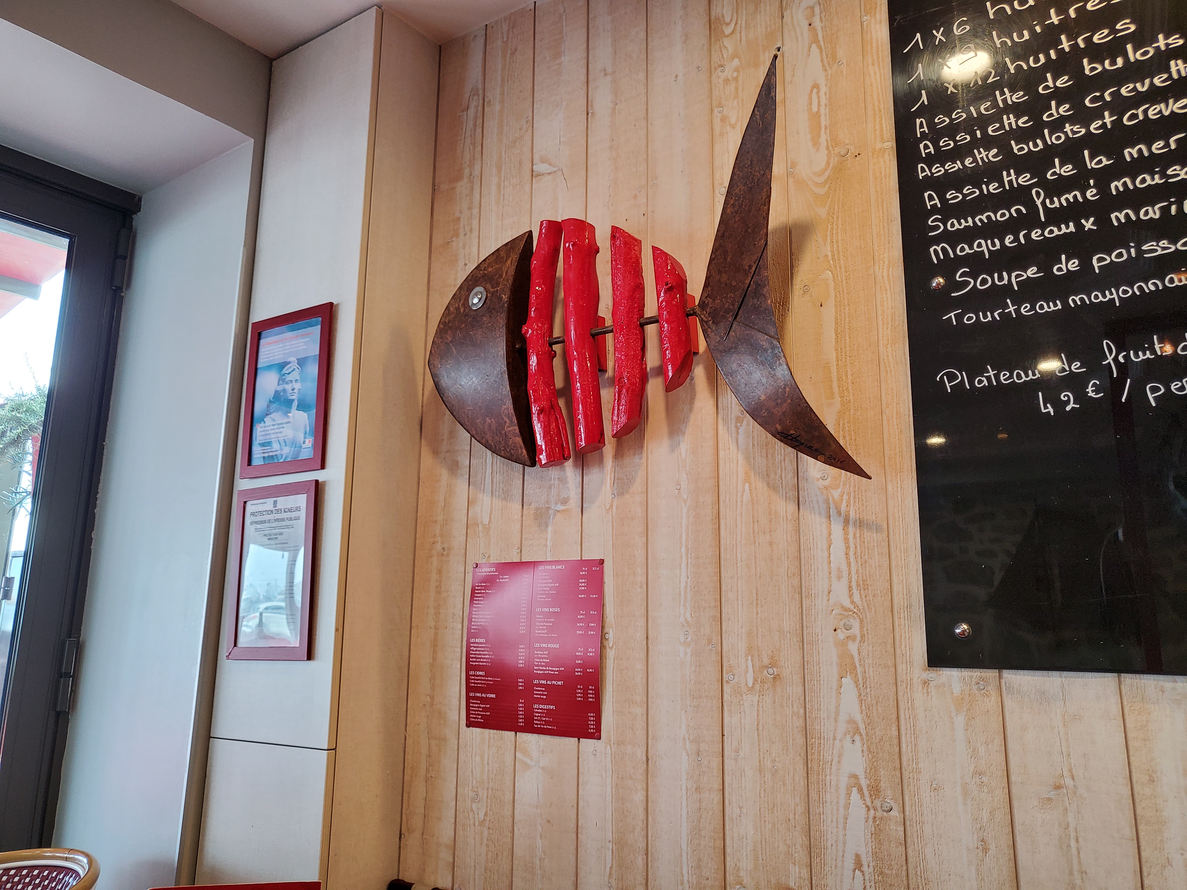 Il y a de nombreuses places de stationnement gratuites juste à l'extérieur, quai Henri Chardon. Il y a des sièges à l'extérieur quand il fait beau et chaud, mais par un vendredi couvert de mai, nous nous sommes retirés à l'intérieur qui dégage une atmosphère géniale avec des chaises lumineuses et des sculptures/sculptures sur les murs. Comme c'était mon premier repas du voyage, j'ai dû opter pour des moules et des frites avec un picher de vin blanc, le tout étant très bon avec une très grande portion de moules. Les moules et frites ne coûtaient que 11,9 euros et je pense que les 25 cl de vin coûtaient 3,50 euros. Excellent service et une atmosphère charmante.