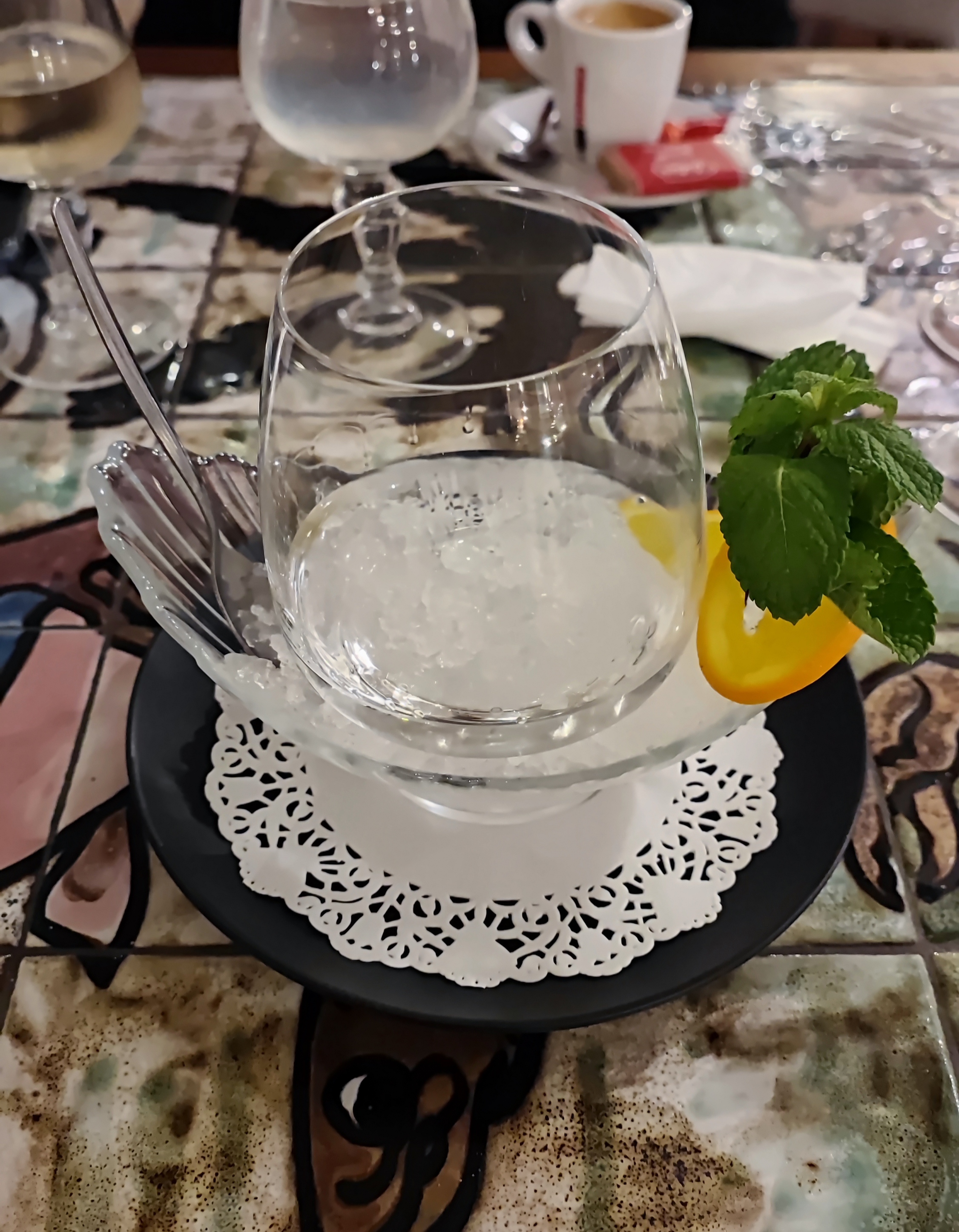 Un grand choix de produits de la mer, copieux, cuisson à point pour la poulpe à la plancha. Rien à redire. Apéro offert, geste de fidélité. Grande finesse. Photo d'un carpaccio d'ananas avec son sorbet à la pêche de vigne. 2 services le soir