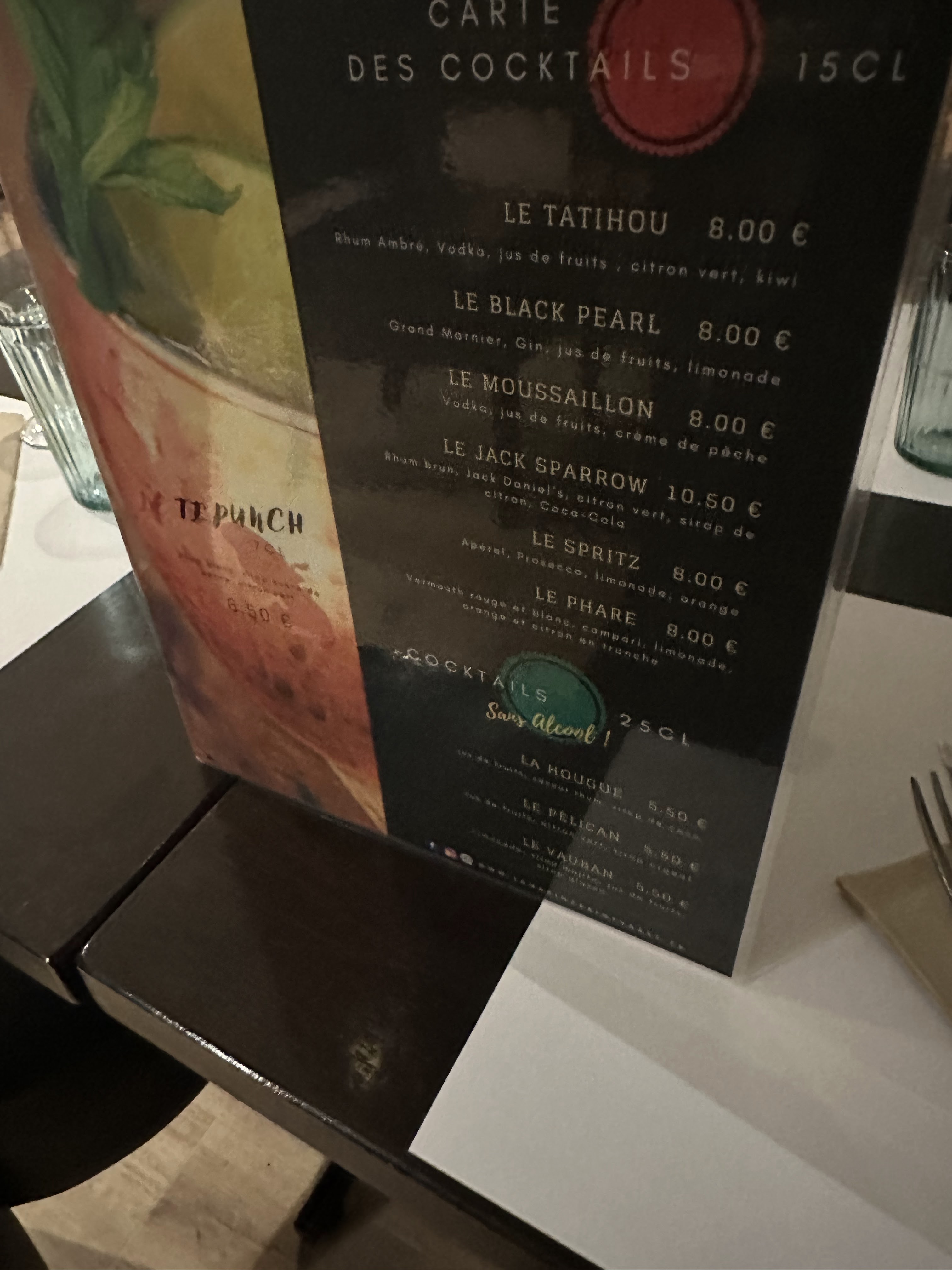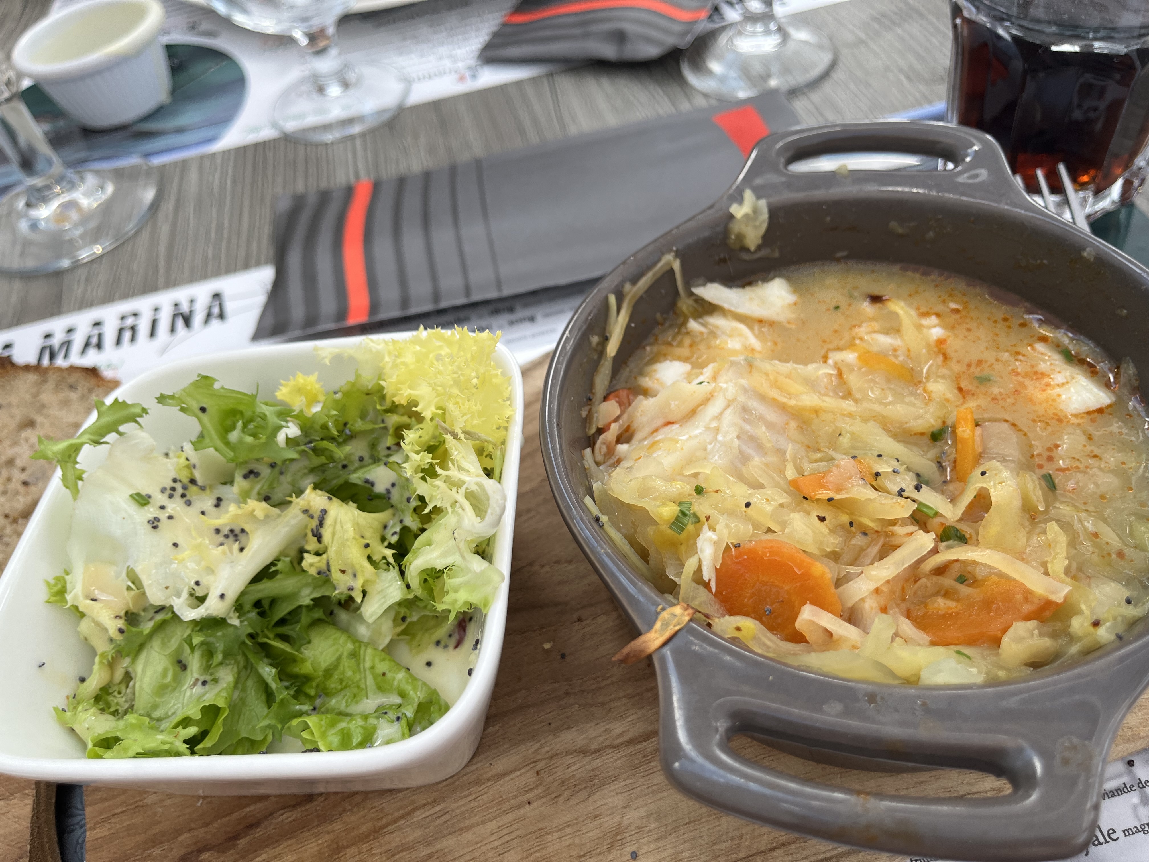Accueil déplorable mais service très très rapide ! nous avons passé commande, et cinq minutes chrono les plats sont arrivés. Ma mère et moi avons pris une nage de cabillaud, crevettes et chorizo et mon mari une entrecôte frite. La nage était fade et consistait à un morceau de cabillaud trop cuit nageant dans un jus insipide avec cinq crevettes, des morceaux de carottes et bcq bcq d’oignons accompagné de cinq feuilles de salade! ne vaut pas les 16€80. Car réchauffe au micro-onde quand à l’entrecôte de mon mari il pense que son assiette avec les frites a été réchauffée au micro-onde ! En conclusion c’était pas bon. A fuire si vous voulez manger correctement
