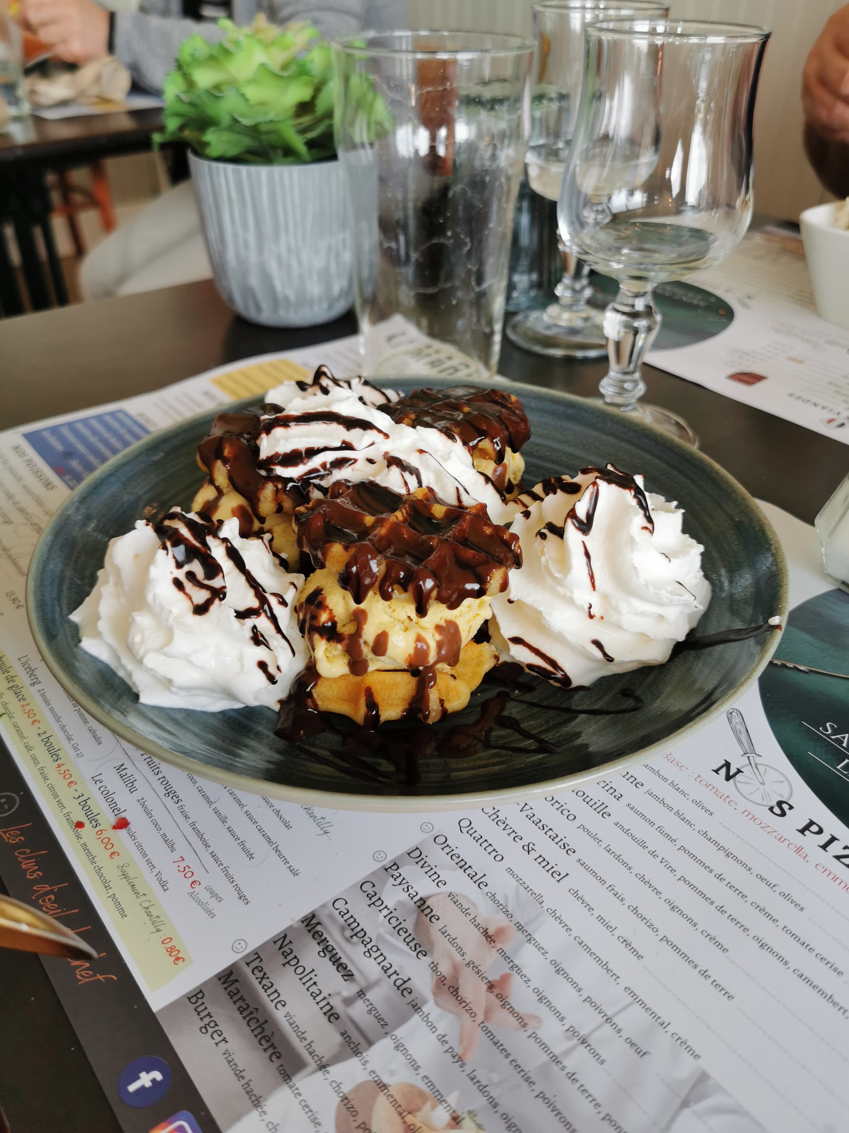 Bof ! St jacques bonne mais sur purée froide et profiteroles qui n en sont pas sur un biscuit soit disant maison, pas bon et le coulis de chocolat chaud était très froid Berk... A fuir ...