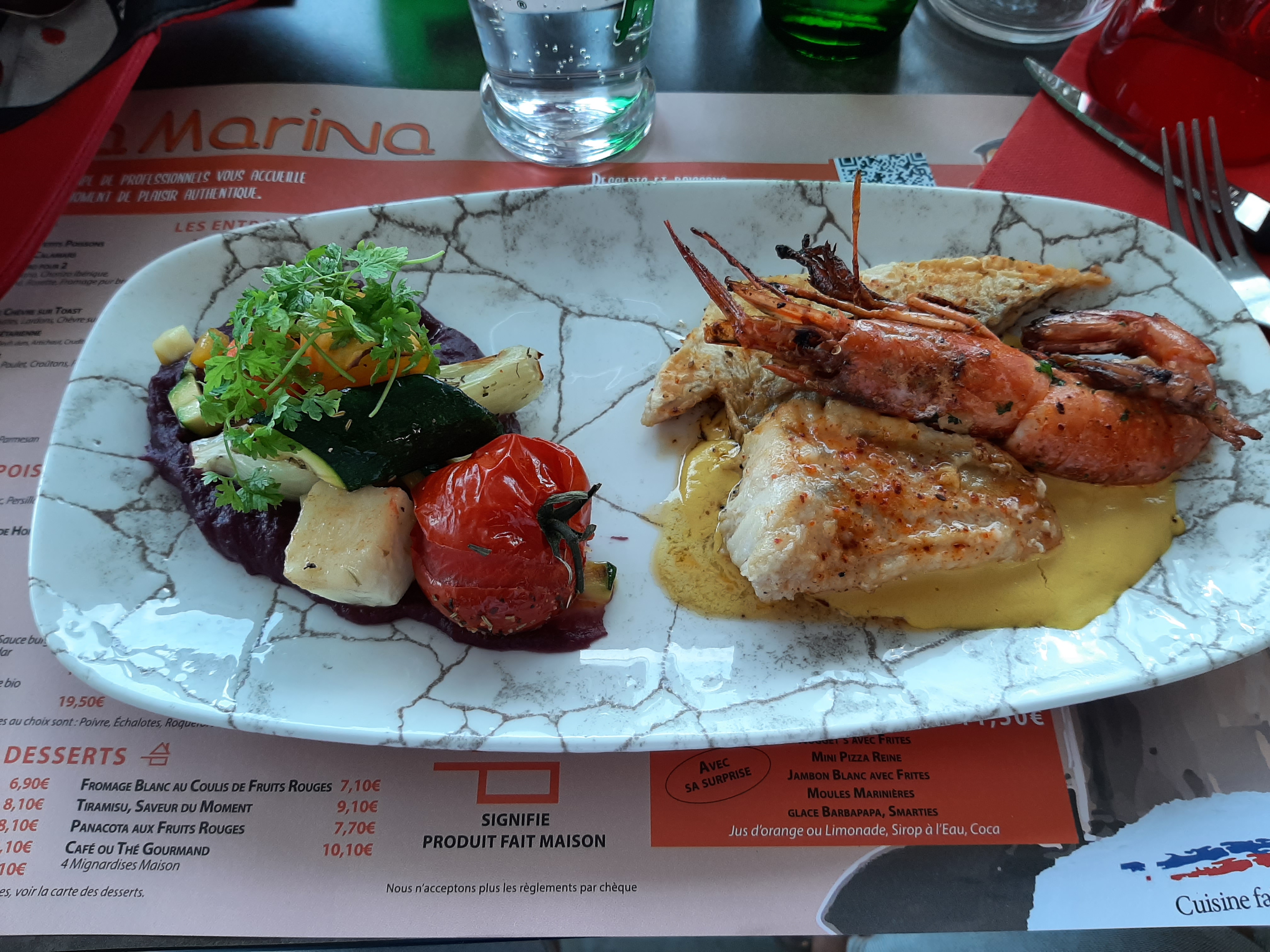 Nous nous sommes arrêtés prendre un verre en amoureux à La Marina, en terrasse avec une magnifique vue sur le port. Nous avons finalement réservé cette même table pour manger le soir. Nous avons été servis par Romain, excellent serveur plein d'humour avec de très bons conseils et aux petits soins avec ses clients. Ma femme a choisi des moules au roquefort qui étaient délicieuses. Pour ma part, je voulais le saumon mais il n'y en avait plus. Romain m'a donc conseillé le thon mi-cuit et ses petits légumes et m'a demandé de lui faire confiance pour le vin. Et bien je n'ai pas été déçu, c'était excellent. Romain connaît très bien sa carte. Nous avons passé une excellente soirée autour d'un excellent repas. Je conseille vivement ce restaurant. Nous y retournerons.