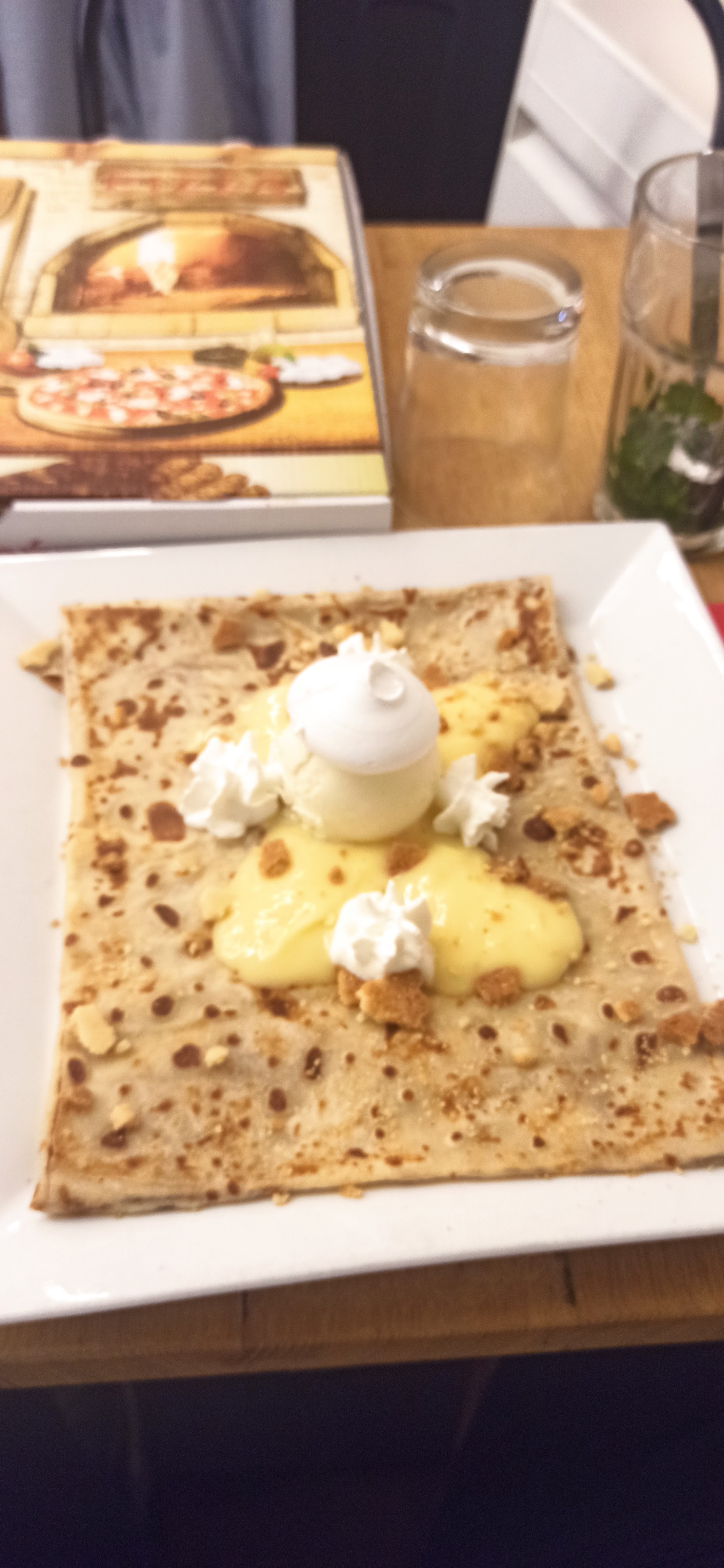 Personnels très sympathique J'ai moyennement aimé la pizza, trop épaisse à mon goût. Pris une crêpe en dessert que je n'ai pas pu finir car pas cuite et vraiment déçue. Ni aurait-il qu'en Bretagne que l'on mange de bonnes crêpes ?🤔
