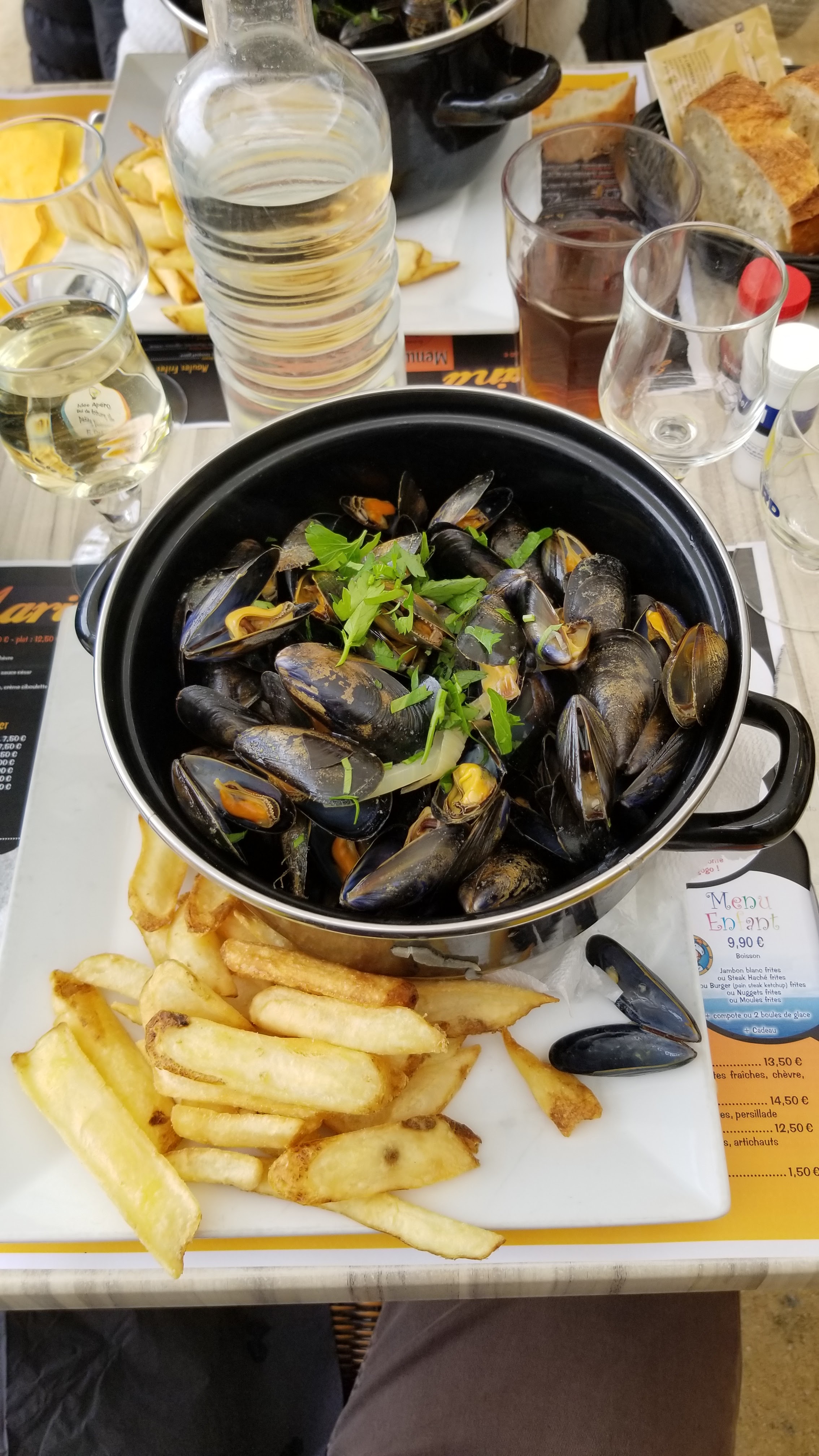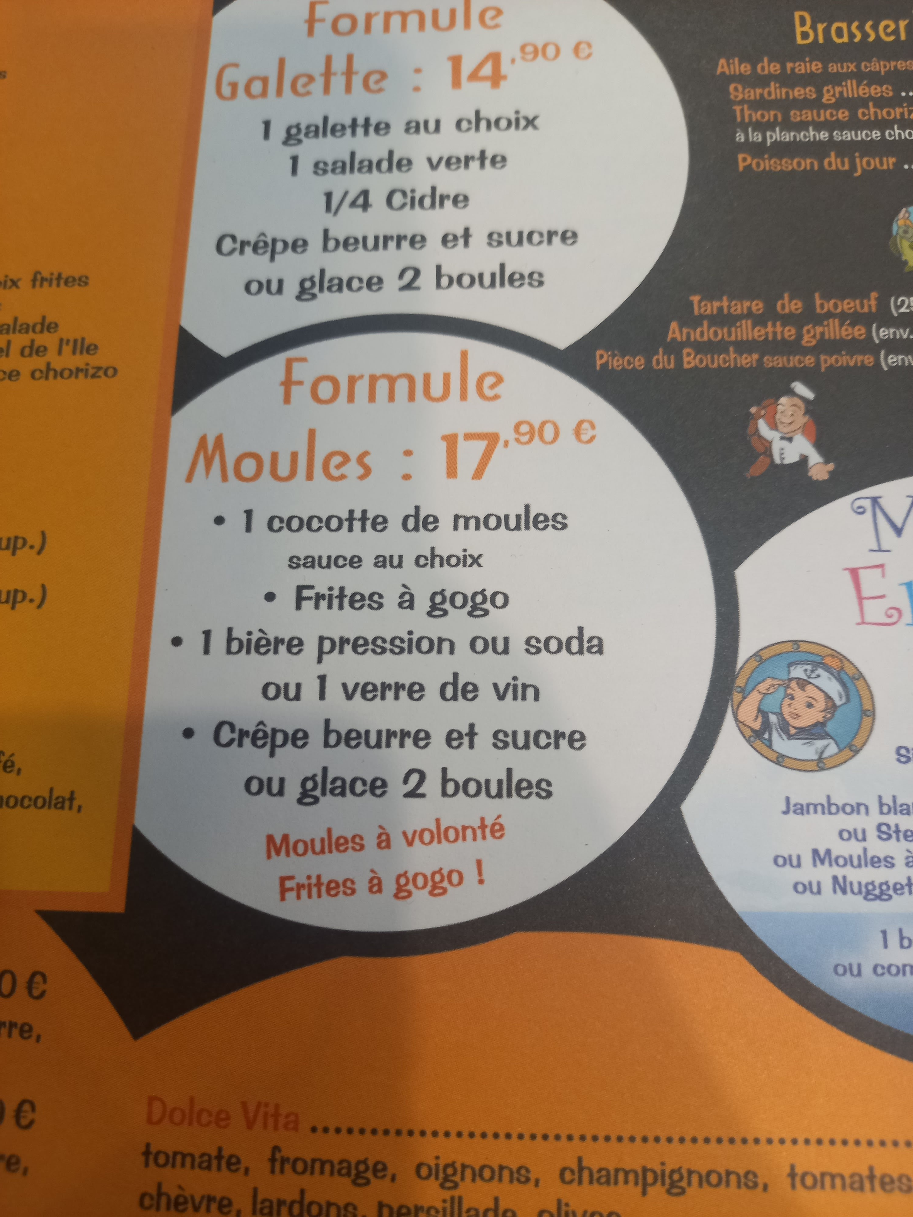 Menu moules frites a volonté.... Moules de petit calibres. Une boisson, moules frites a volonté, une crêpe pour un peu moins de 20€.... Rapport qualité prix correct