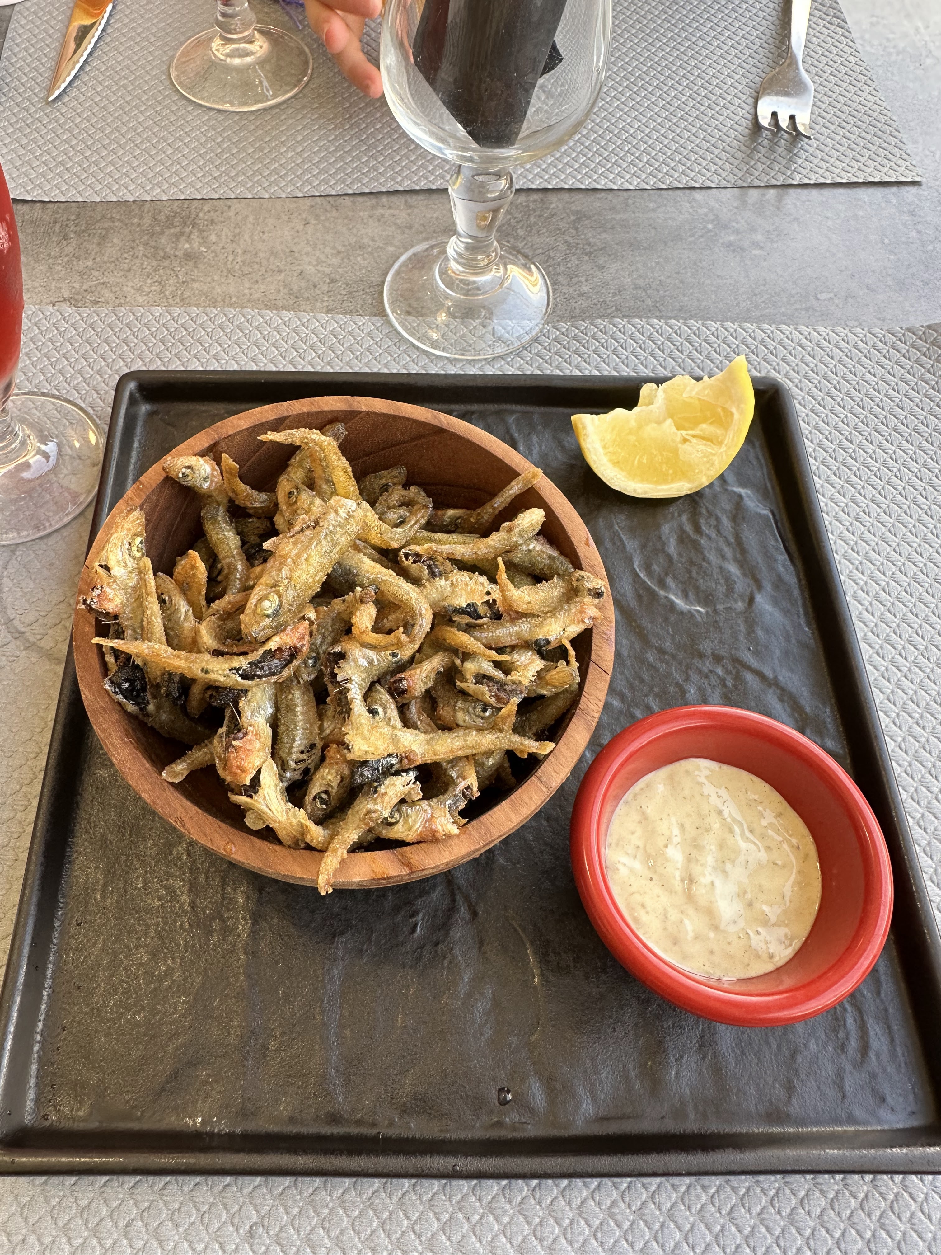 Un lieu sympathique. Ce n'est pas un gastro pour un petit repas en amoureux tranquille et au calme, mais un bon restaurant ! Le personnel est agréable, souriant, et avenant. Un petit pineau, et une carafe de vin rouge en boisson. Assiette de la mer en entrée 🐚🦐... La seiche et sa persillade, un vrai régal 😋, le thon et sa sauce chorizo idem 👍Merci aux cuistots pour cette régalade 😋😋😋😋. Environ 30€ par personne. Placé à l'extérieur en terrasse vue sur le port. Bon rapport qualité/prix . Nous avons passé un bon moment au soleil 🌞 de mai, avec l'odeur de la mer, une belle ambiance de vacances 😉 L'imprimeur s'est laché sur les fautes, dommage pour le resto qui hélas ne peut rattraper ses erreurs de frappe, mais pas grave,ça n'empêche pas de se régaler 👍😉😉😉