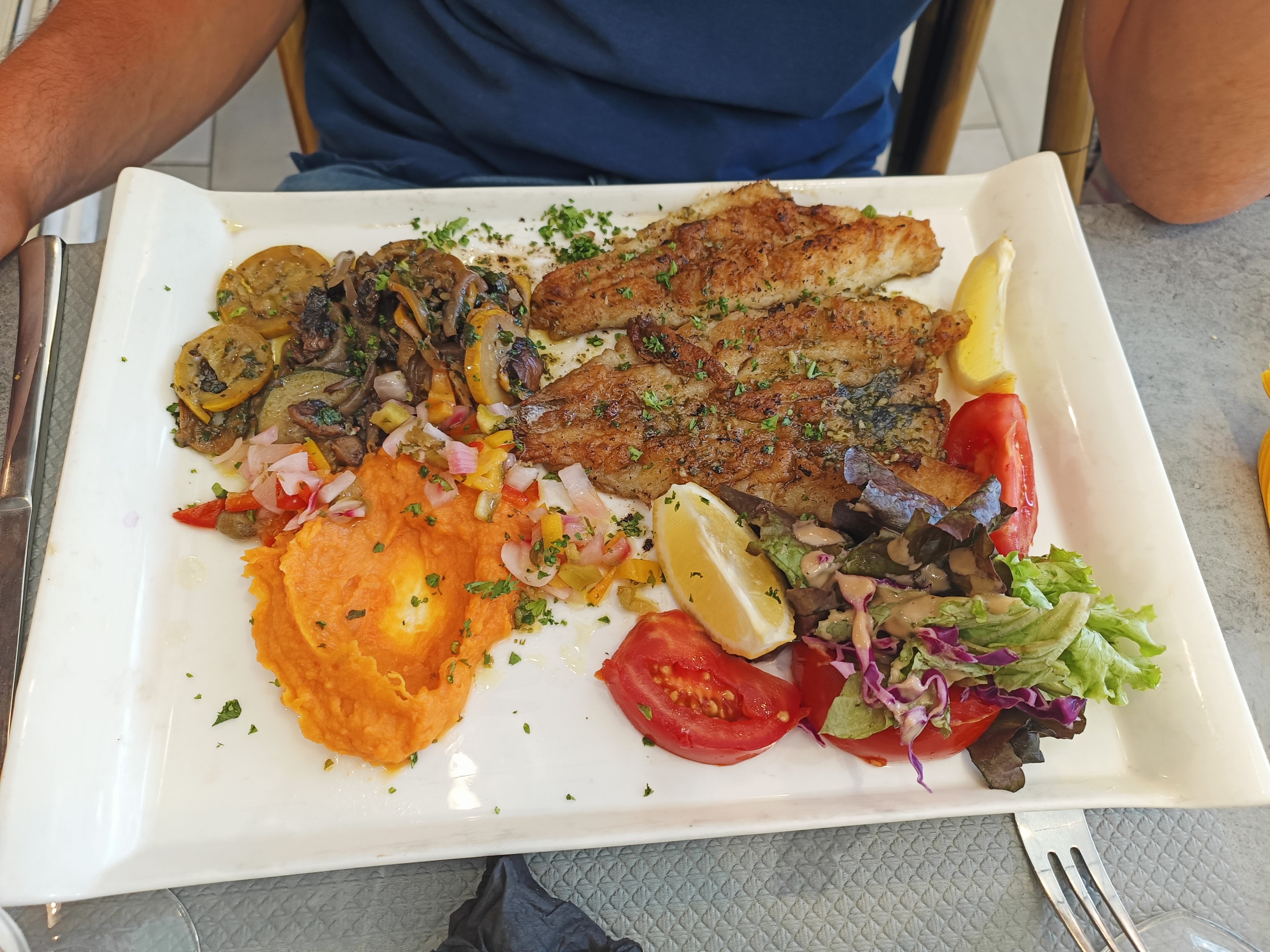 Nous avons avons pris en entrée des salade qui sont également à la carte en tant que plat. Les salades sont copieuses malgré que ce sont des entrées. La rillettes de poisson était bonne. Les moules frites à volonté ont un bon rapport qualité/prix de plus il y a beaucoup de choix pour les sauces.