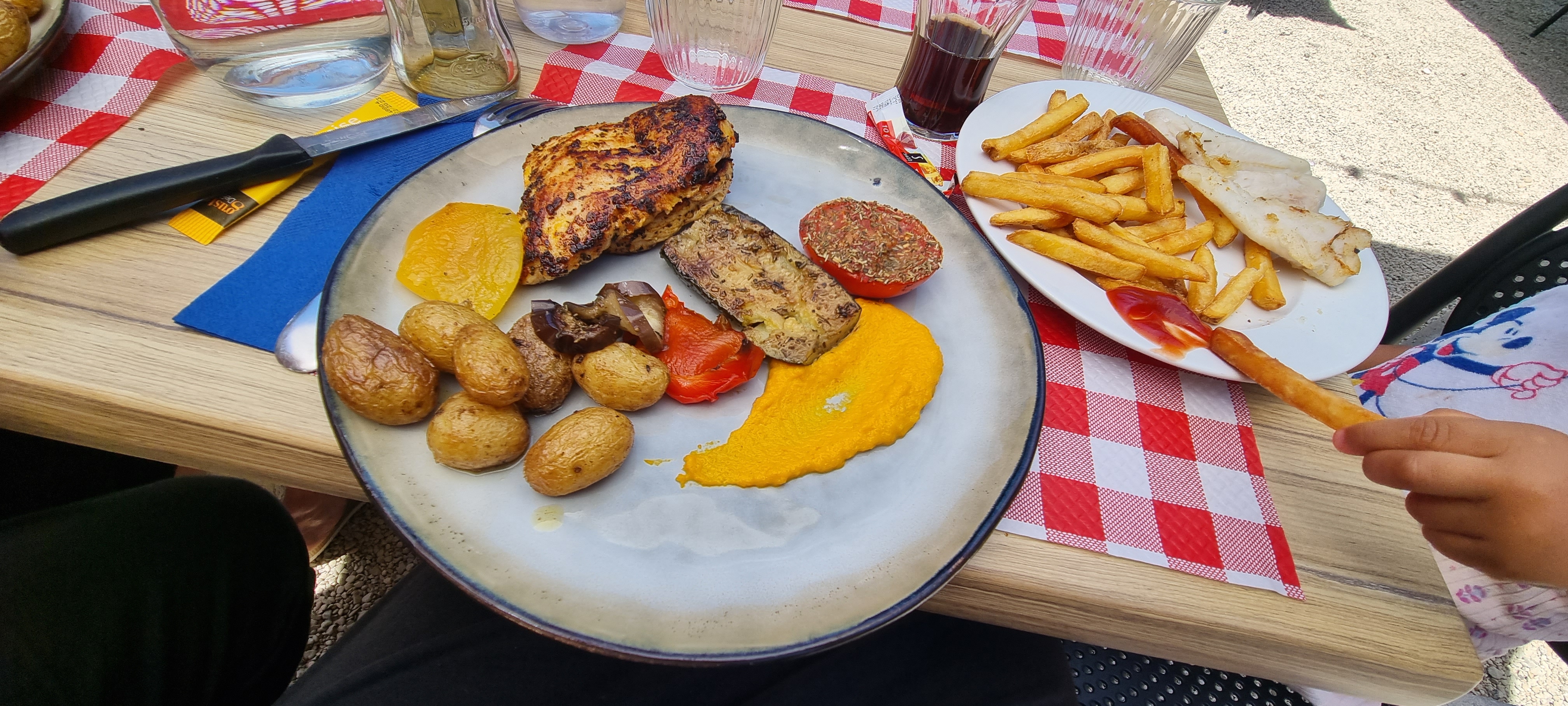 En cherchant à déjeuner, nous avons remarqué un petit panneau dans la zone industrielle voisine. Après un court trajet à travers une forêt, nous avons trouvé le restaurant la Marina qui n'est pas situé au bord d'un petit lac. Juste devant la porte, vous pouvez voir ce qui est disponible pour manger au restaurant. Divers plats sont préparés sur un grand grill. Même à 13h00, il y avait une table gratuite pour nous sans réservation, le chien qui nous accompagnait ne posait absolument aucun problème. Un service amical et rapide comprenait les boissons et la nourriture. Comme j'avais déjà reconnu la taille des portions à la porte, nous avons décidé de ne pas prendre d'entrée. Nous commandons deux fois la brochette de bœuf avec frites. Nous l'aimons beaucoup tous les deux, mais comme toujours, il manque un peu de sel aux frites. Mais cela semble être courant en France et facile à corriger. Le dessert était une crème brûlée et un café gourmand. Nous avons pu commencer notre voyage complètement satisfaits et heureux. Nous pouvons recommander ce restaurant à tout moment. C'est possible, surtout en semaine, car le menu indique qu'ils proposent également des menus.