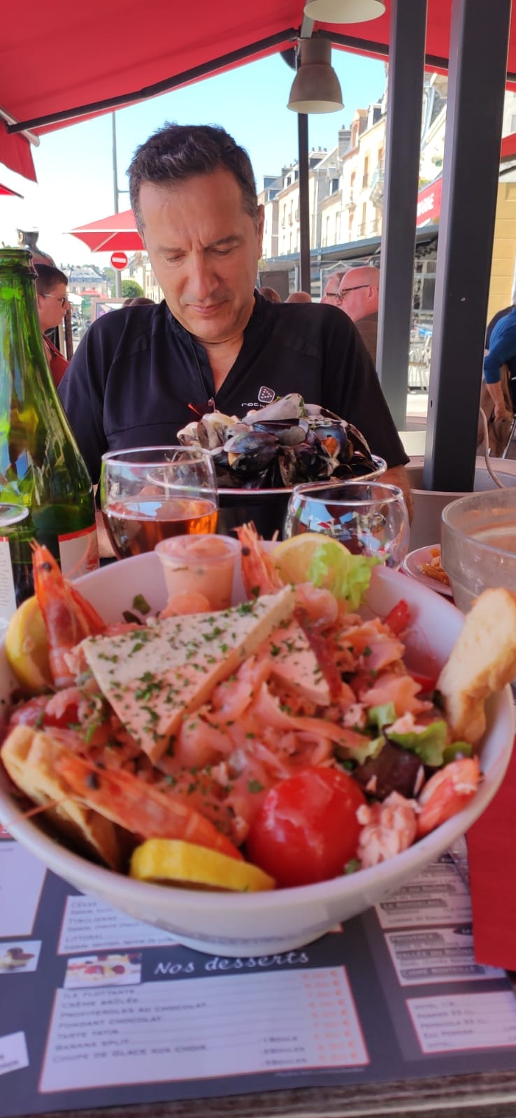 Vraiment rien d'exceptionnel. Nous avons pris une escalope normande et une salade littoral. La salade est composée de saumon fumé, saumon frais émietté, tomates, terrine de poisson, crevettes roses. Copieux mais simple.