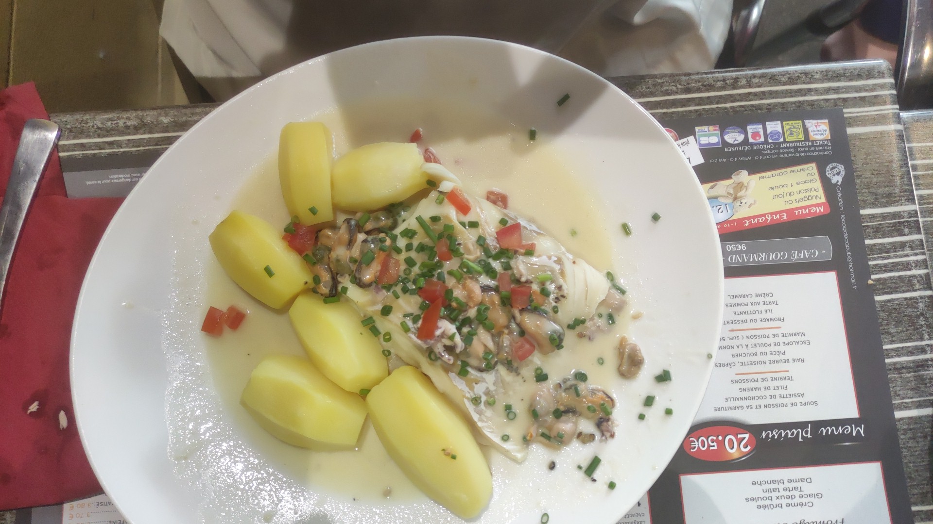 Repas pas fou Moules normande sans crème plus d'eau qu'autre choses Et une serveuse un peu trop familière avec un vernis écaillé un peu limite pour une serveuse....