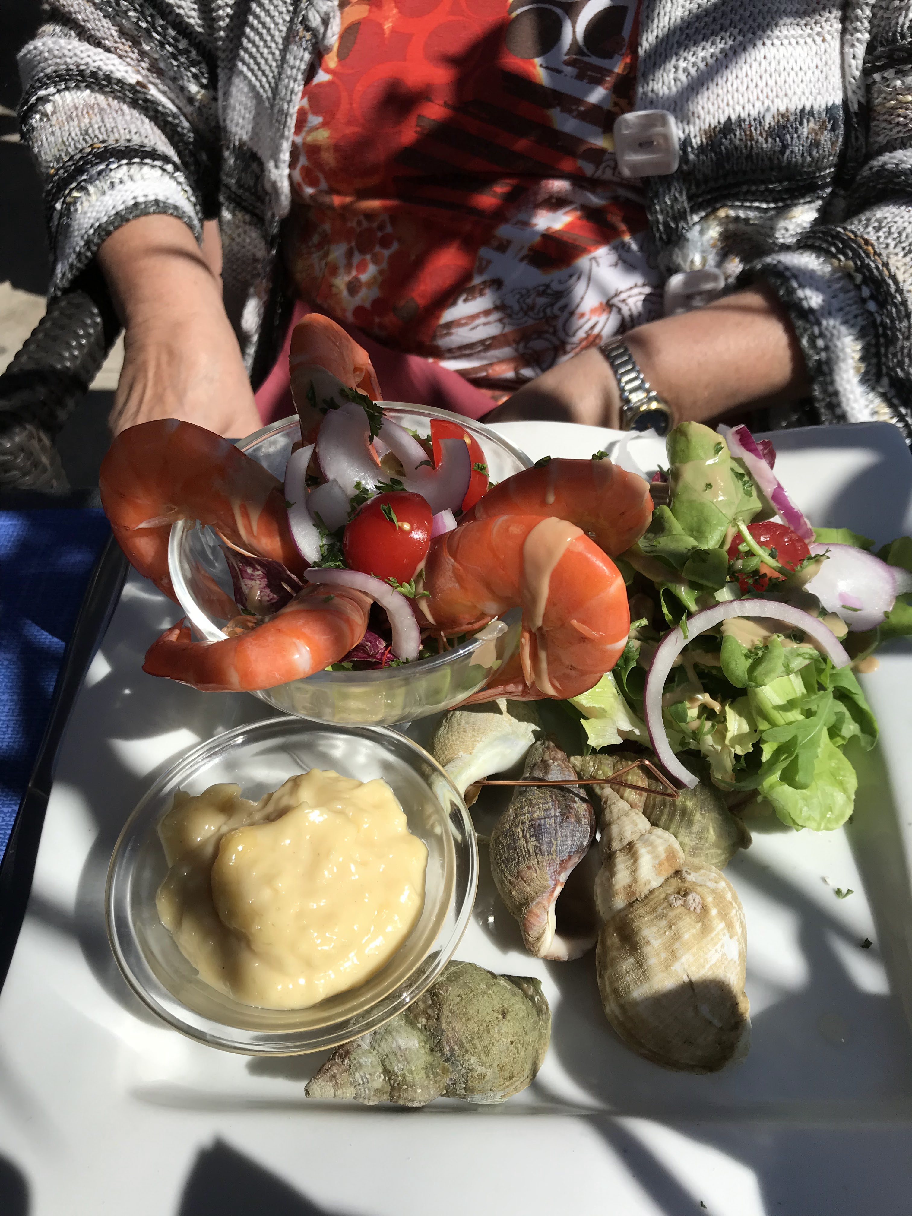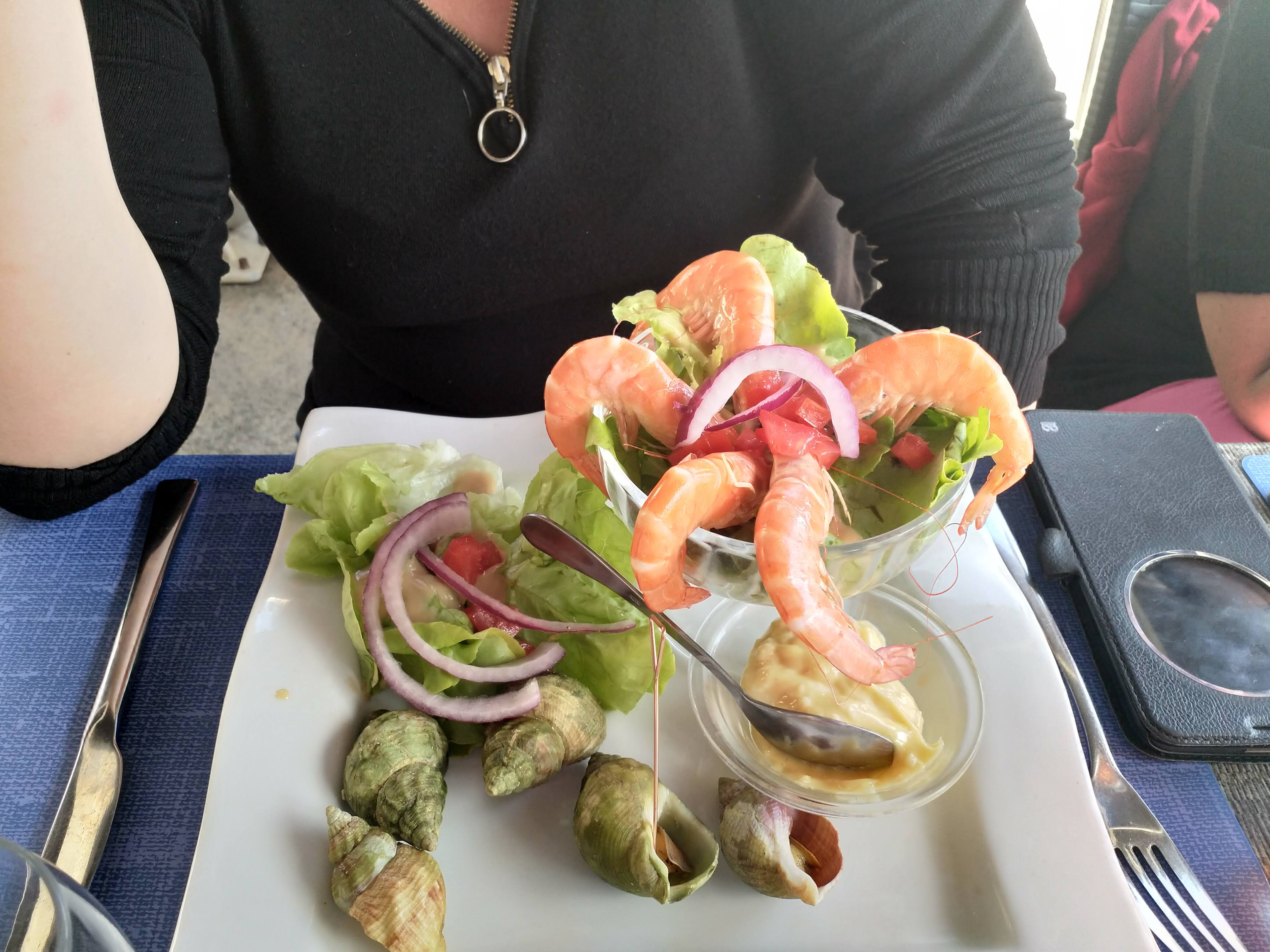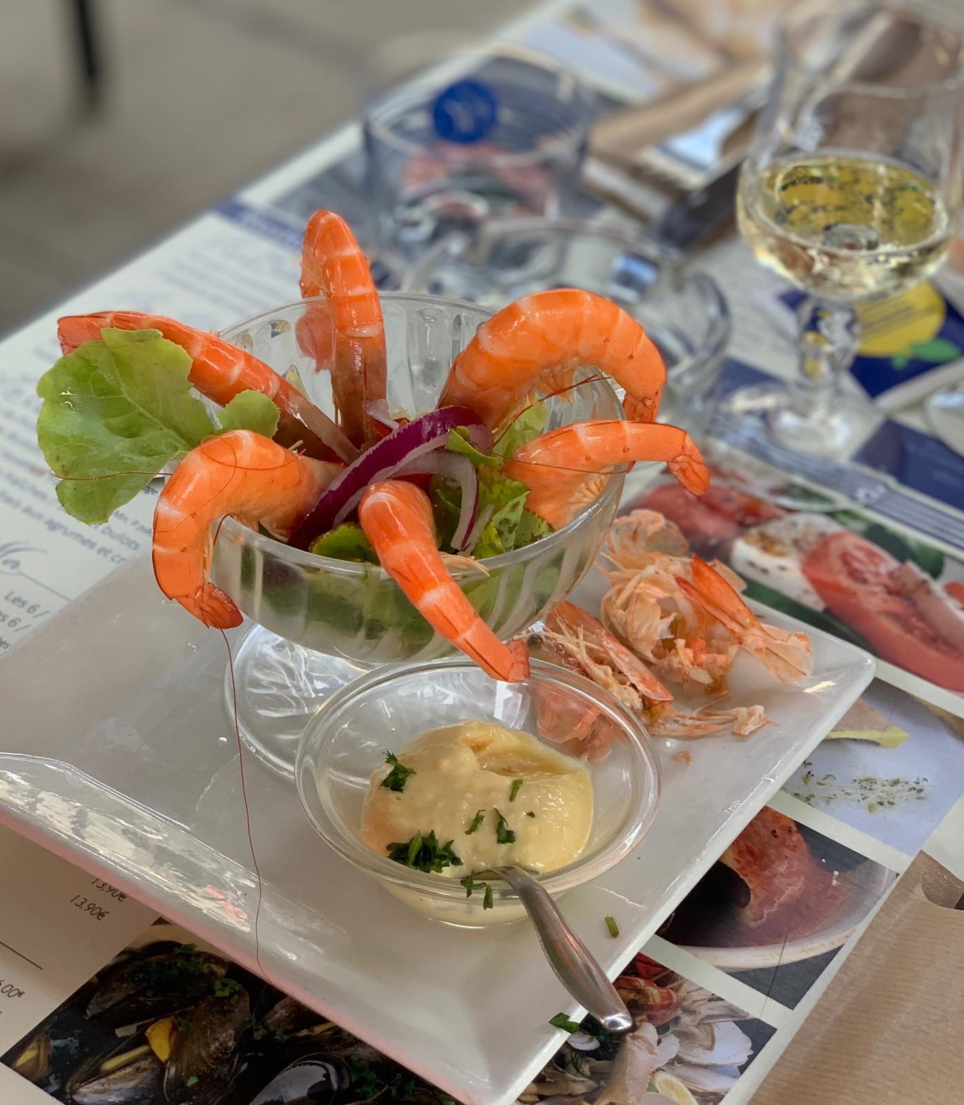 Bouquet de crevettes ,st Jacques au muscat, assiette gourmande et café gourmand, bien plat garnis et excellents sans compter les tapas de charcuterie fromage, parfzit a refaire 😁
