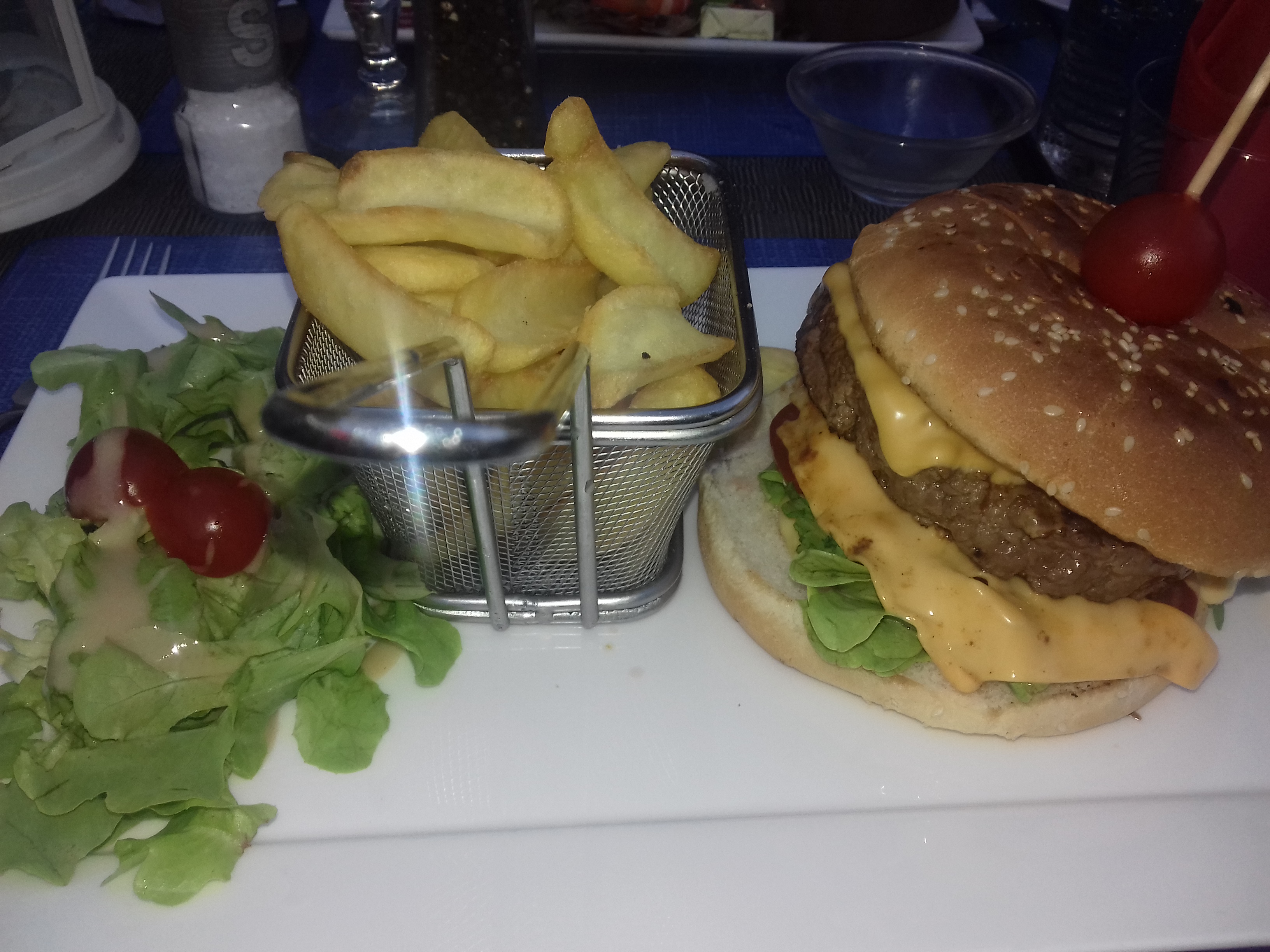 Accueil et placement rapide malgré le monde, commande effectué rapidement et servie tout aussi rapide. Assiète de frite et burger parfait cuisson respecté, burger avec gros steack et beaucoup de sauce, un régal. Personnel top, prix correct pour le lieu et la période.