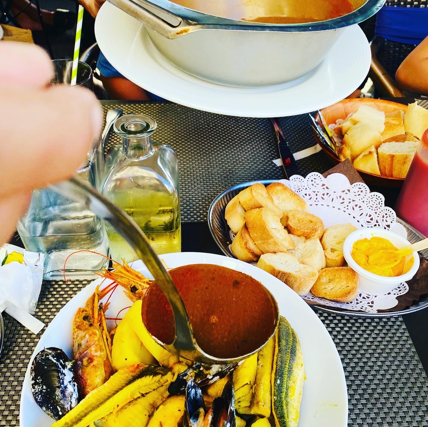 Bouillabaisse excellente pris avec pichet de vin blanc de provenance de Sete qui laisse à désiré. Trop sucré pour ce tye de plat.