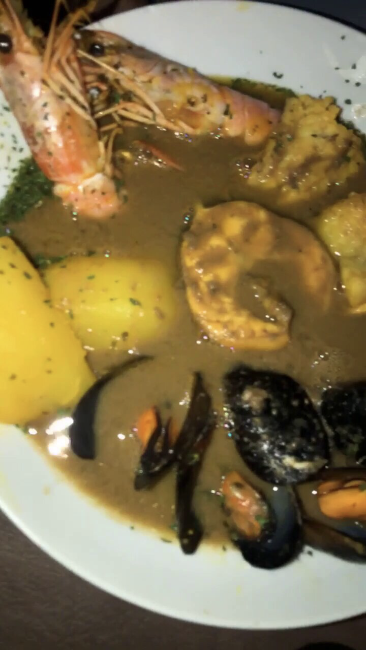 Le service était sympathique mais la nourriture était discutable. Beaucoup de sable dans les crevettes grillées (pas non plus en pilules ni ouvertes), la bouillabaisse royale n'était pas très bonne du tout - le poisson était très osseux, les pommes de terre devaient avoir été cuites un jour avant qu'elles ne soient franchement aigres et beaucoup trop porteuses ou quelle que soit l'épice jaune qui a été utilisé.