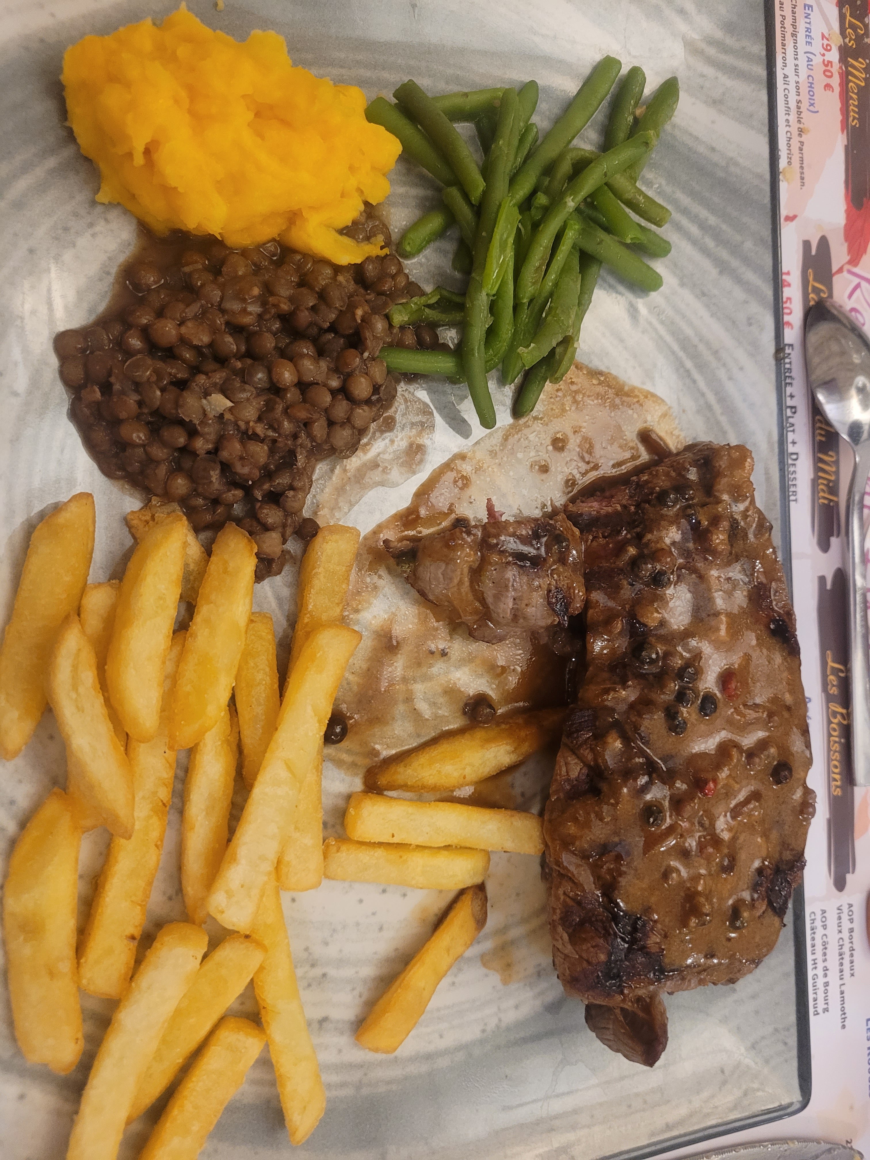 Un bel emplacement mais ça ne serait pas du luxe d'être un peu agréable avec un peu d'amabilité, heureusement qu'un petit saisonnier est là. Il mérite une petite étoile. L'apéritif était simple mais bon. L'entrée bien garni il faut l'avouée. Et le plat de résistance très bien accompagné qui mérite presque une deuxième étoile.. dommage les frites sont congelées. Dommage en effet que ce ne soit pas le la bonne cuisson et que la viande soit trop énorme pour une personne. À voir pour deux si cela vous dit. En définitif tout cela pour un total bien trop chère pour une brasserie équivalente à Buffalo Grill. *( la petit snacks en face à l'air bien plus convivial et abordable! )