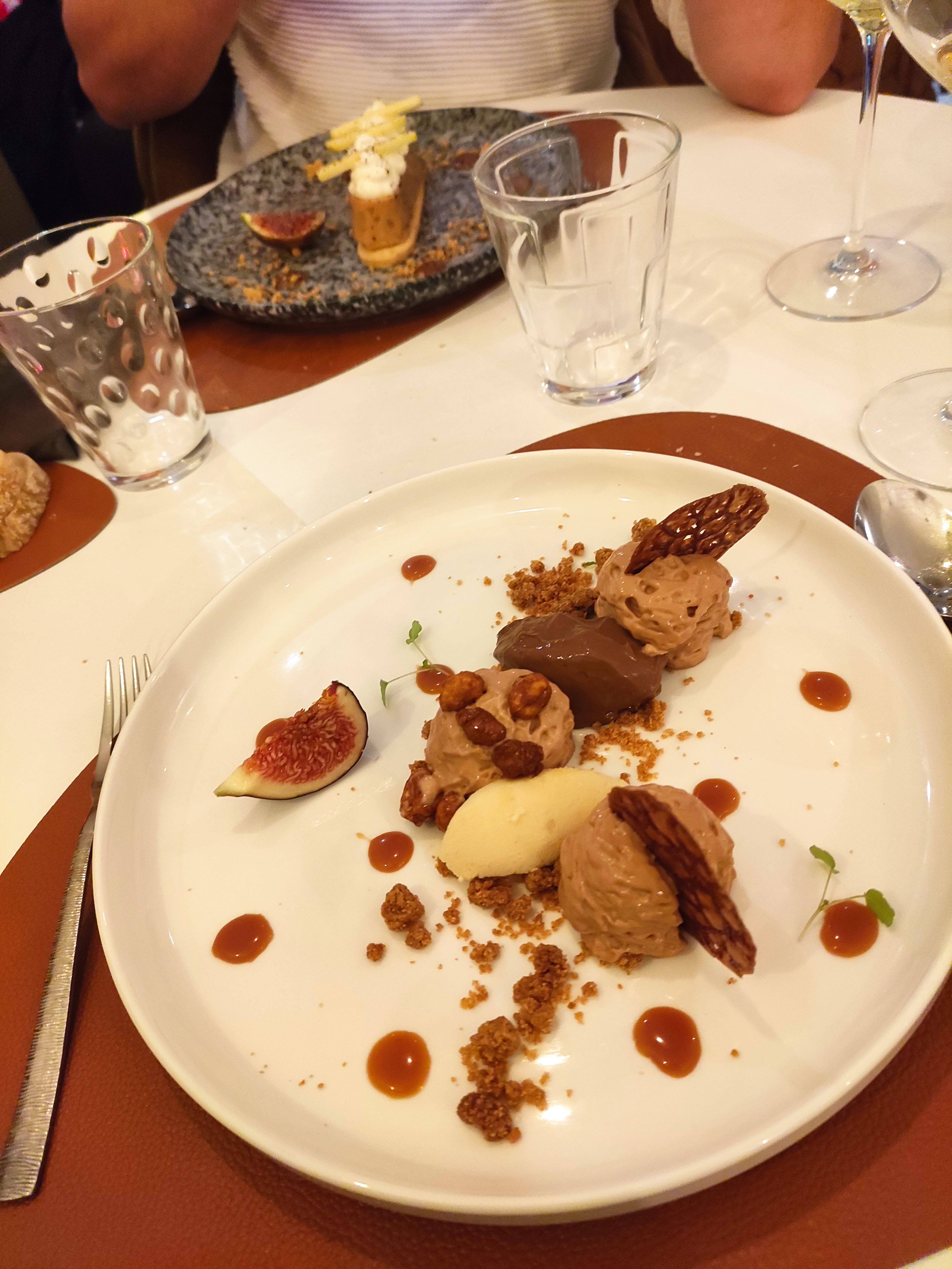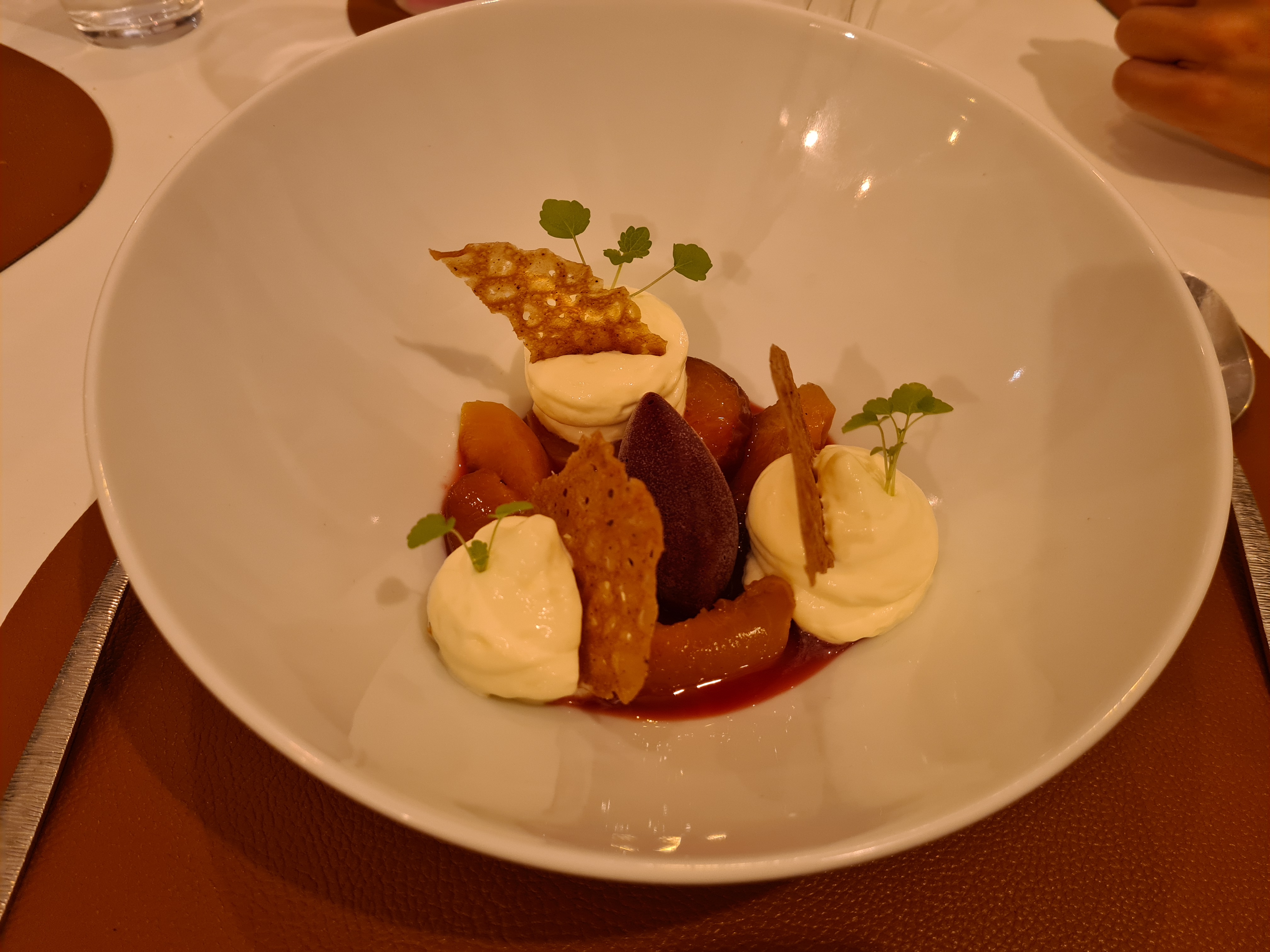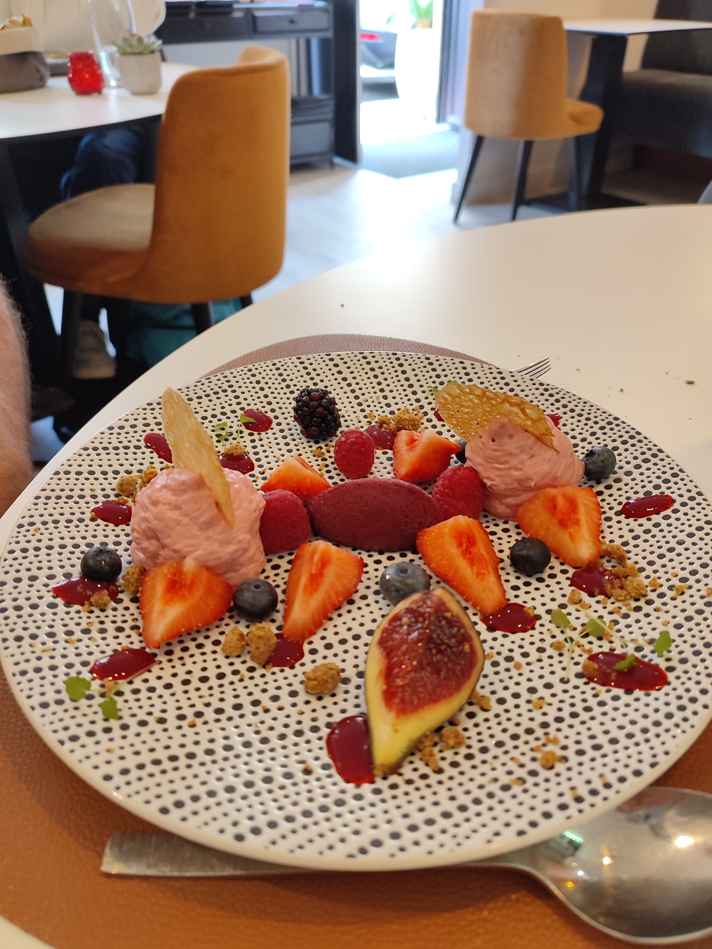 Très bon restaurant au global, c'est de la cuisine plutôt classique avec parfois quelques surprises avec des touches d'exotisme. En terme d'expérience, on passe du connu à, par moment, de l'exceptionnel (pas forcément constant selon les plats choisis). En tout cas, avec des produits de qualité, des cuissons parfaitement maîtrisées, des associations harmonieuse, on est sur une base très solide. Petite dédicace qui me tient à cœur : moi qui suis assez difficile en dessert (n'aimant pas le sucré), j'ai été séduite par la pêche pochée qui est un dessert frais, léger et équilibré dans les saveurs (pas trop sucré, doux avec la crème, pointe d'acidité avec le citron et le sorbet cassis, du craquant avec les tuiles, fruité avec le goût de pêche qui ressort bien (produit ? cuisson ? les deux ?)). Le seul petit hic est que le sorbet est trop congelé/dur rendant la dégustation moins agréable mais ça reste un beau coup de cœur pour moi. Le menu change sans doute souvent mais si vous le voyez je le recommande fortement.