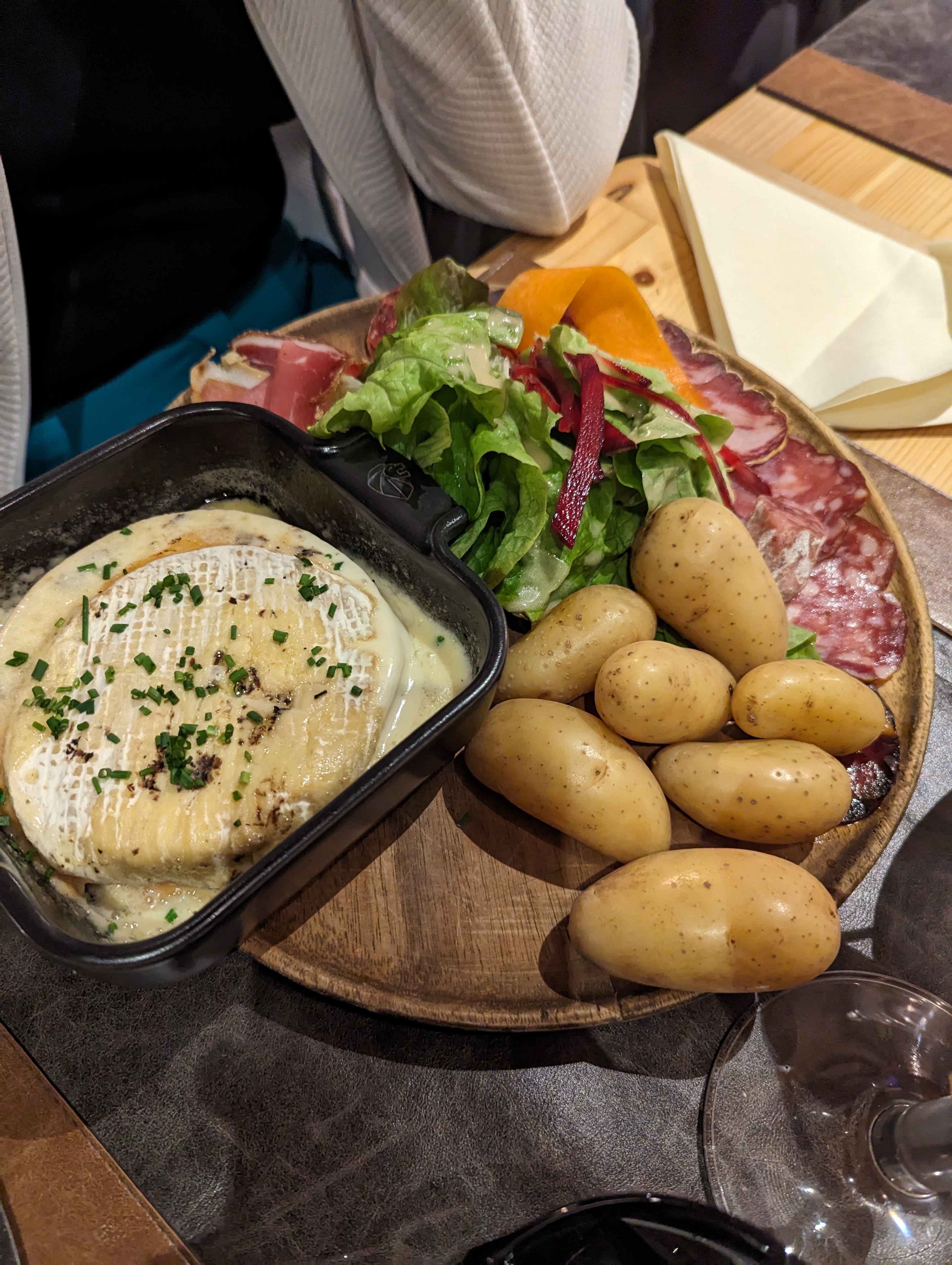 Fromage à raclette bon, charcuterie moyenne. 8 minuscules patates pour 3 personnes et le supplément pour 5 autres patates minuscules facturé 5€ Patronne détestable avec son personnel. Établissement très bruyant malgré une décoration sympathique.