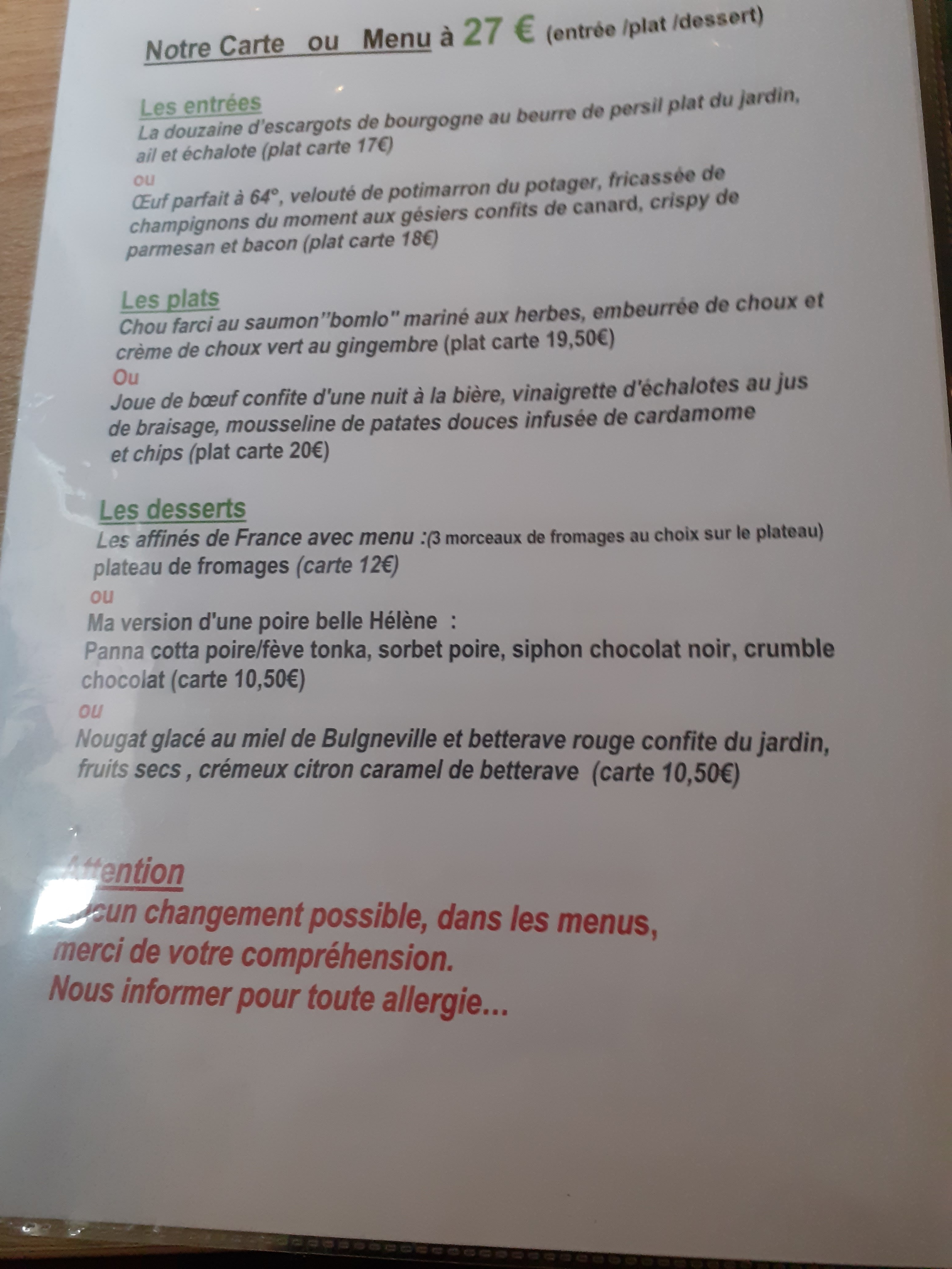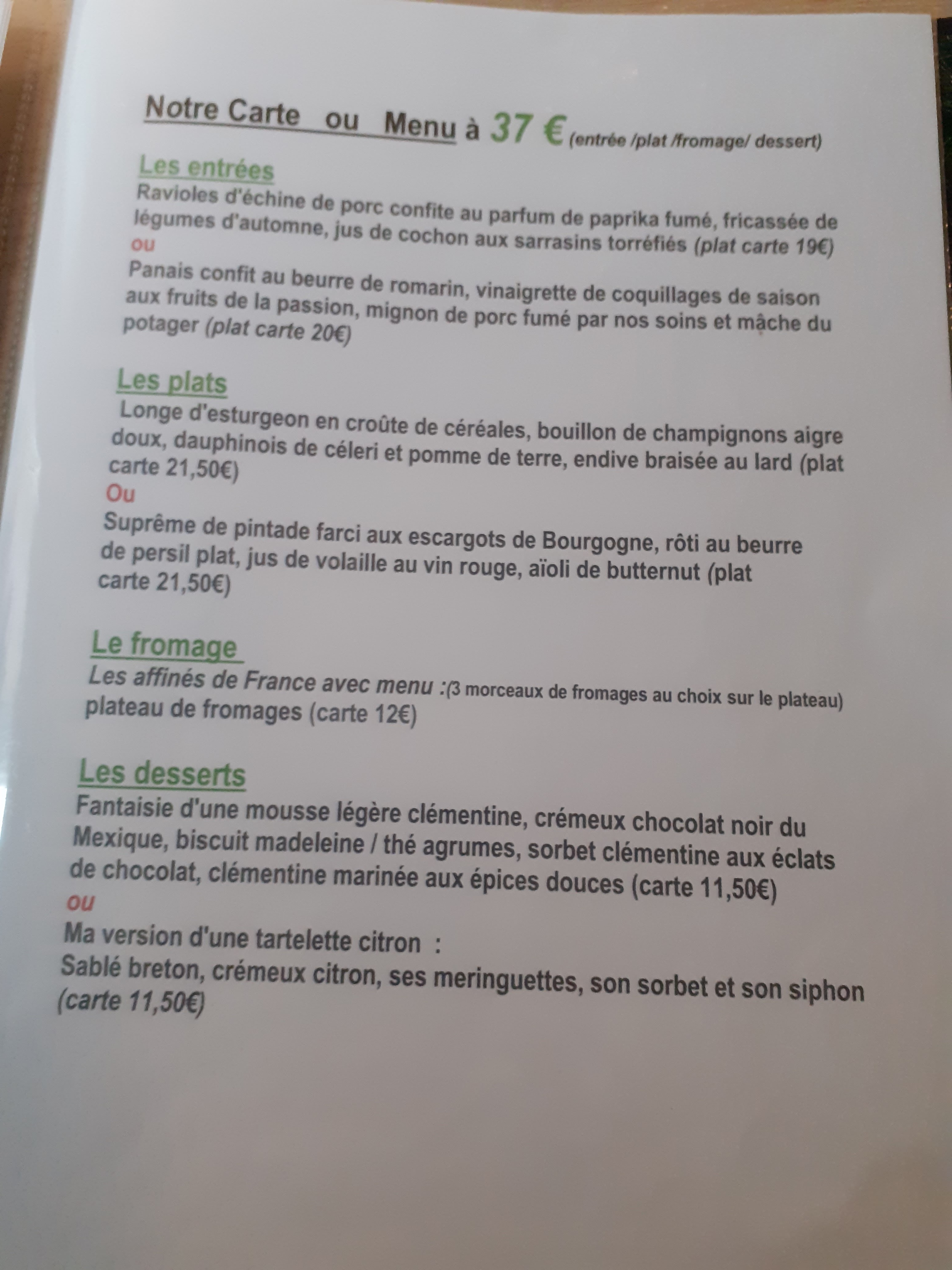 Très déçue. Nous avons demandé un changement ( avec supplément)pour un menu à 35 € qui nous a été refusé par la patronne limite désagréable. Des amis, habitués de ce restaurant, ont décidé, comme nous de ne plus y retourner. Les plats sont originaux mais je ne vois pas l'intérêt de mettre des rondelles d'andouilles avec de l'omble chevalier.Peu de sourire, sauf au paiement.