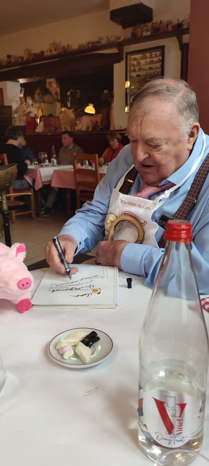 Lieu très convivial qui respire l'authentique esprit brasserie ! Tout était excellent : plats et desserts sont faits maison, c'est un pur régal ! Il y a des cochons partout : au mur, au plafond, et même sur la cravate du patron. D'ailleurs, sur l'addition aussi ils margent comme des cochons. En effet, c'est le seul point où j'ai quelque chose à redire: autant toute la nourriture est vraiment succulente, autant j'ai trouvé tous les prix un peu excessifs. J'étais seul, et pourtant j'en ai eu pour 50€ pour plat + dessert et 1 verre d'alcool.. Je trouve dommage que les prix à la carte ne soient pas inscrits. Les seuls prix affichés sont ceux des menus, étonnant! Comme s'il était interdit ou impossible de commander en dehors du menu.