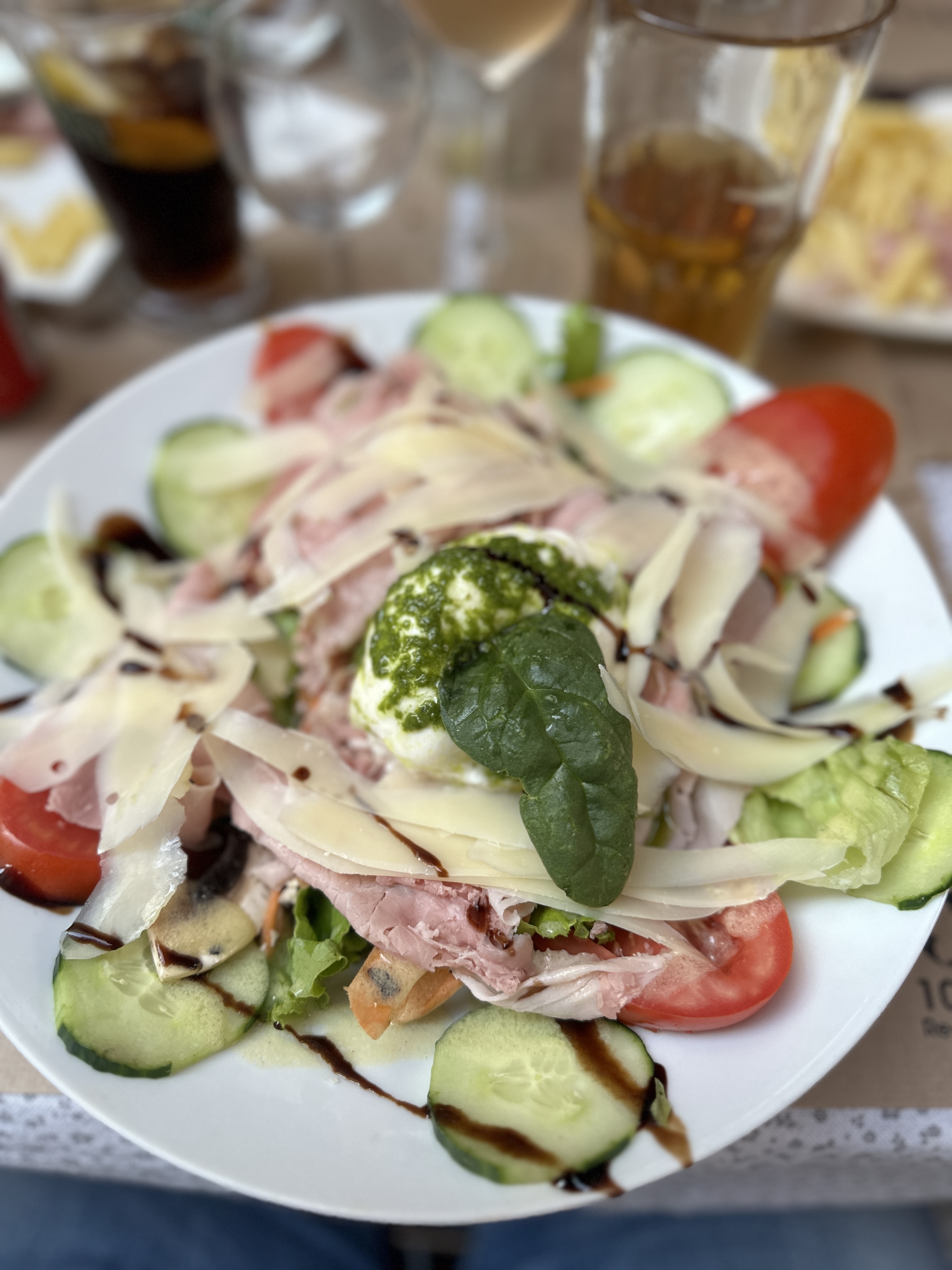 Restaurant Excellent, familial, Convivial, très bonne cuisine. Nous avons pris 2 salades, 1 végétarienne et 1 Italienne avec de la burrata à tombé parterre.
