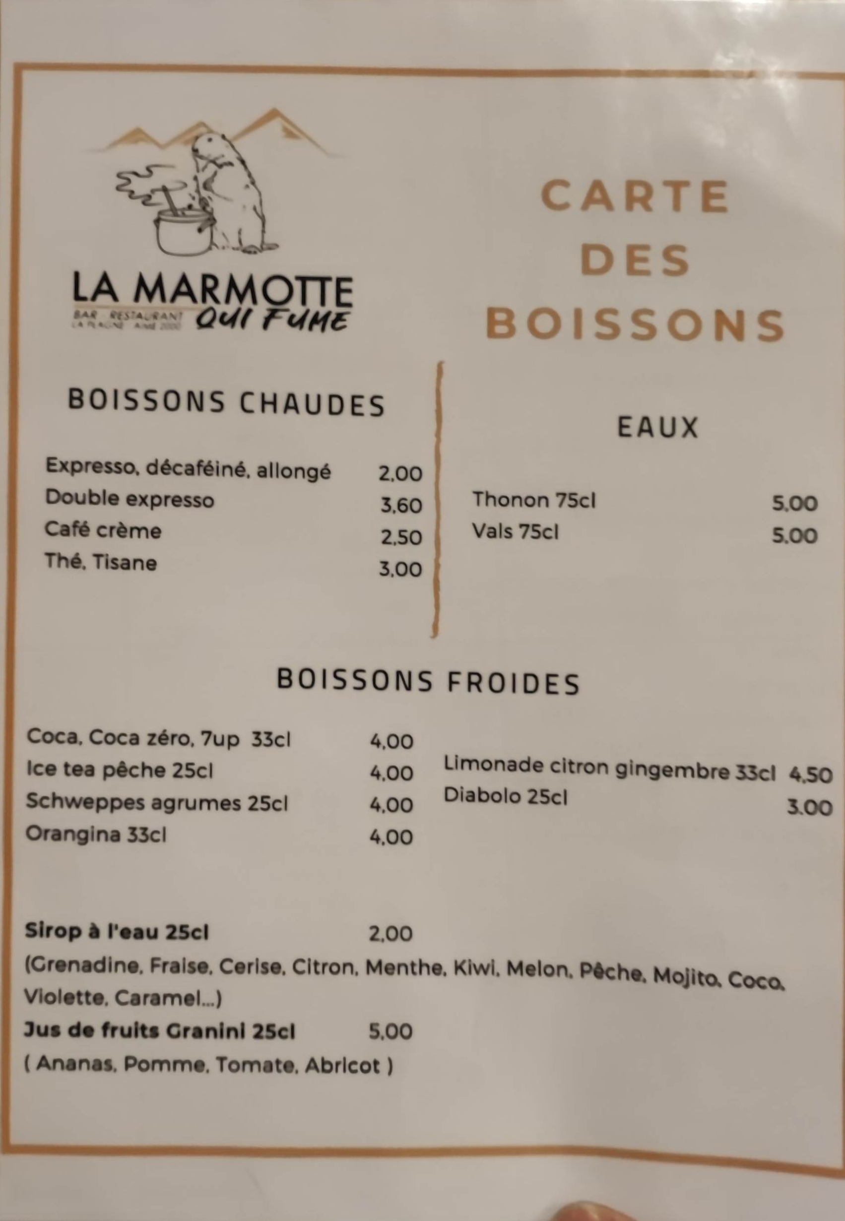 Merci à Seb de Sport 2000 Plagne village de nous avoir indiqué l’adresse de la marmotte. La cuisinière a bien fait de changer de carrière!! Cuisine de dame découpe de la viande aux petits oignons légumes hum hum, du délice du bonheur !! Ptite carte qui prouve bien le respect des produits premiers. Les prix rien à dire la carte des vins du velours ! Un jurassien avec son amoureuse heureux de cette soirée ! Nous espérons revoir votre serveur cette hiver. Les desserts je dis rien vous avez compris. Vraiment bravo pour un resto de station! Pour la dame qui nous a vendu le chablis à notre sortie. J’aurai une pensée toute particulière à son égard à notre retour du roc du bécoin à 12h demain ! Bel établissement bonne continuation! Nous reviendrons dans 13 jours à la Plagne avec un colis pour les garçons que vous connaissez à Plagne village, je pense aussi à notre Madeleine ! J’espère que les filles de la marmotte qui fume en profiteront aussi ! On surveille de loin. Merci pour vos talents mes dames . A bientôt…..