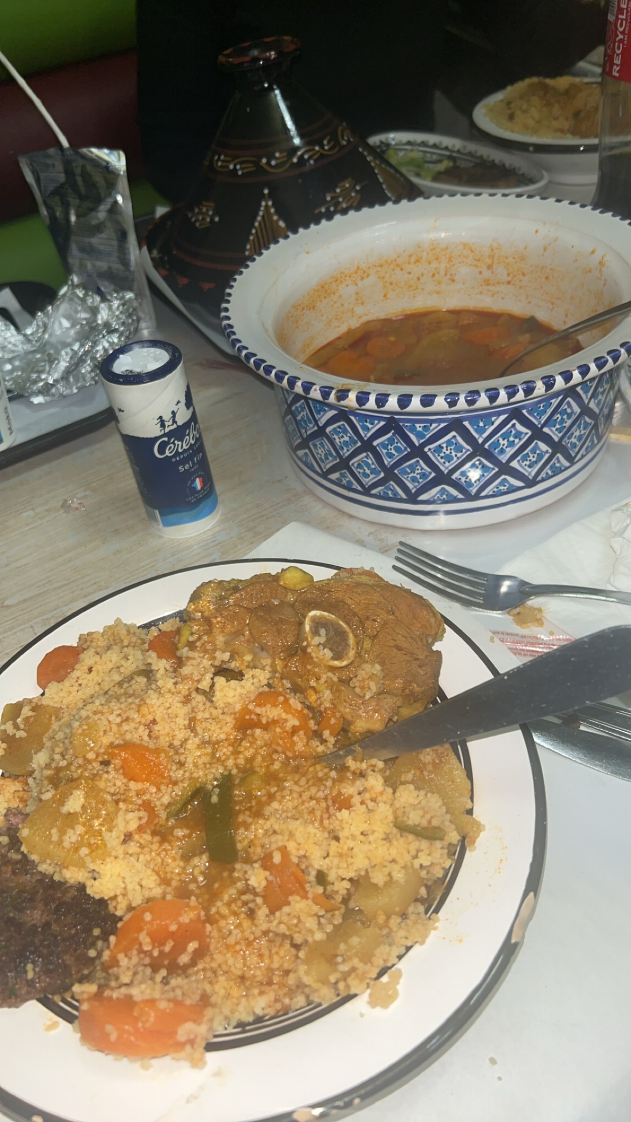 Nous avons eu un couscous royal et une assiette de poulet, les deux étaient bons, nous avons particulièrement apprécié le couscous. Le cadre n'était pas génial (peu de plats à emporter) mais le personnel était sympathique