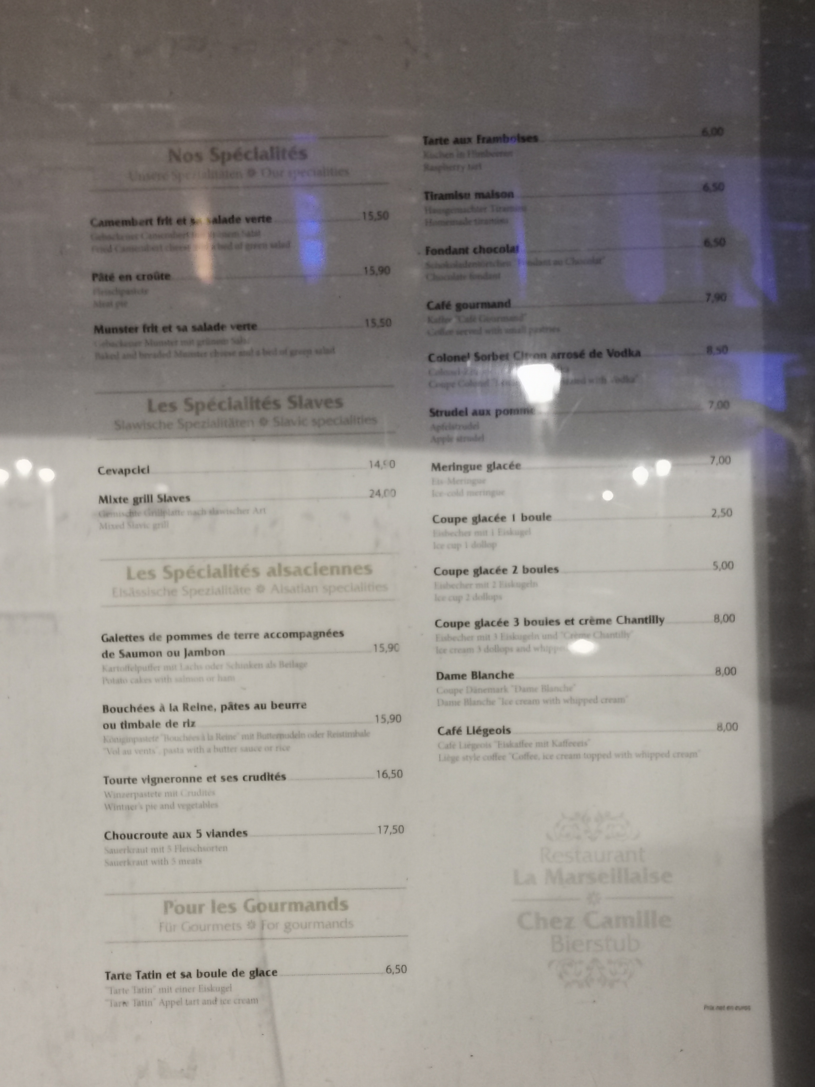 Comme dirait un commentaire précédent, un repas sans honte ni gloire. Mais quelle tristesse de se voir servir des plats qui ne sont qu’un assemblage d’éléments industriels. Le pire étant les « spécialités » qui n’ont que de spécialités que le nom puisque clairement, n’était fait maison :/ On dira qu’a cause du lundi 26 décembre (jour férié en alsace) et qu’ils auront au moins eu le mérite de nous nourrir