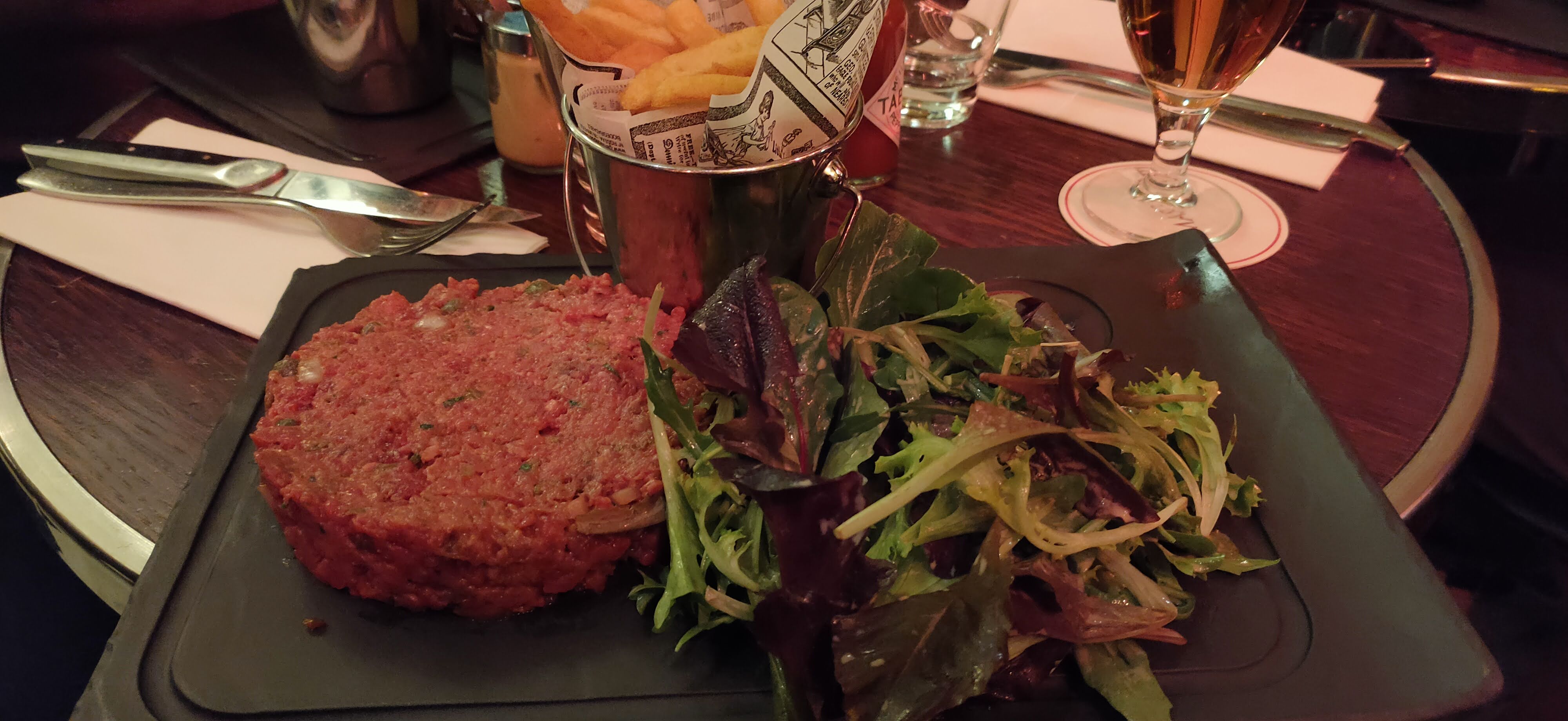 J'ai mangé un midi dans ce restaurant. J'ai pris un tartare de boeuf avec des frites salade. Service avenant et efficace. Plat bon et quantité et prix corrects. Pris d'assaut à midi.