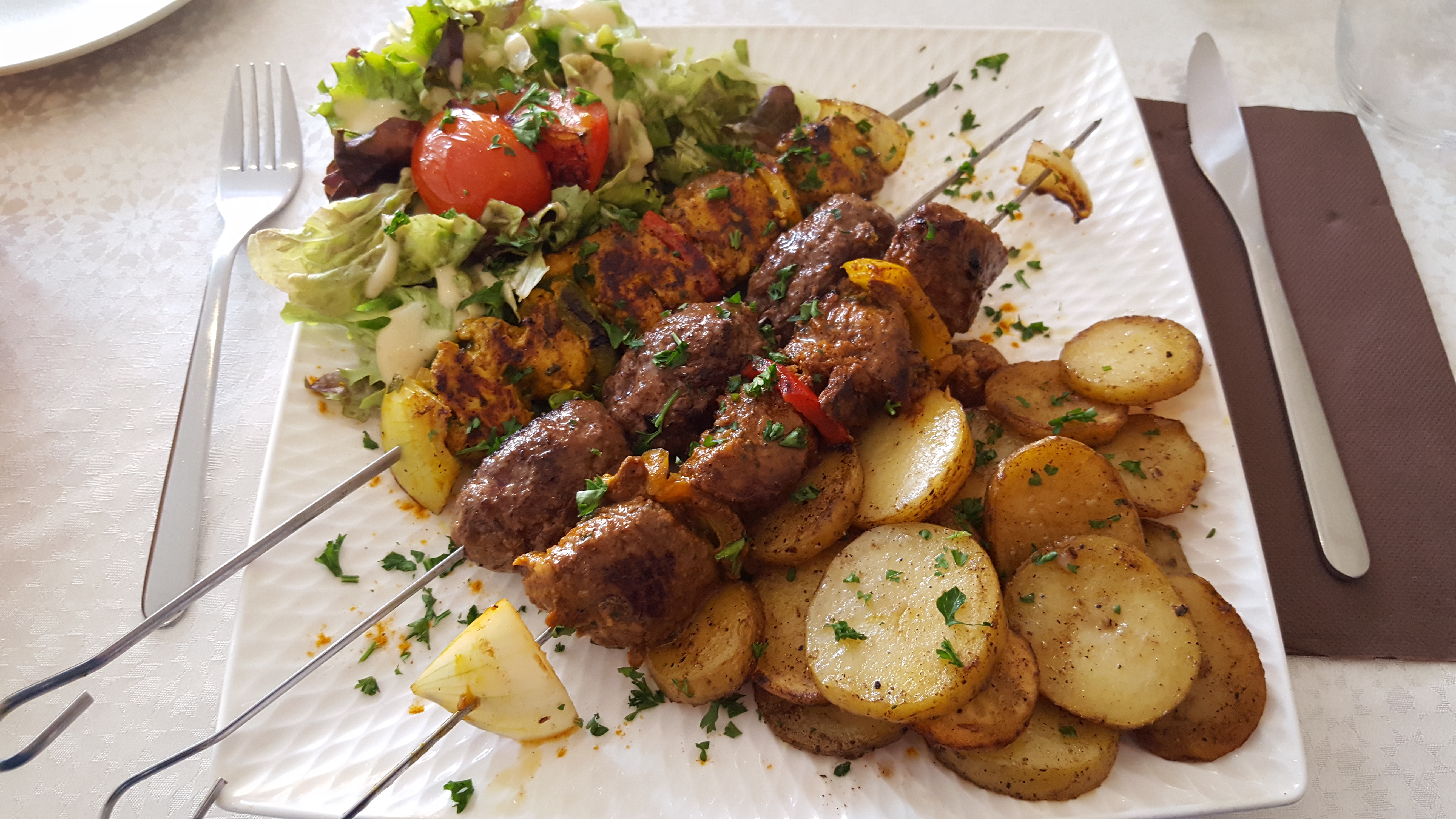Très bonne accueil mais très déçu du repas 6 euros 2 samoussa thon et boeuf avec salade sans goût marocain et après pris tajine de poisson 3 crevettes et un bout de poisson blanc et pomme de terre carotte mon compagnon à prit brochette de boeuf et poulet pomme de terre très sec réchauffé du midi on pense pas.du tout goût marocain on ira plus c'est sûr