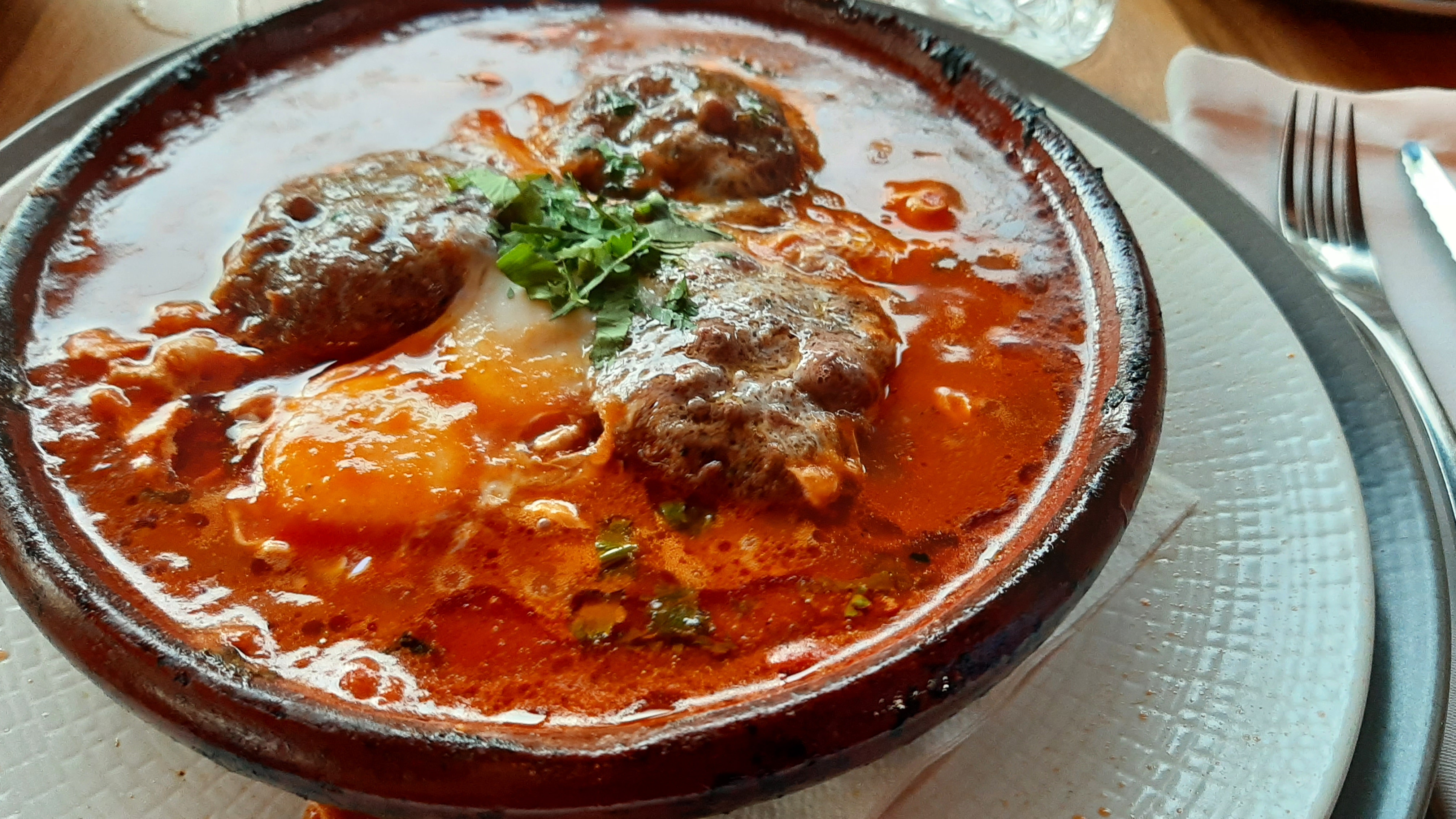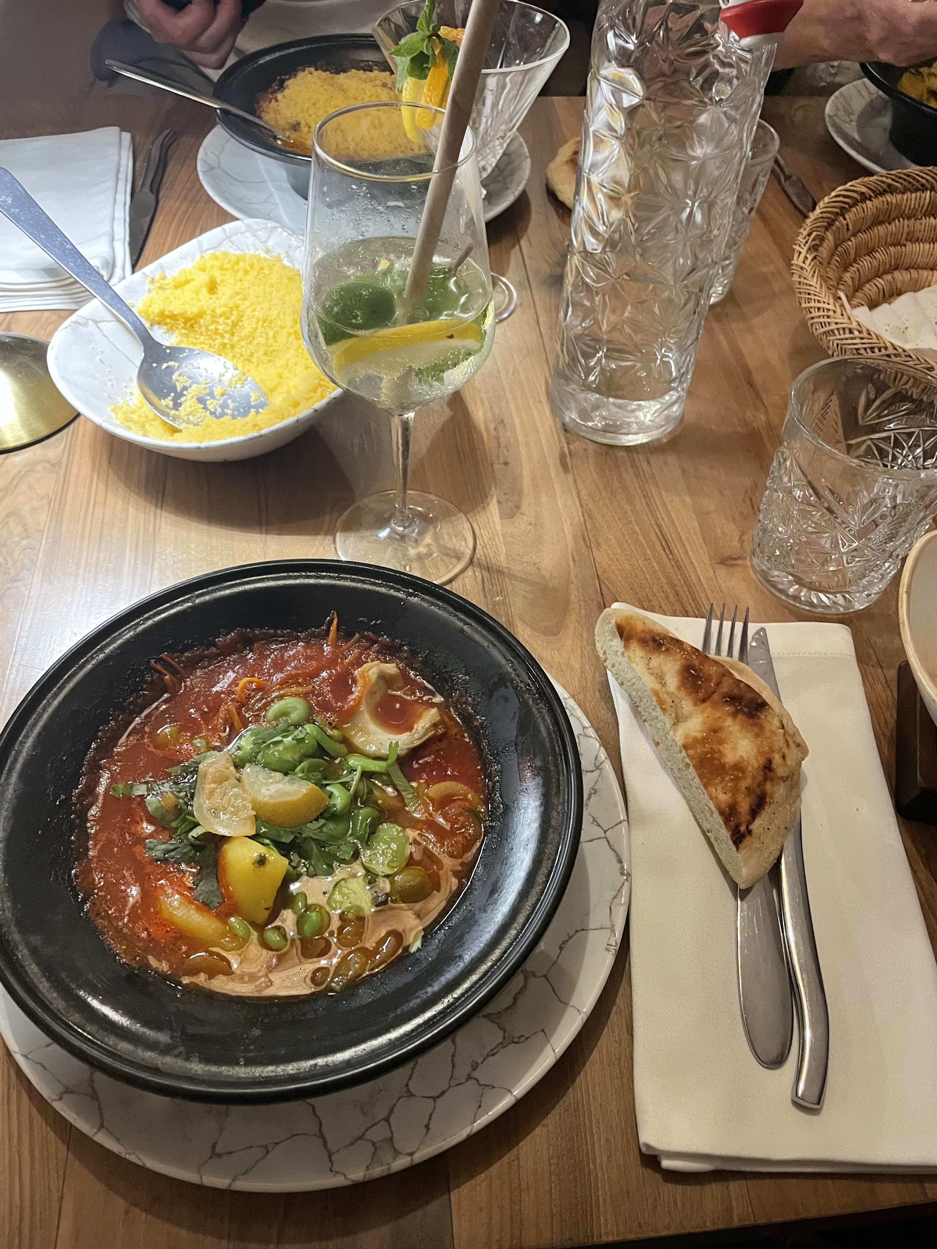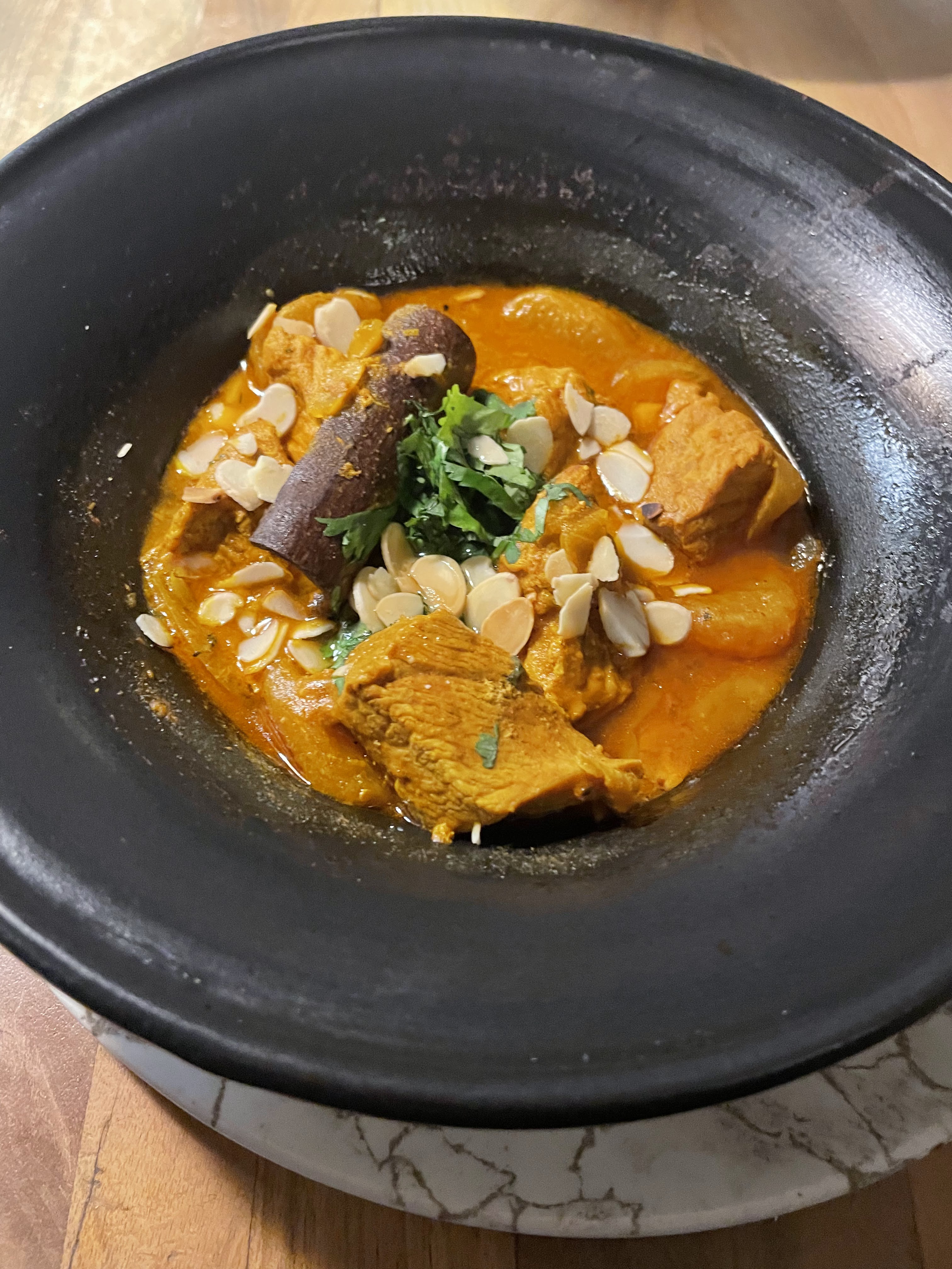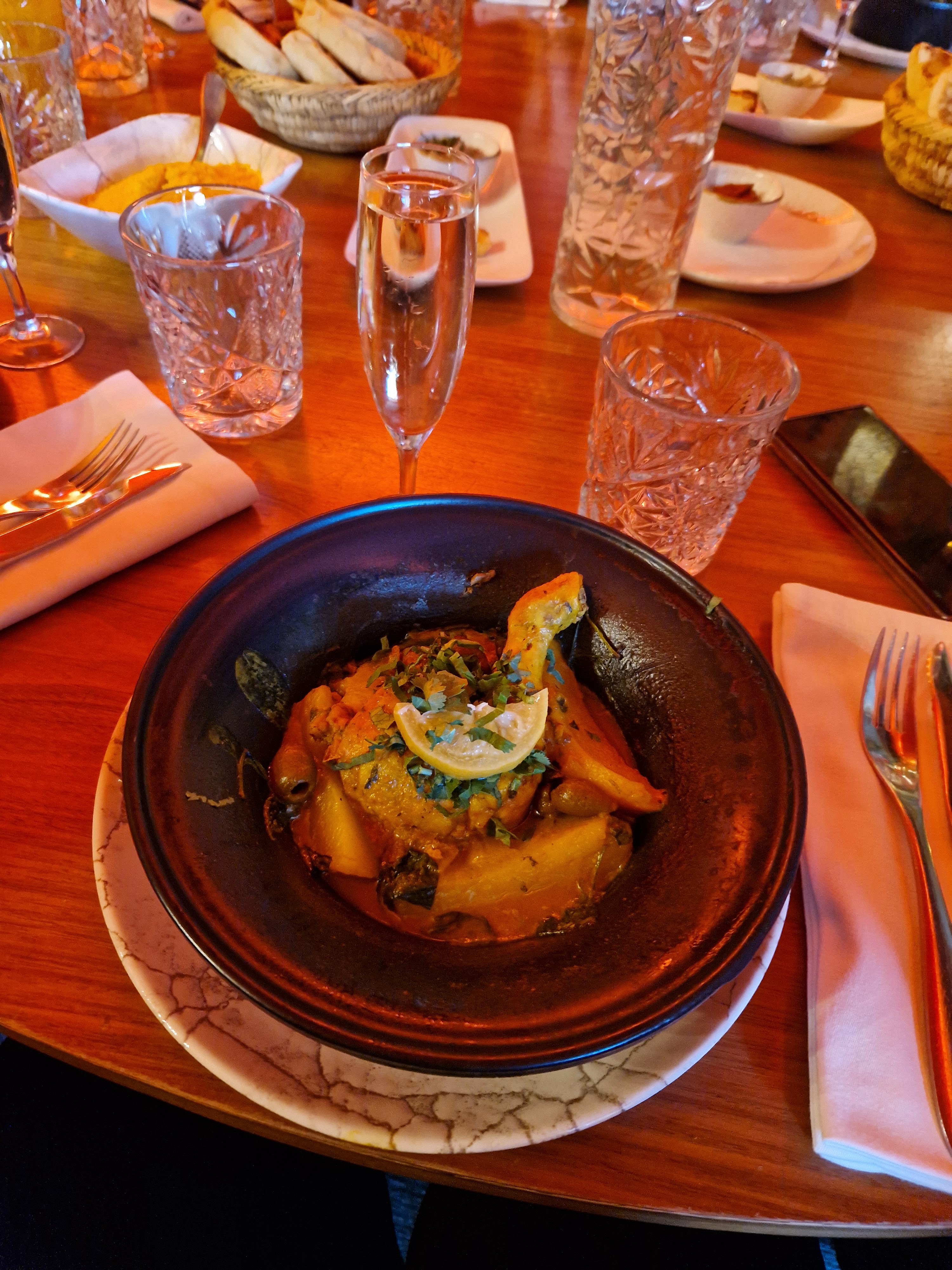 Fade.... pas de goût.... les tajines sont minuscules. Servi dans une assiette blanche creuse. Le thé à la menthe est juste sucré. Bof bof.... déçue. Je m'attendais à mieux. Par contre très joli décor et bons vins. Bon service également