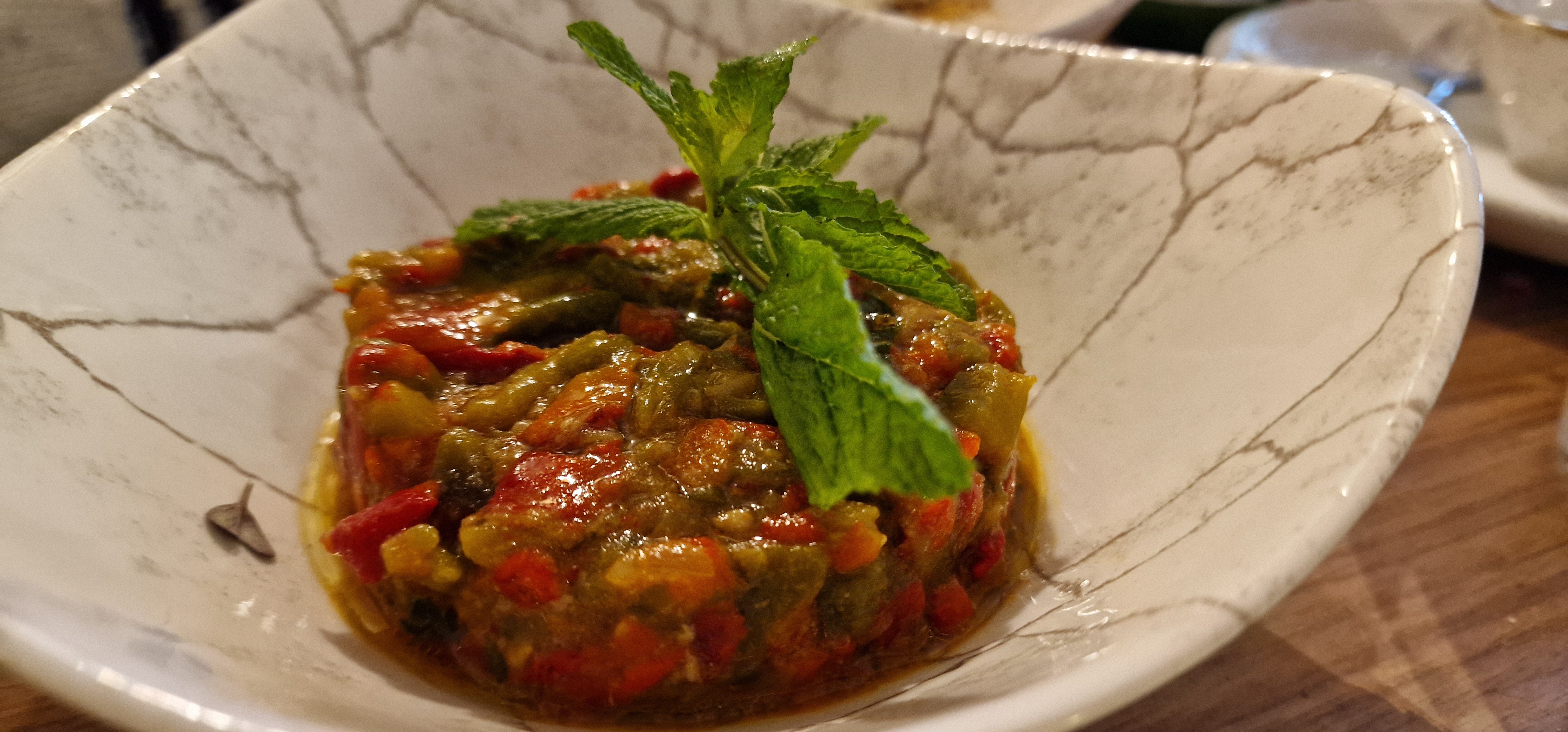 Toujours la même sensation un peu partagée en sortant de la menthe douce Une cuisine assez raffinée au dessus de la moyenne dans une décoration tres soignée Mais le sentiment partagé vient de l'accueil du personnel qui est poli mais totalement mécanique impersonnel et sans chaleur ce qui donne la sensation d'être un pion dans le fonctionnement économique de l'établissement C'est dommage et ne ressemble pas à l'âme de l'accueil marocain On y revient quand même pour la cuisine et le lieu