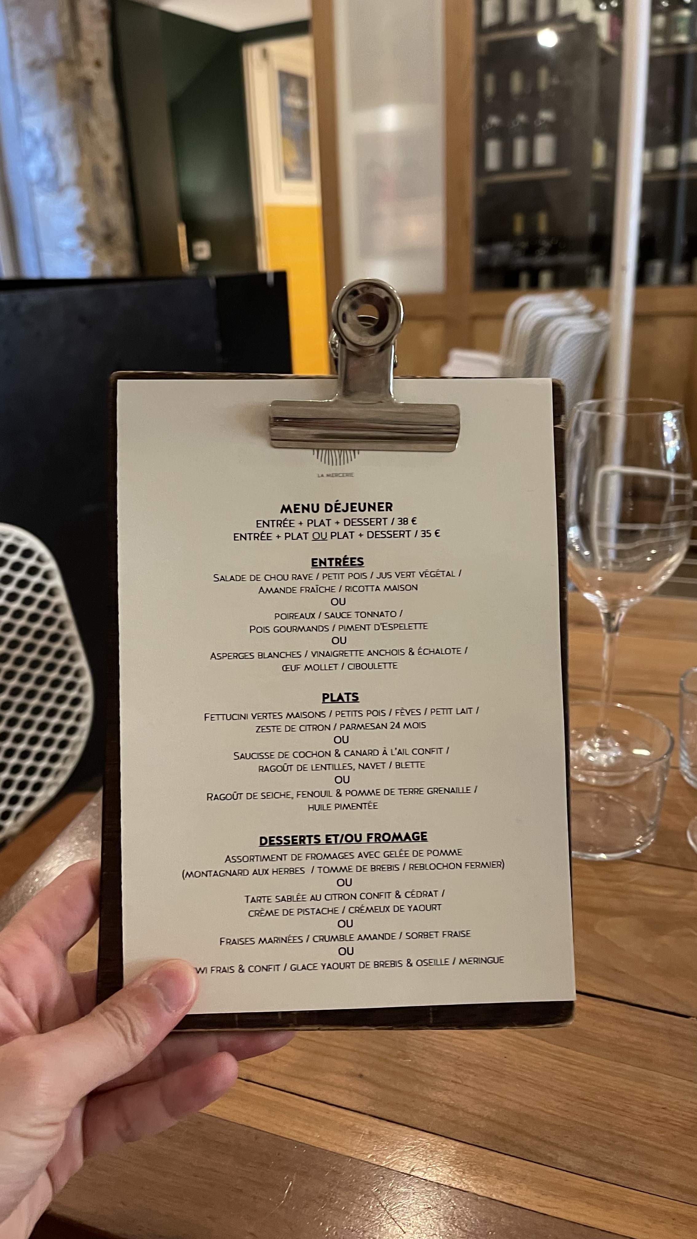 Top. De la cuisine avec un vrai C majuscule. Ca se la pète pas mais ca bosse. Chapeau l'équipe. Je vous souhaite que du bon. On reviendra et pas qu'à l'occasion. Un bon petit vin en biodynamie a 47e rond et minéral à la fois. Une formule à 35e pour cette qualité on ne peut vouloir qu'y aller. On était 4 on est tous sous le charme. Merci la mercerie. Menton plus plus pour les desserts je n'en prend presque jamais et j'ai regretté lorsque mon épouse m'a fait goûter le sien