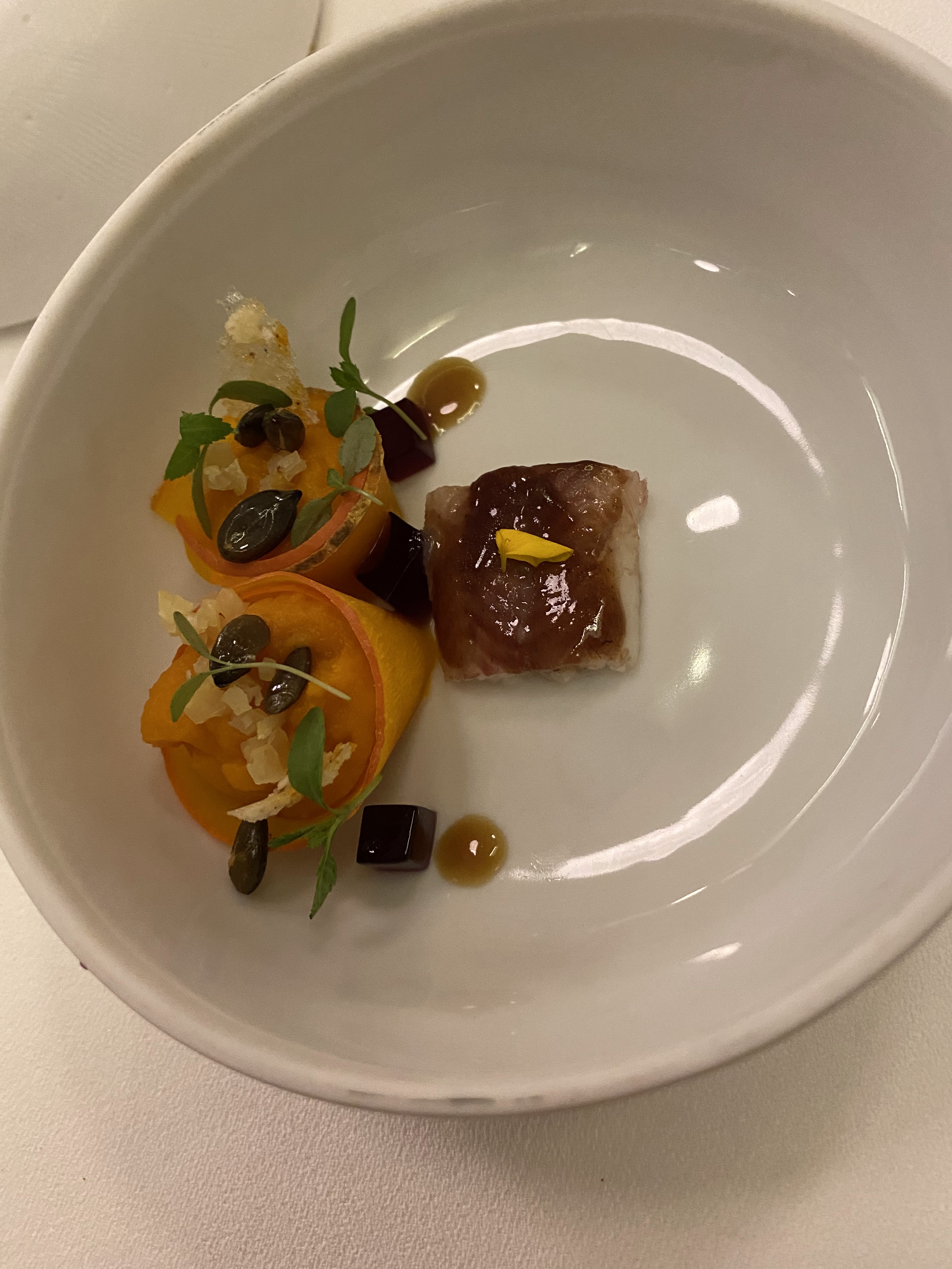 Du début à la fin parfait un régal pour les papilles. Nous avons eu même droit à la visite du chef cinq Plats et cinq vins en accord avec le plat magique la jeunesse, sommelière nous as régalé de ces explications. On voit qu’elle aime ce qu’elle fait un restaurant qui mérite bien ces deux étoiles. À refaire. Merci à toute l’équipe pour leur travail et au chef.