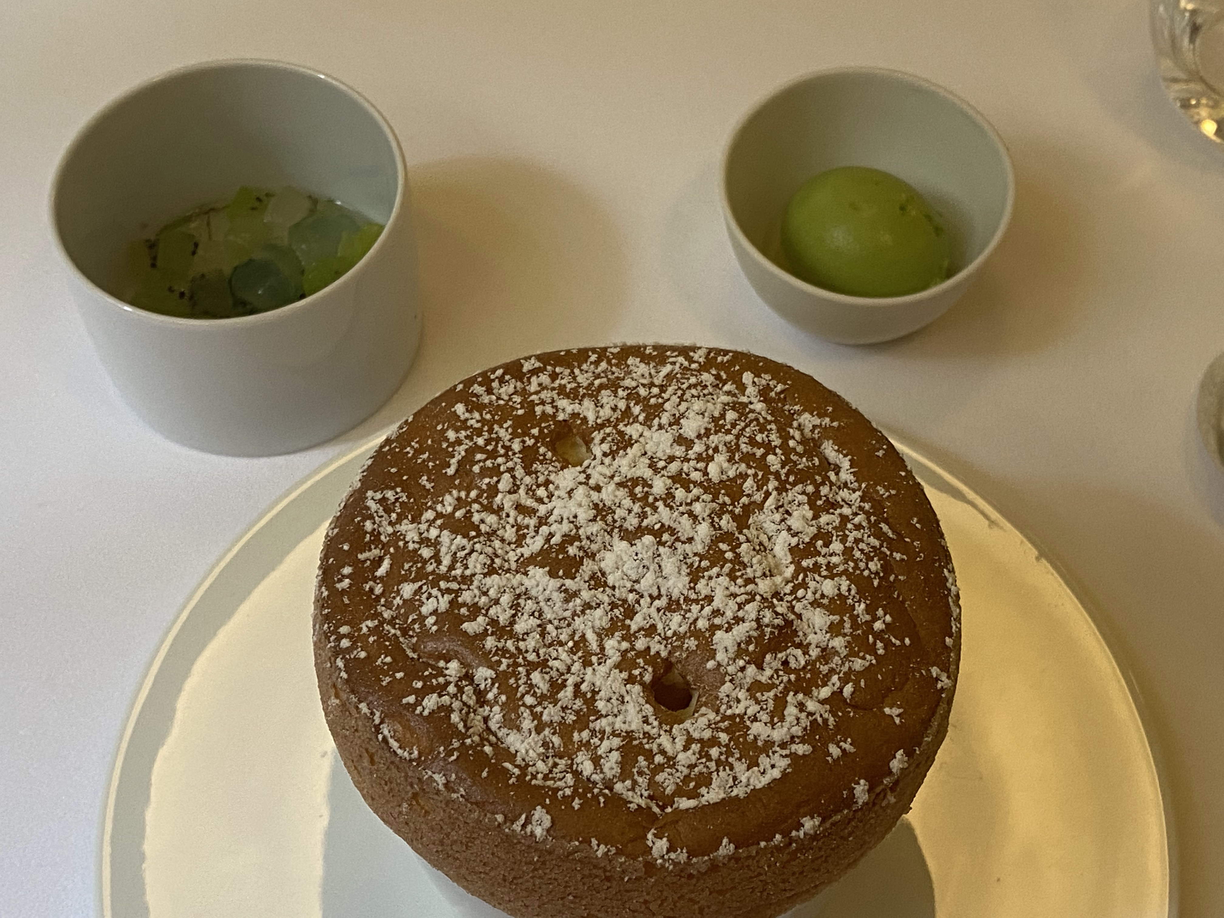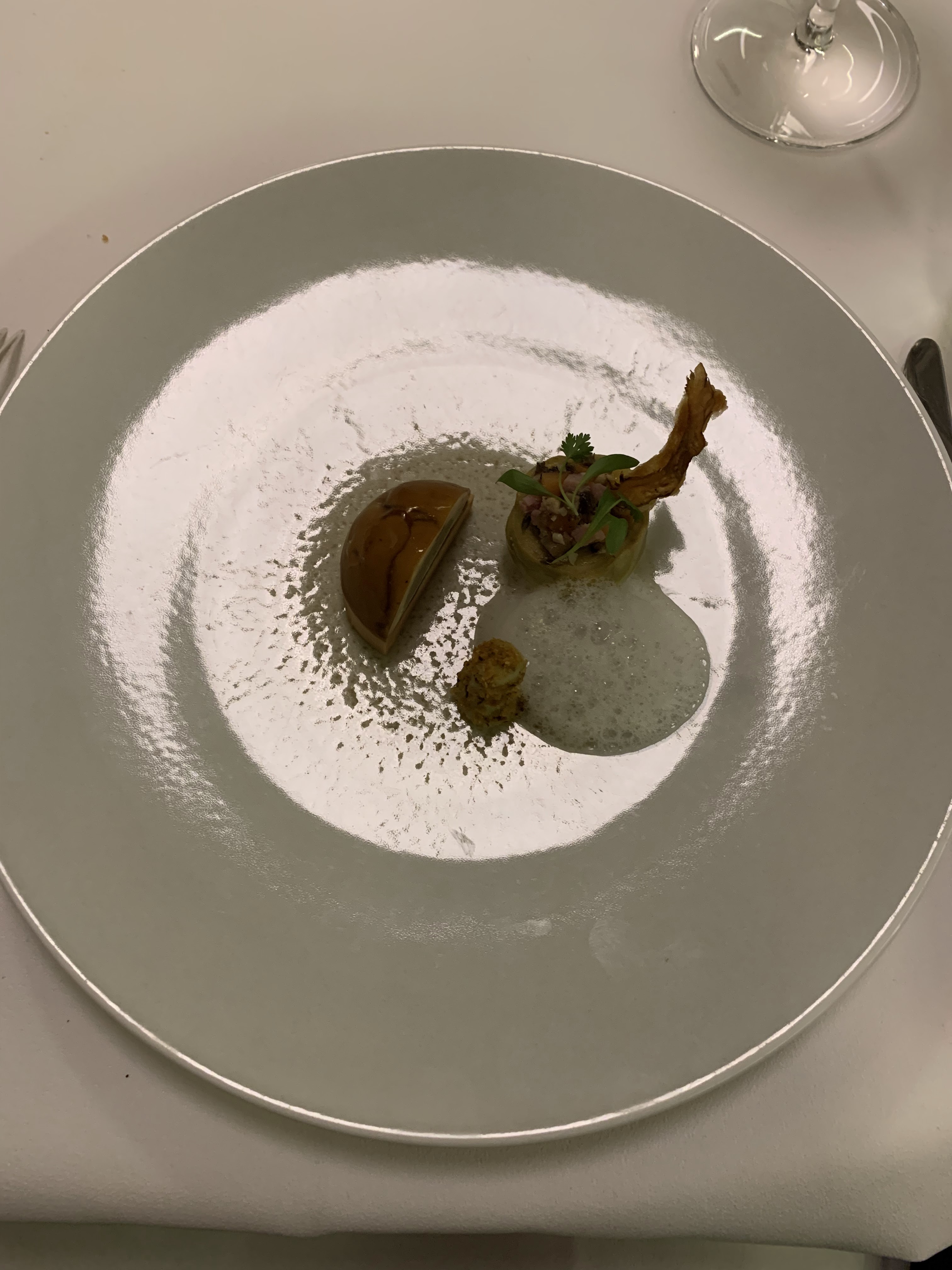 La nourriture était divine. Le plat artichaut foie gras restera un souvenir délicieux. Pourquoi une note de 3 étoiles? Certaines choses ne sont acceptables dans un 2 étoiles. - J’avais précisé lors de la réservation qu’un convive ne mangeait pas de gluten. Pas de pain adapté n’était disponible, c’est la première fois que nous voyons cela dans un étoilé, qui normalement font en sorte d’en avoir à disposition. Un repas sans pain est décevant. - Le dessert, pourtant commandé en début de repas, arriva très tard. Nous avons attendu 30+ minutes, sans un mot d’excuse ou d’explication. - L’atmosphère est froide. Les tables à côté étaient très silencieuses et nous étions la seule table à discuter, ce qui créa une ambiance étrange. Un fond musical serait apprécié, certains étoilés arrivent à créer une ambiance musicale délicieuse et adaptée.