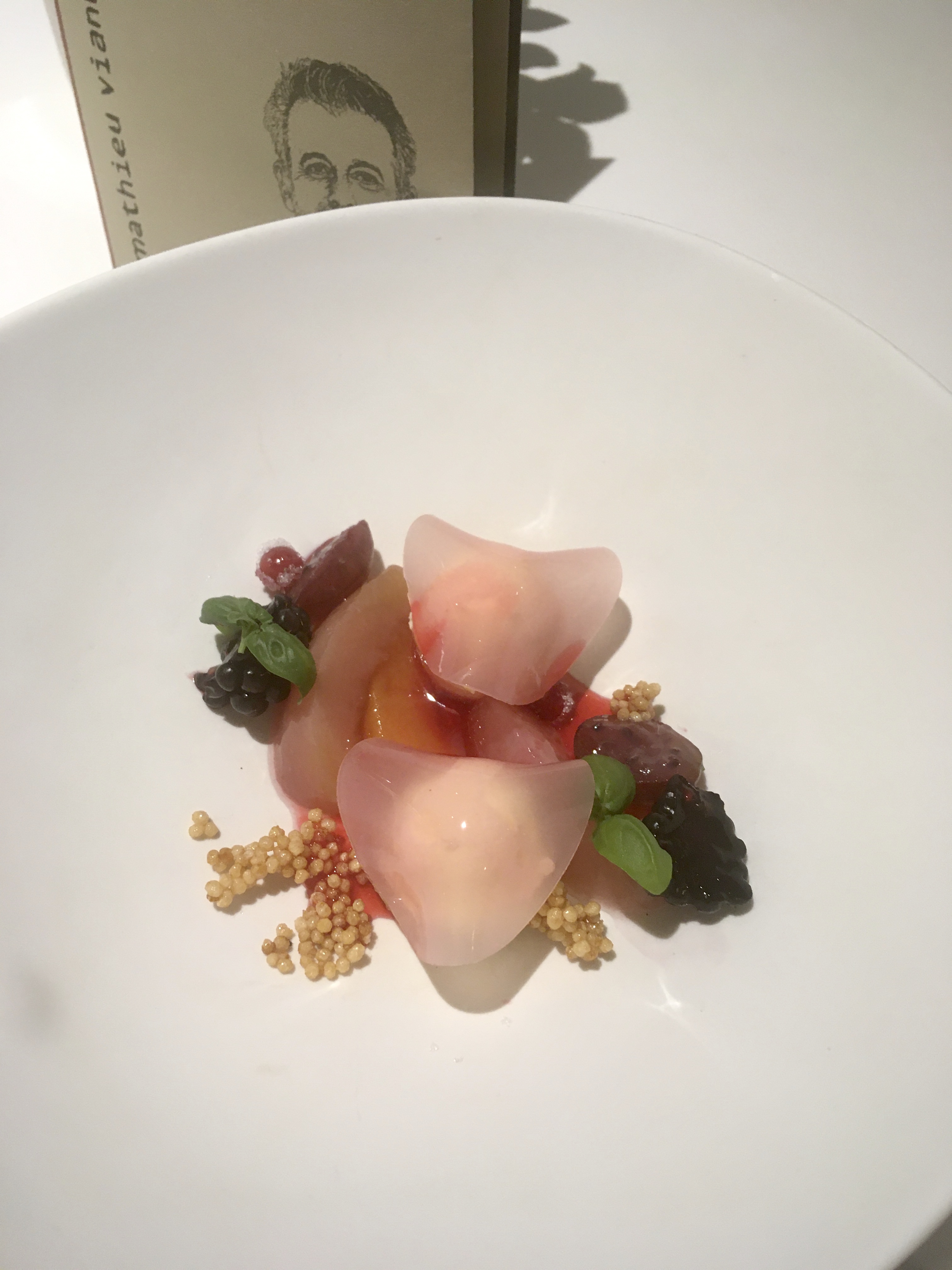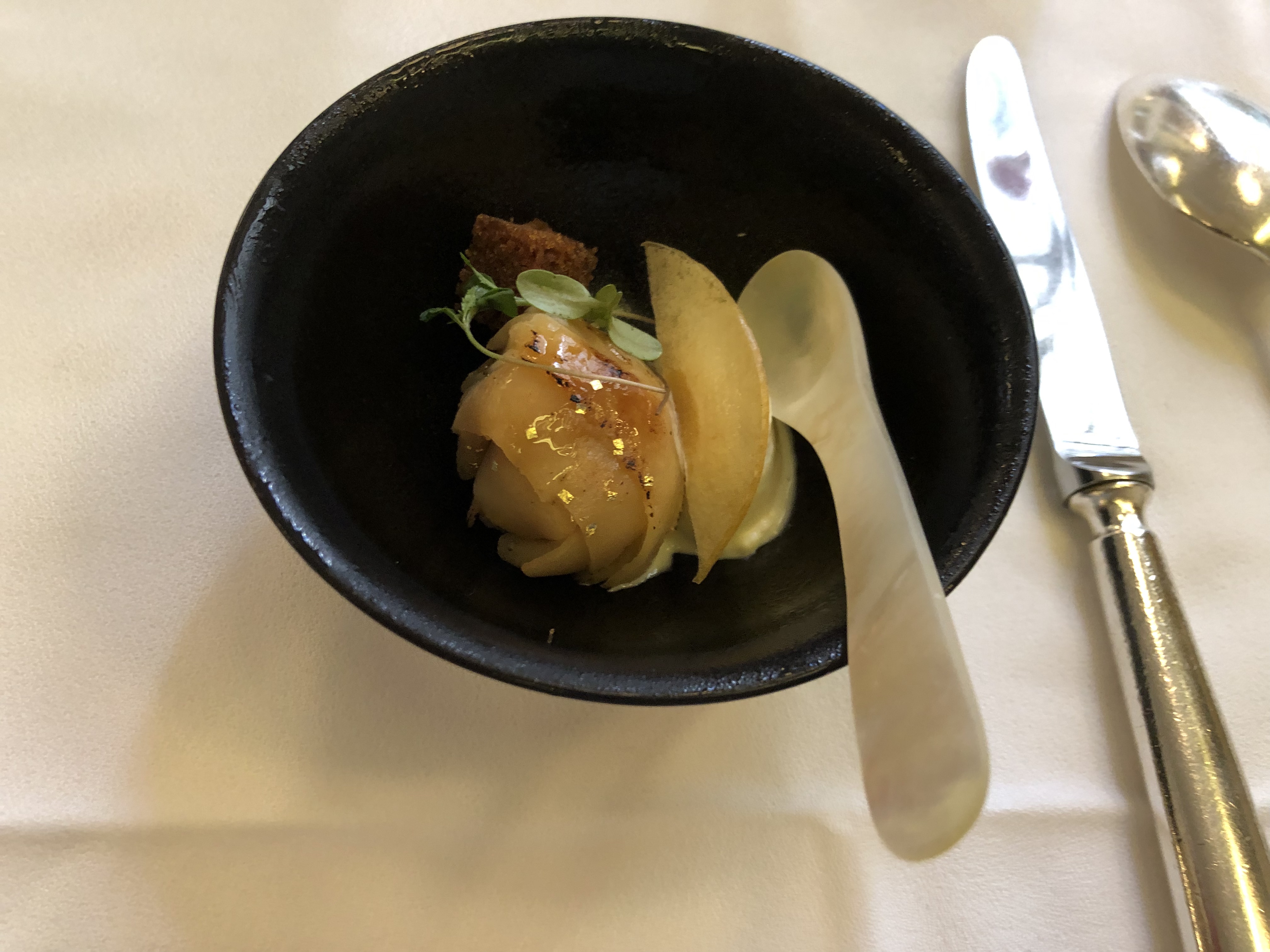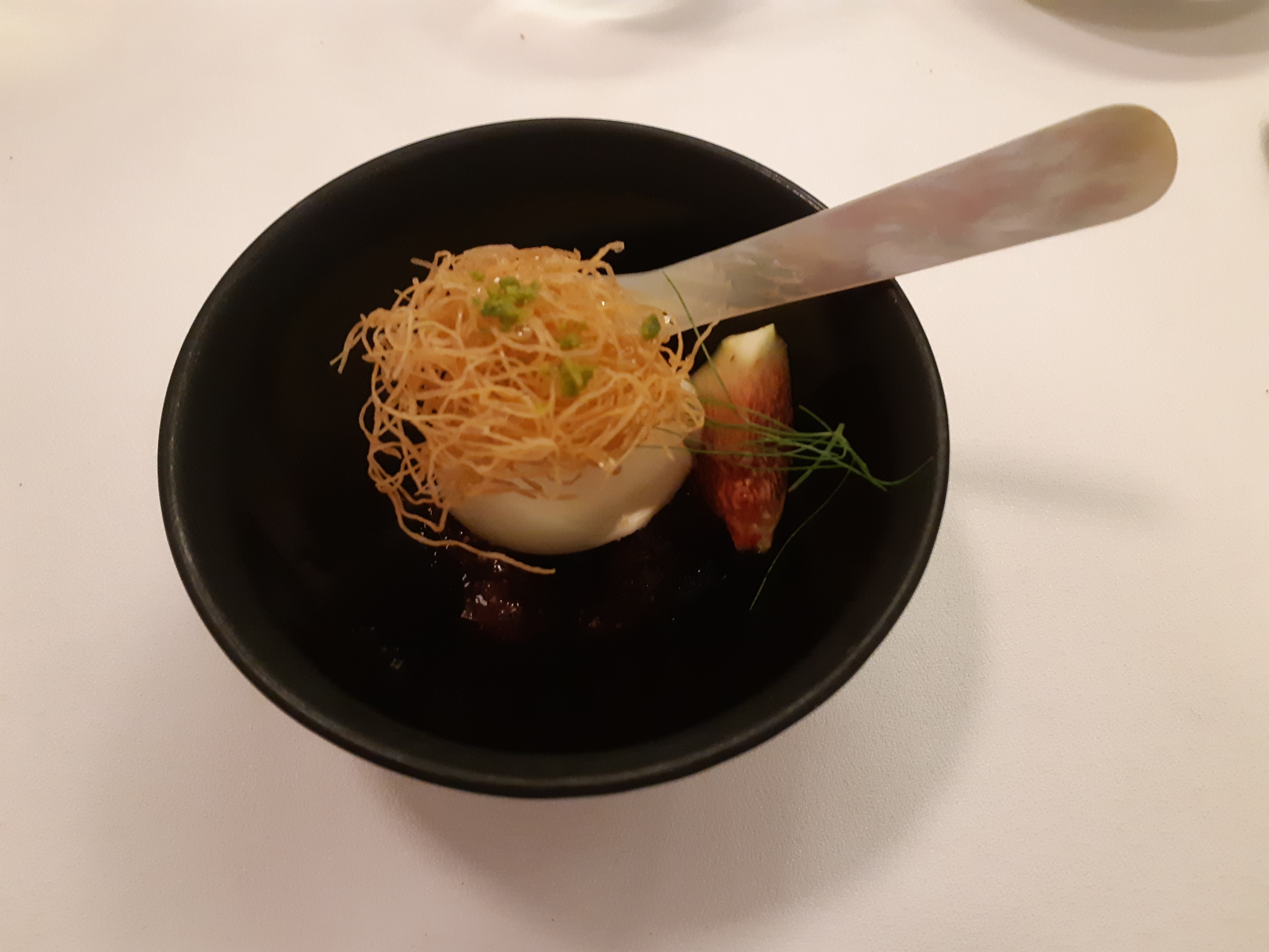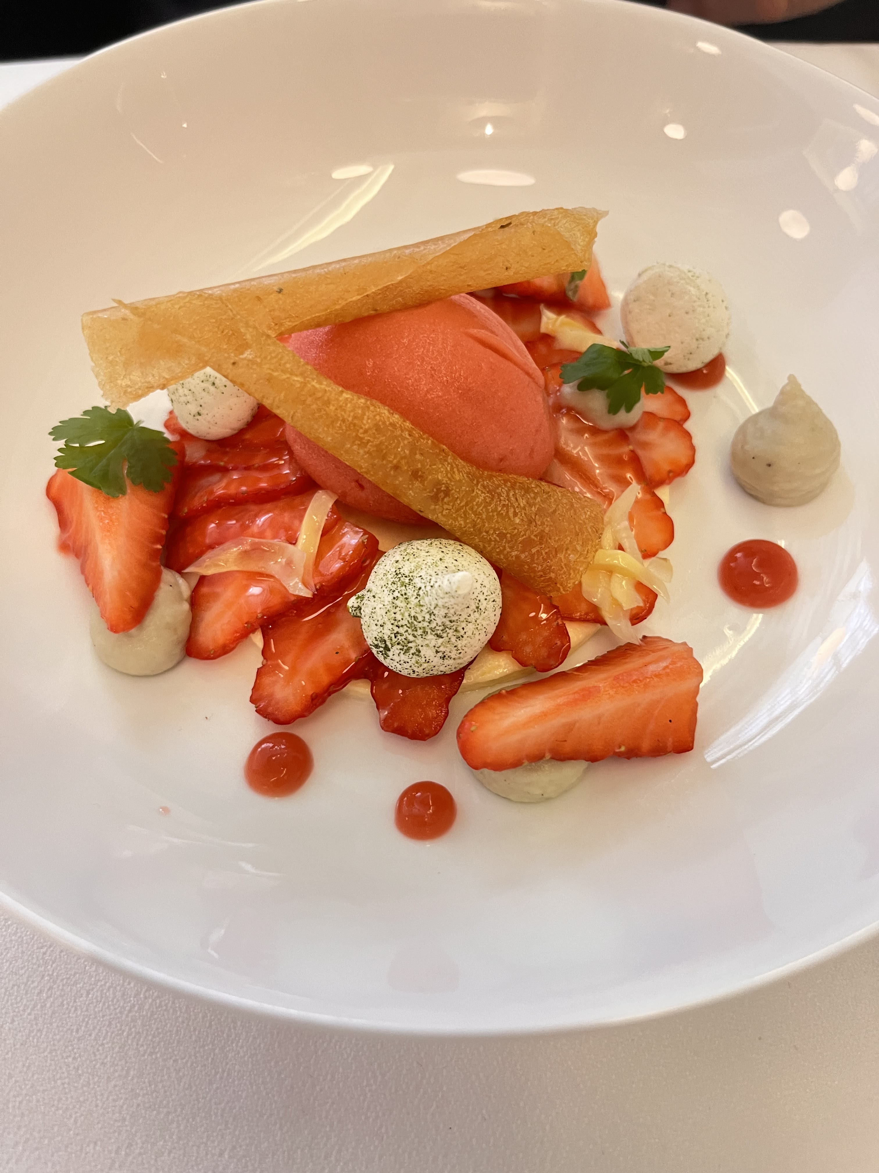 Expérience exceptionnelle !!! Tous les mets sont divins, fins et parfaitement équilibrés, sans exception. J'ai été bluffée par le mélange artichaut / foie gras, et également par le fraise / artichaut. Le soufflé aux pommes est d'une légèreté absolue. Mention spéciale à la sommelière, qui non seulement fait des accords mets et vins du tonerre (je ne suis toujours pas remise du Sancerre au nez de fruits exotiques et du cidre de glace) mais est tellement passionnée par son métier qu'elle en est passionnante et nous transporte dans son univers ! Ce repas était une pure merveille.
