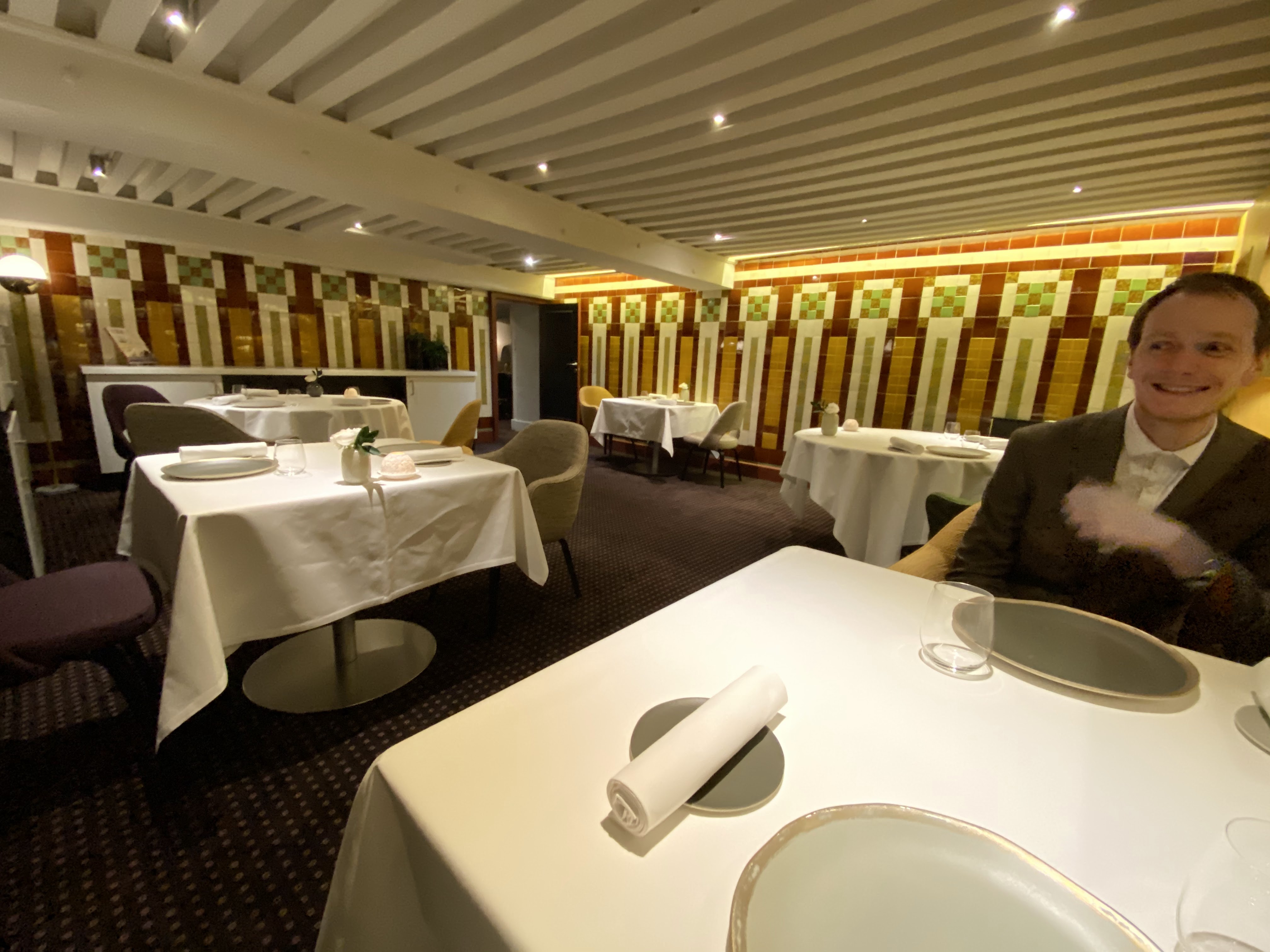 Ne vous y trompez pas avec les 4 étoiles — la grotte, les plats et le service étaient excellents. Nous avons particulièrement apprécié l'attention chaleureuse du personnel. Le moins d'une étoile est uniquement dû à nos sièges. Dans la salle à manger dans laquelle nous nous trouvions, il y avait deux tables d'angle rondes plus grandes et deux tables rectangulaires plus petites. L'un des rectangles se trouvait au milieu de la pièce, à côté du passage menant à l'autre salle à manger. Toutes ces tables peuvent accueillir chacune 2 personnes. Nous étions assis au milieu, une petite table rectangulaire. Lorsque le personnel passait, le sol rebondissait légèrement et nous aussi :) Je comprends que le restaurant dispose d'un système pour asseoir les invités. Mais j’aurais apprécié qu’on me donne une option ; peut-être aurait-on pu me dire que ces tables rectangulaires étaient les seules disponibles ; alors j'aurais choisi un autre soir pour m'asseoir à l'une des tables du coin. En termes simples, l'aspect physique aurait dû compléter notre merveilleux repas à La Mère Brazier.